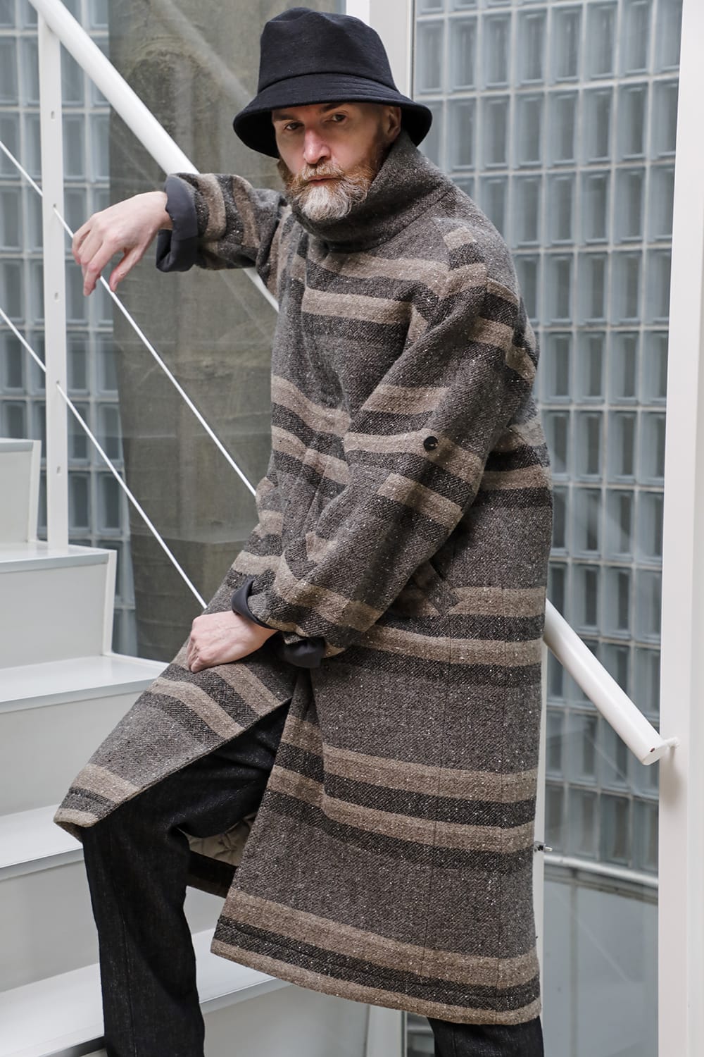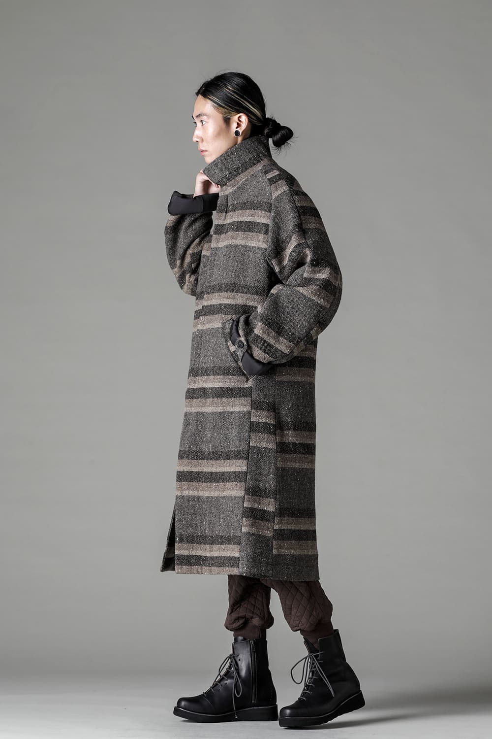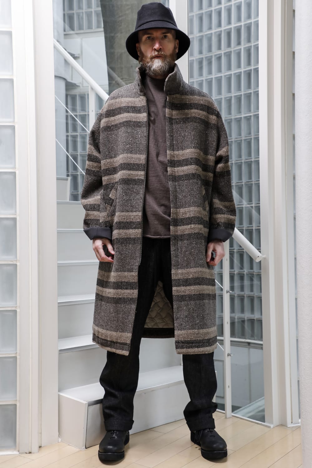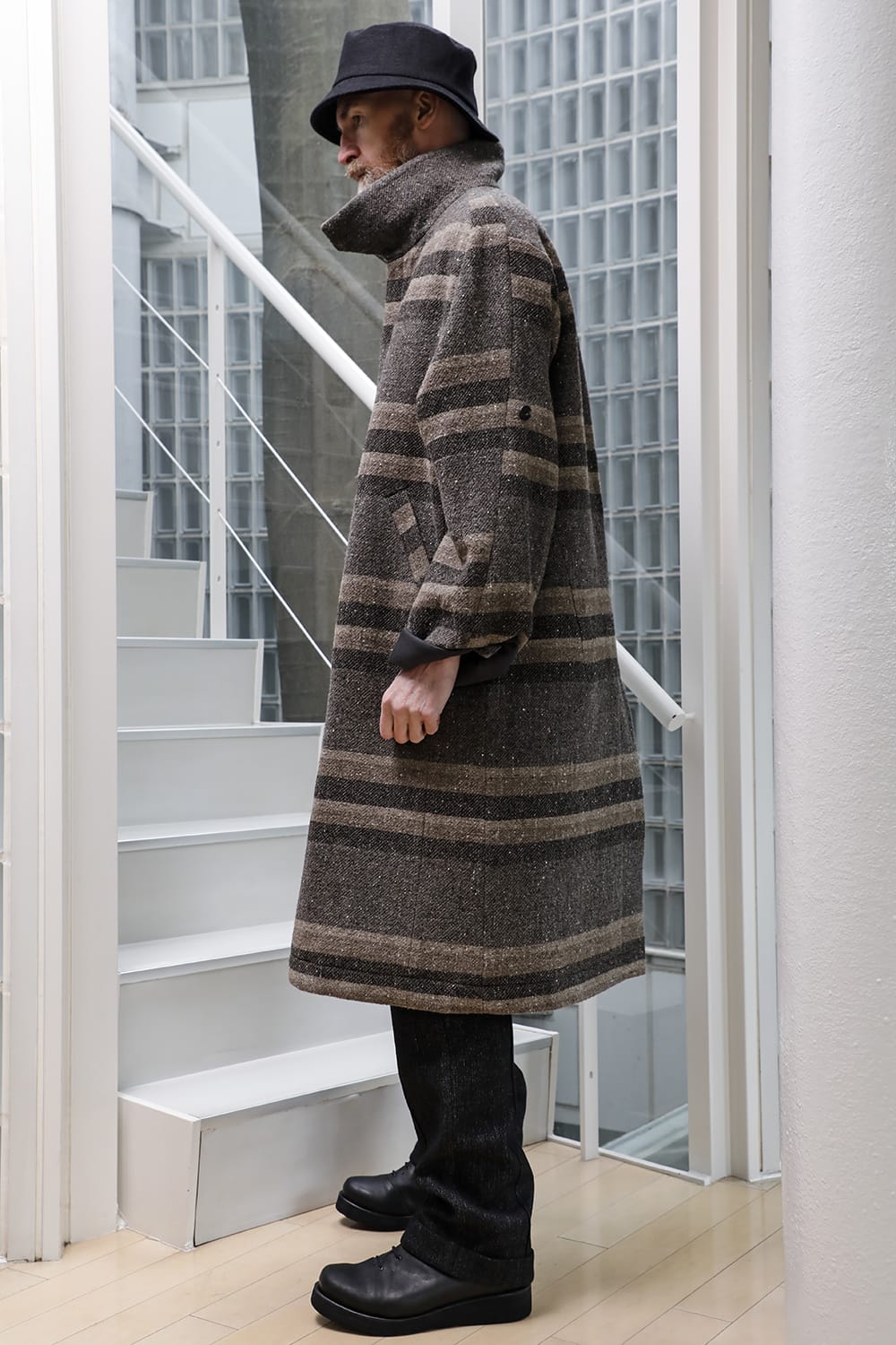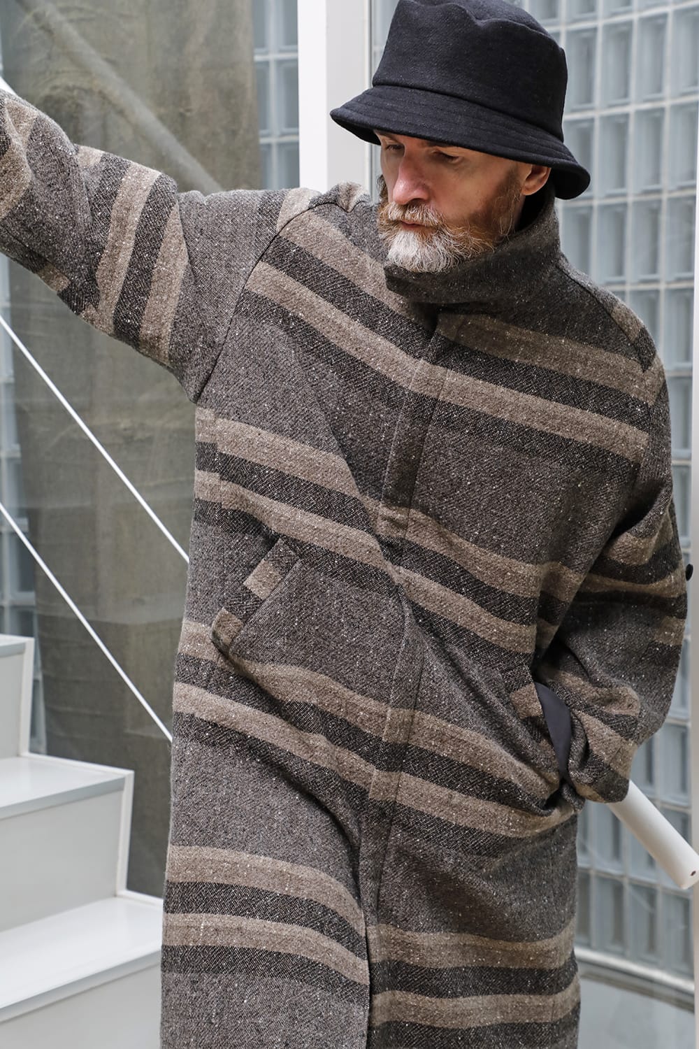 オーバーコートのようなルーズフィットシルエットで制作したハイネックコート。