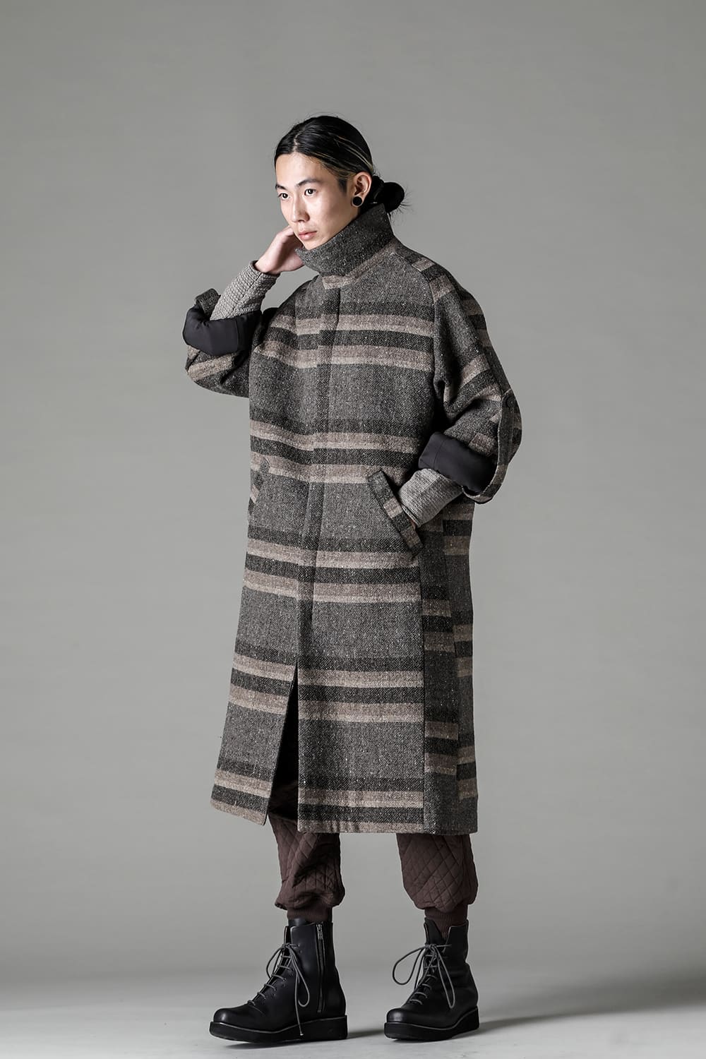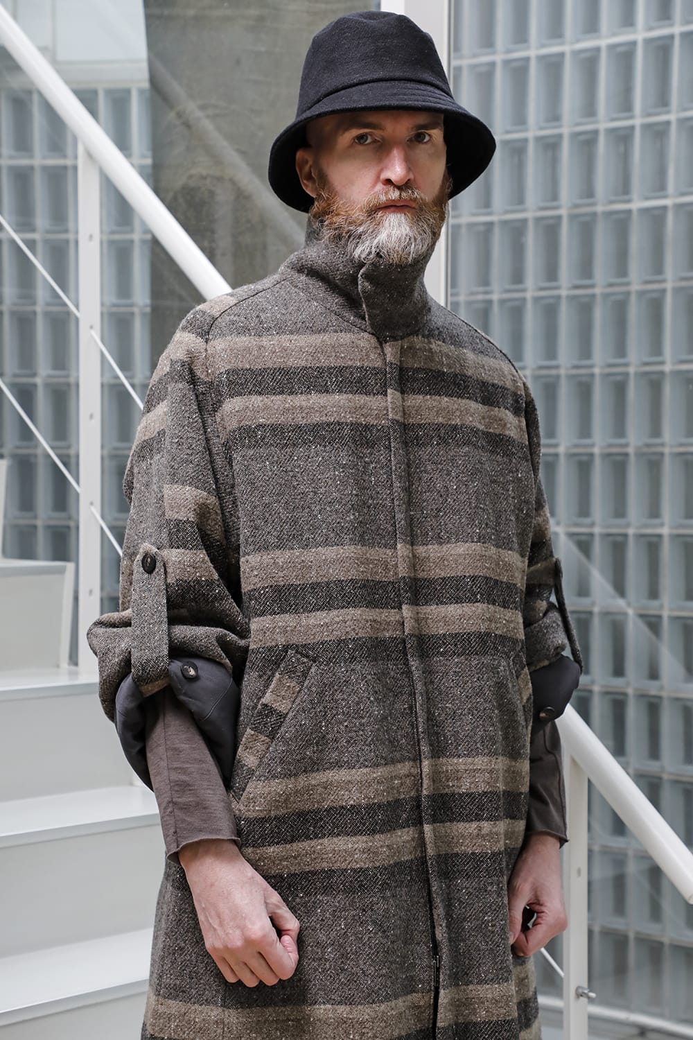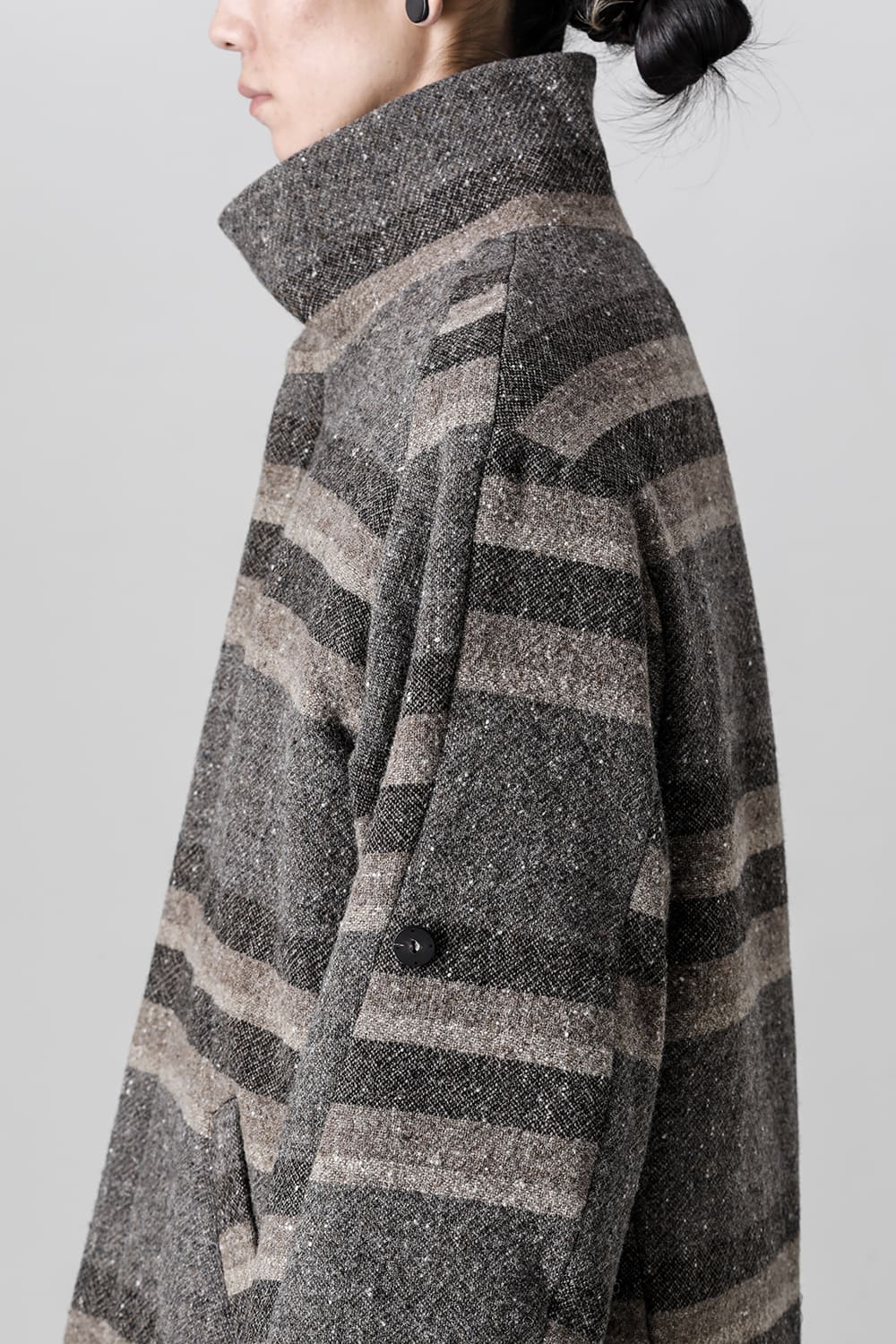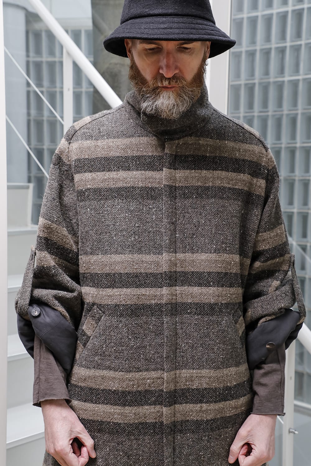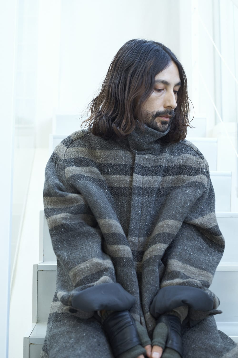 オーバーコートのようなルーズフィットシルエットで制作したハイネックコート。