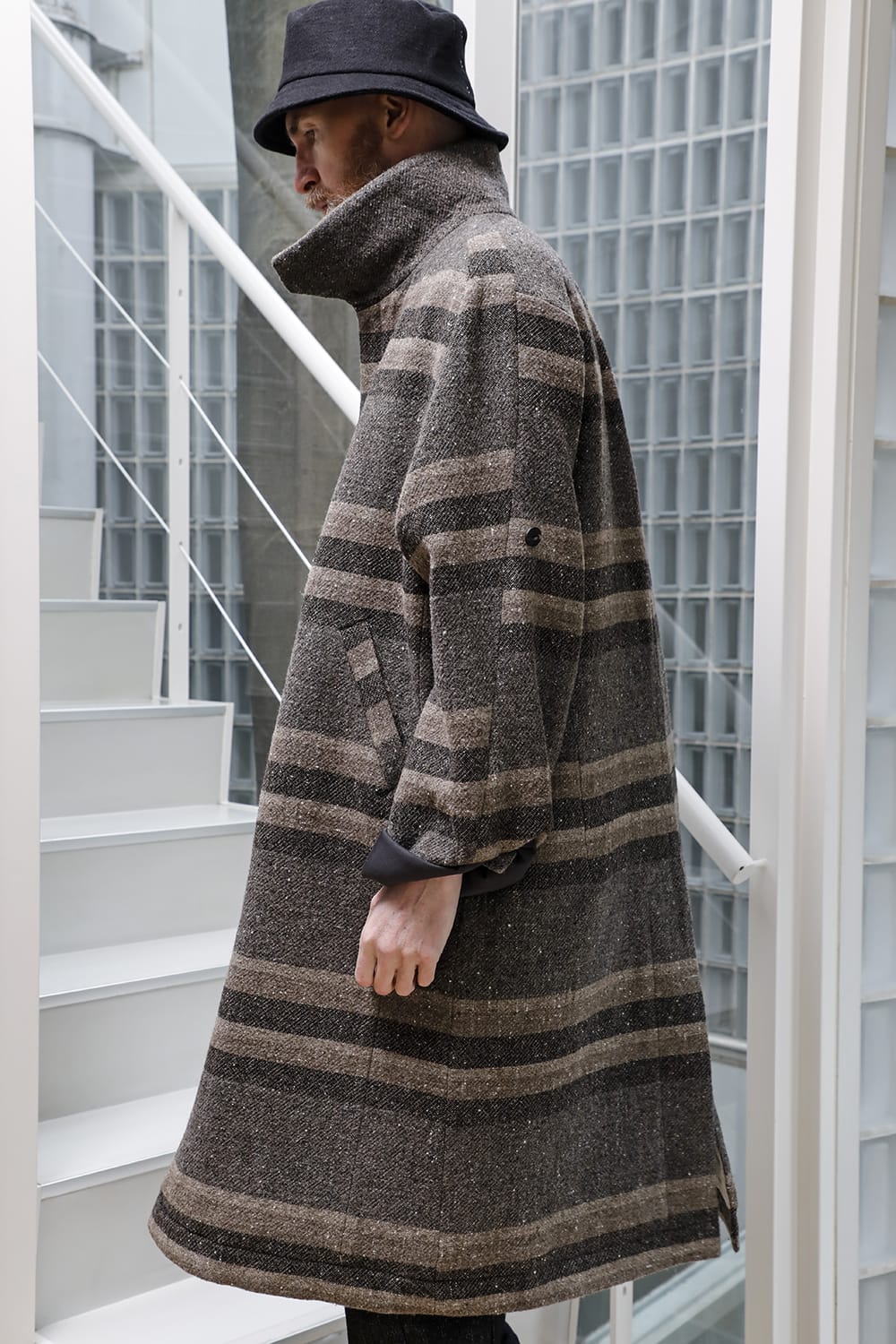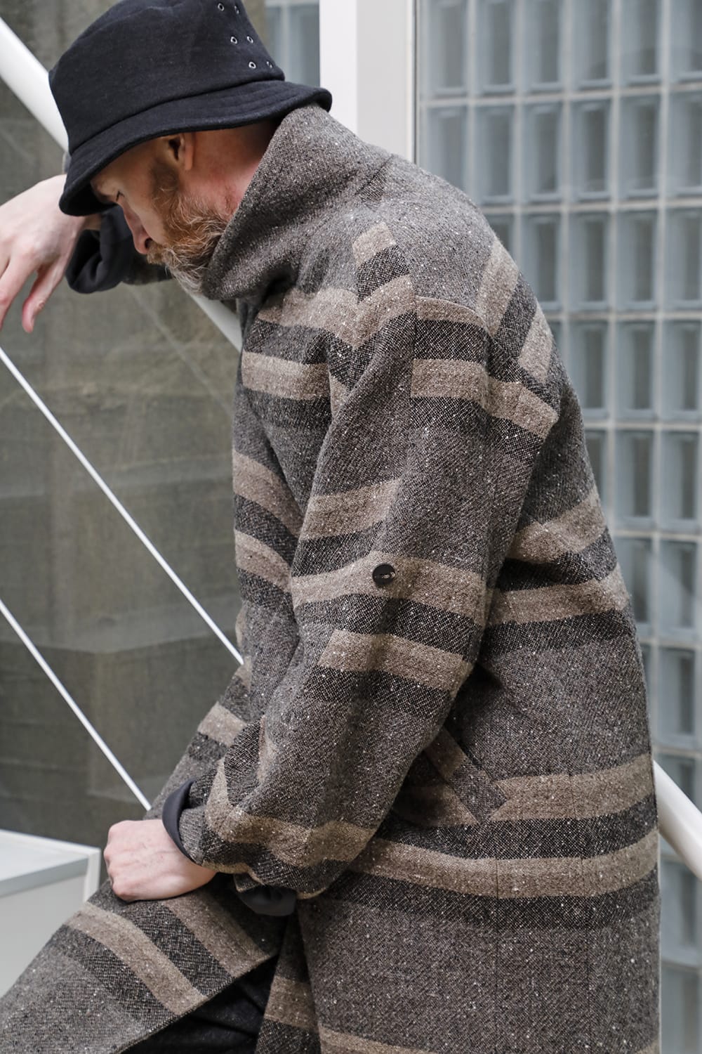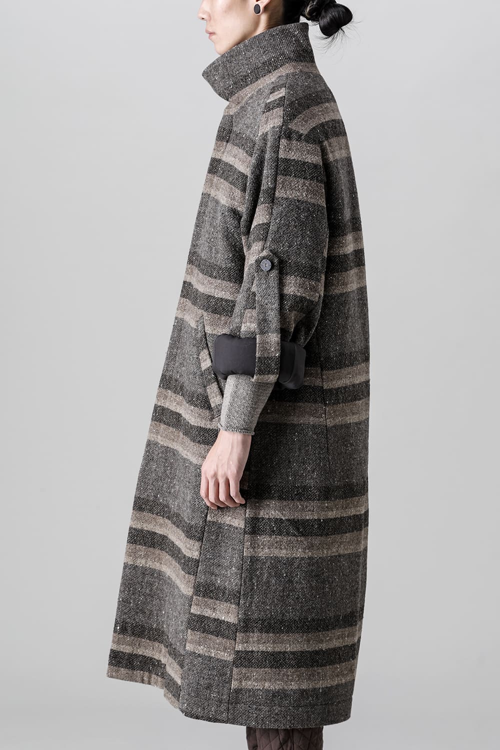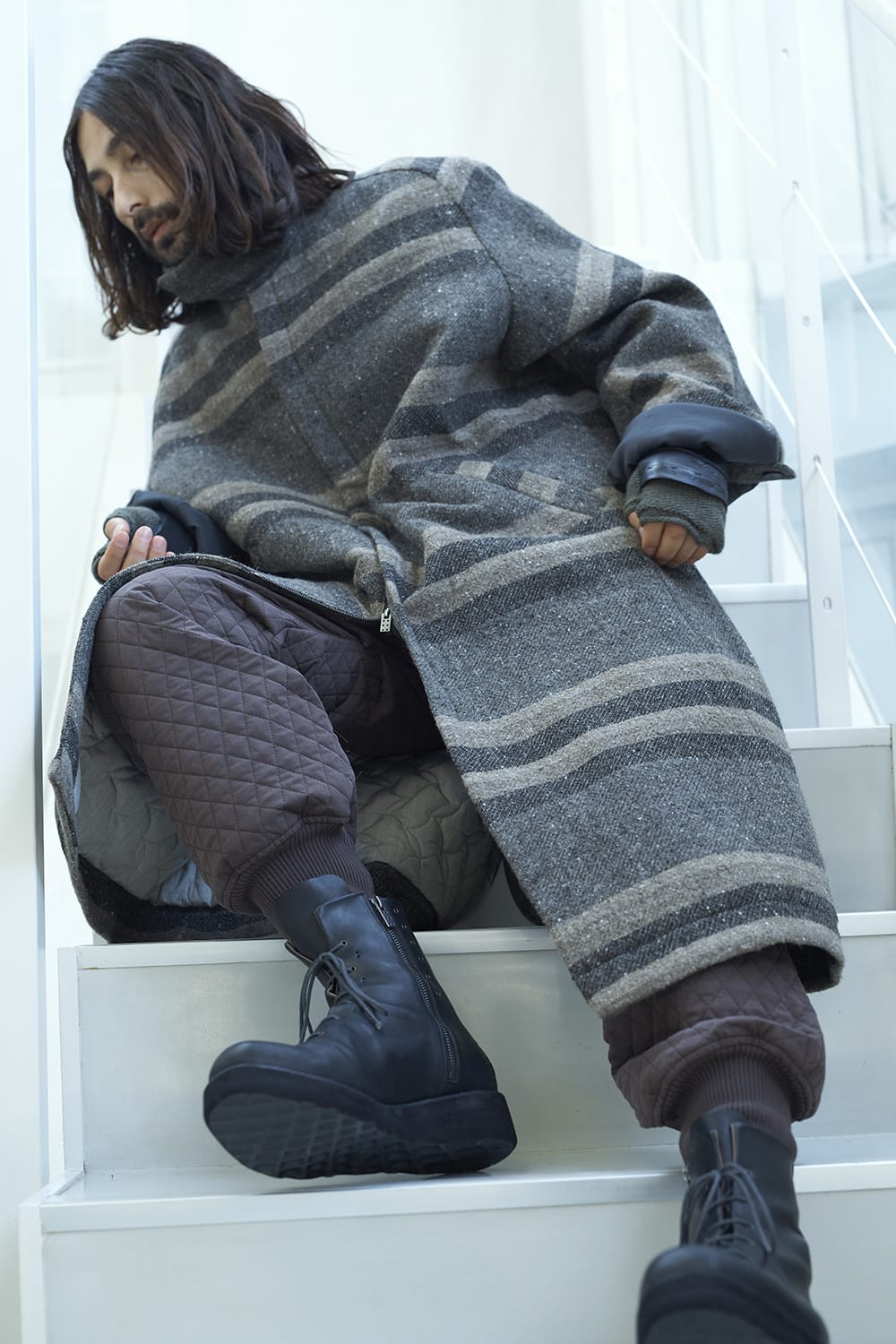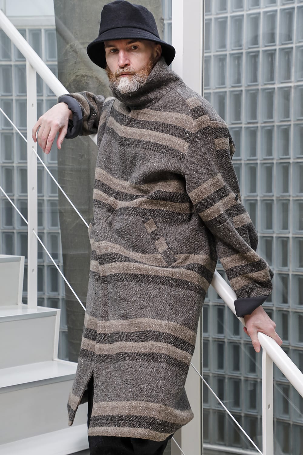 オーバーコートのようなルーズフィットシルエットで制作したハイネックコート。
