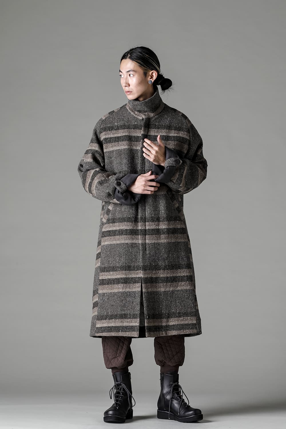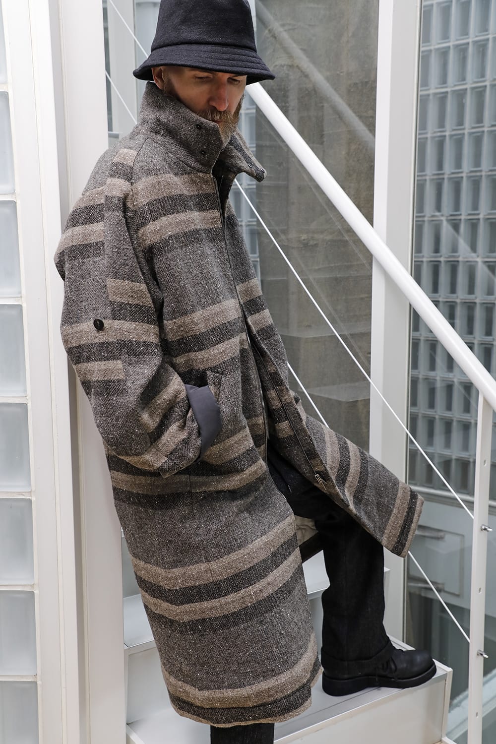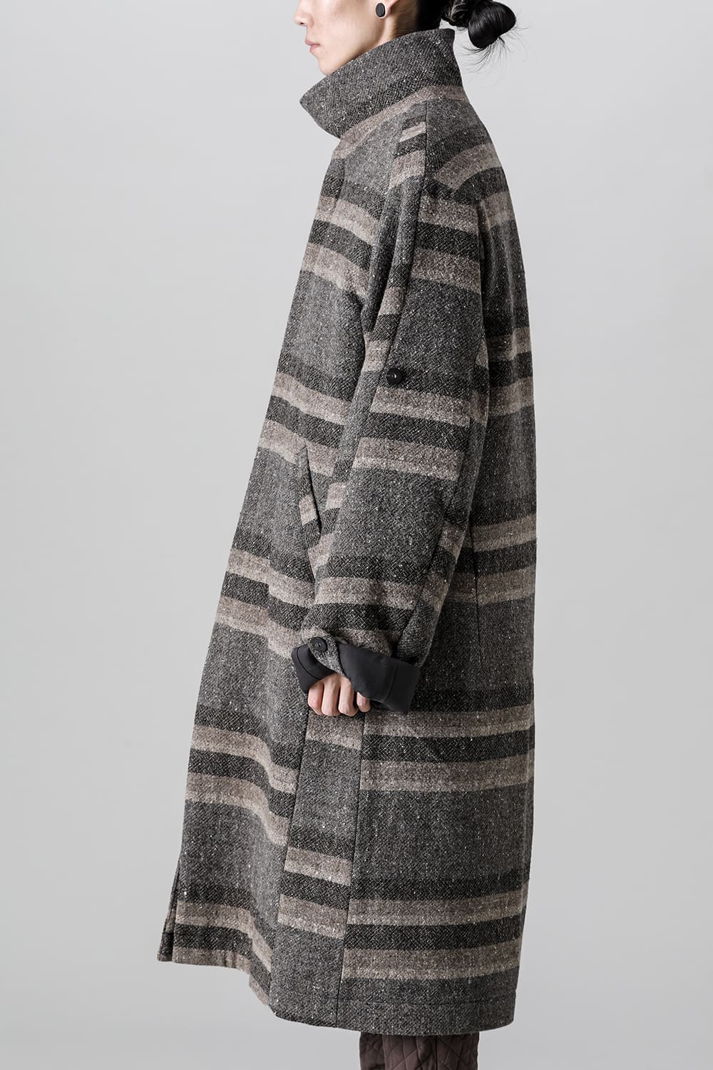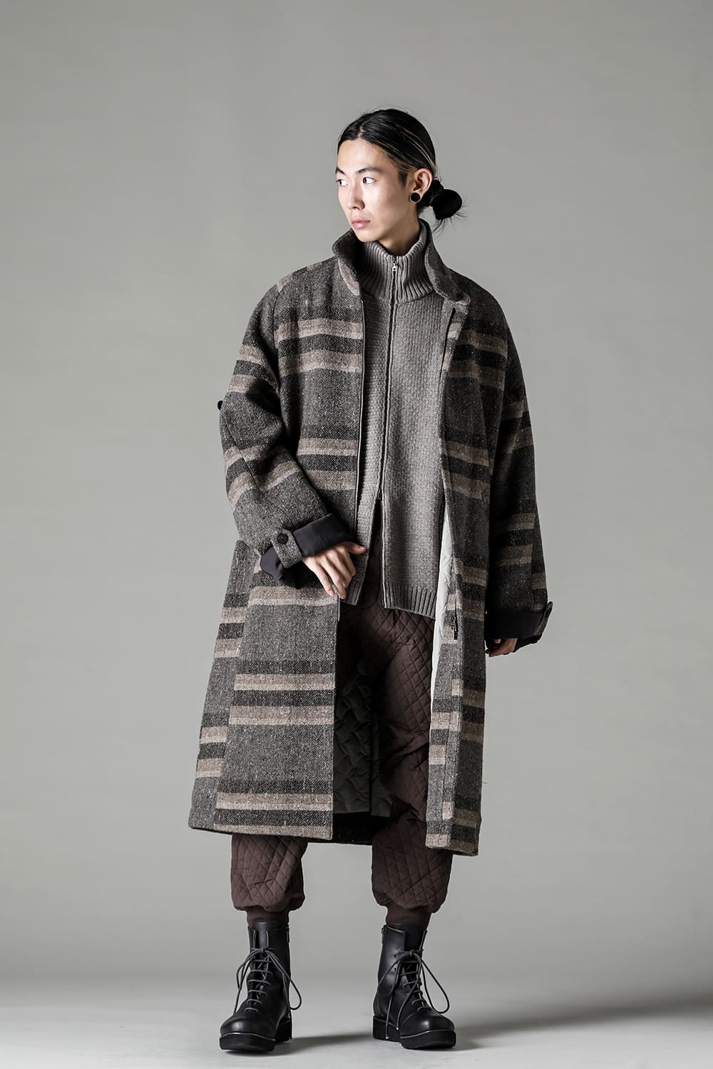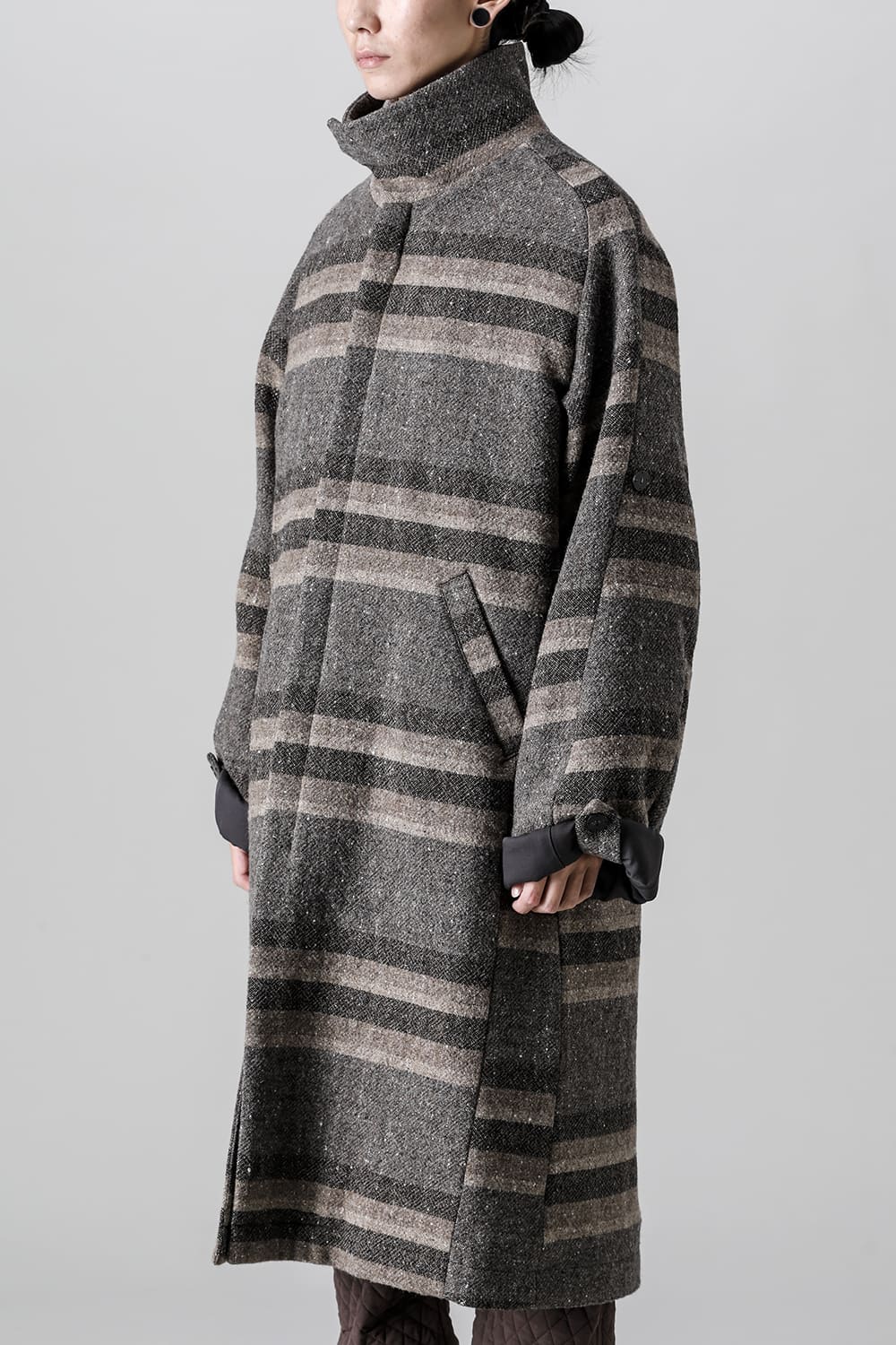 オーバーコートのようなルーズフィットシルエットで制作したハイネックコート。