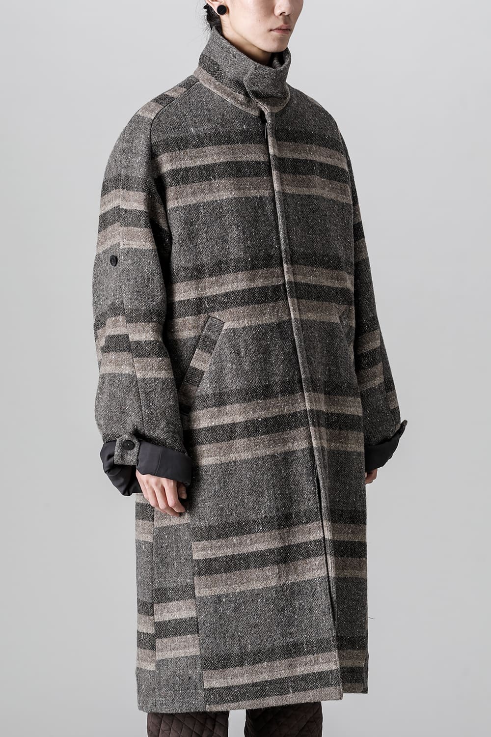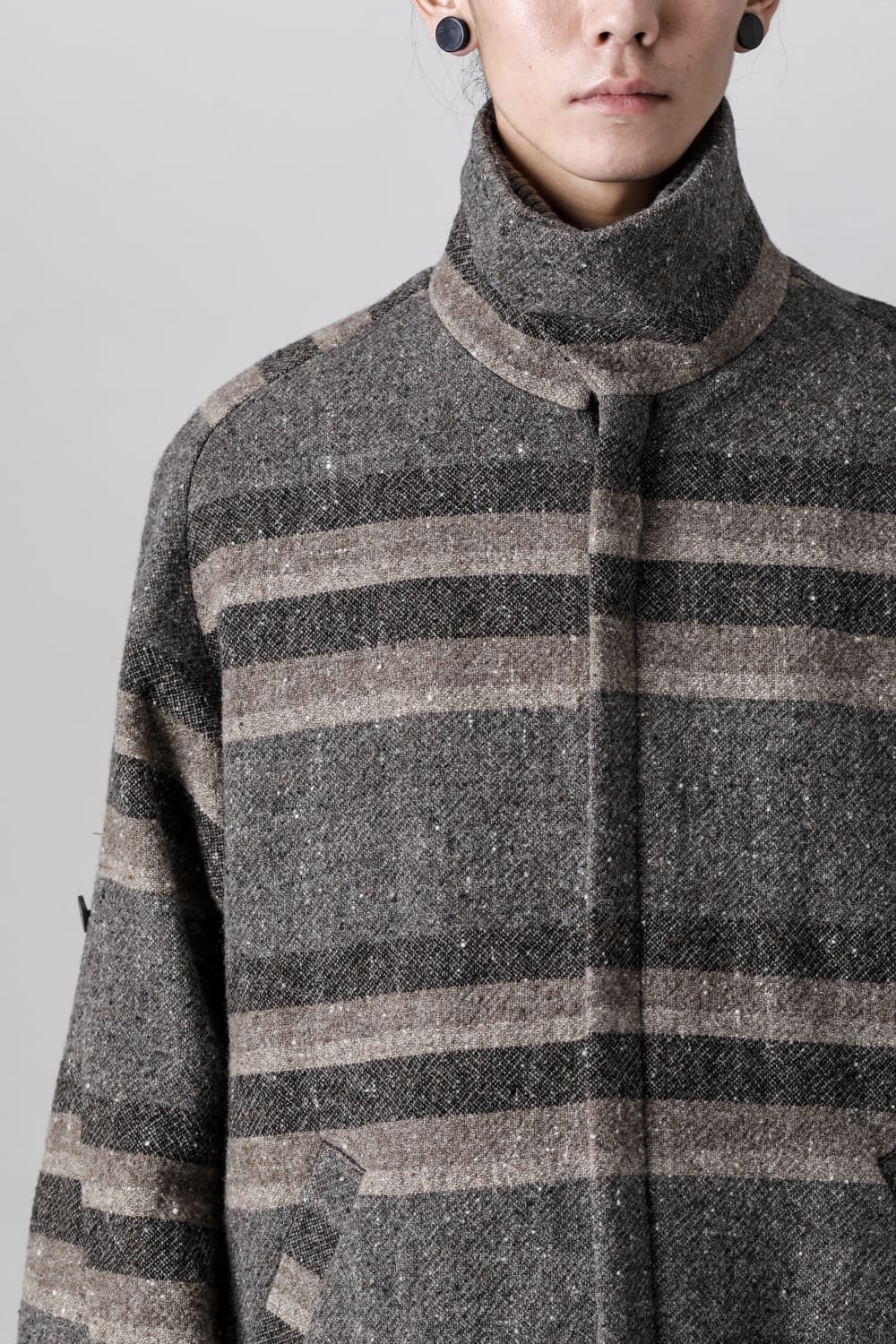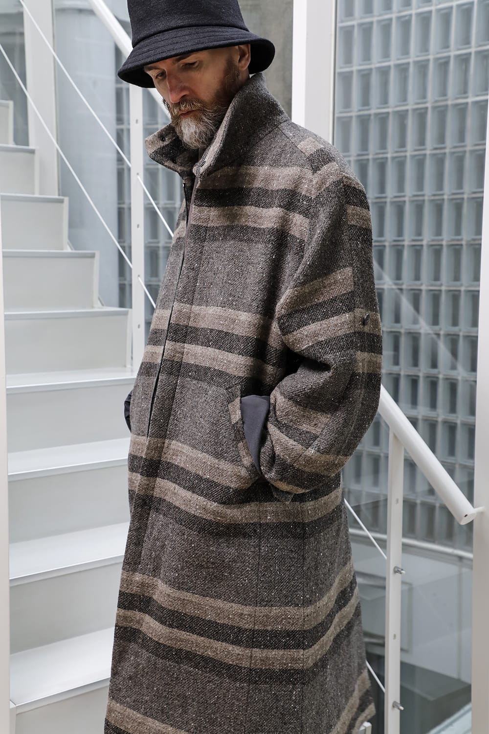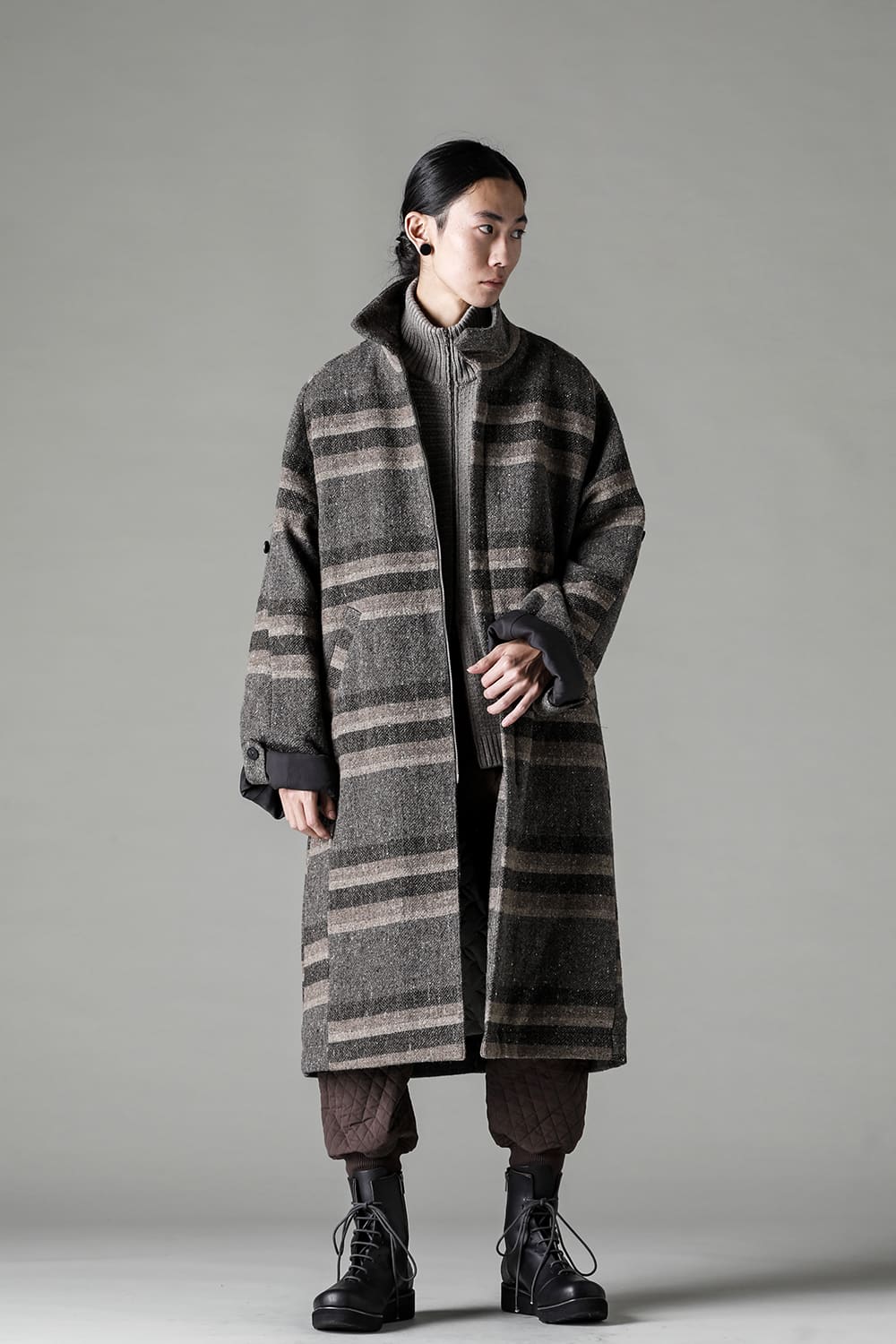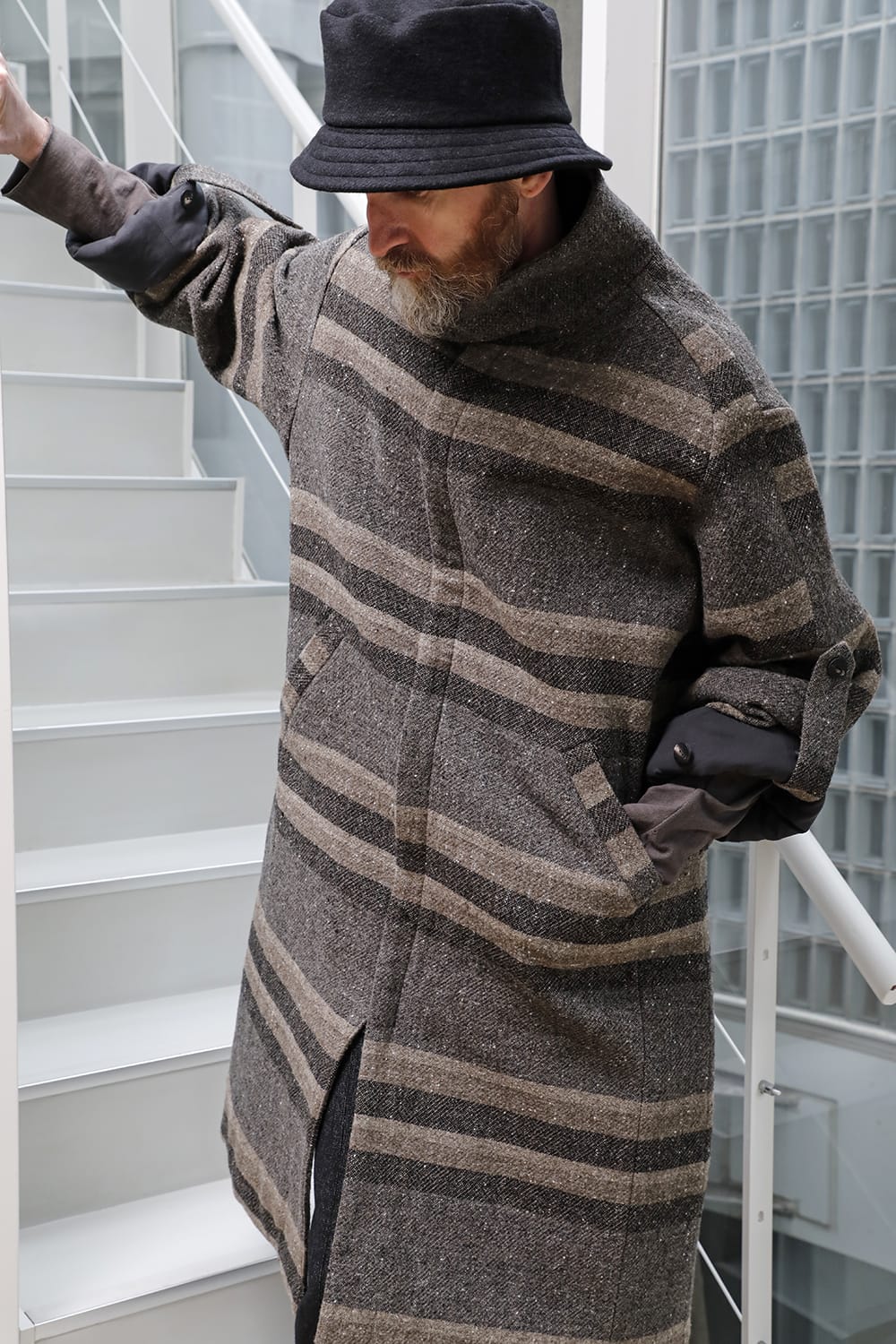 オーバーコートのようなルーズフィットシルエットで制作したハイネックコート。