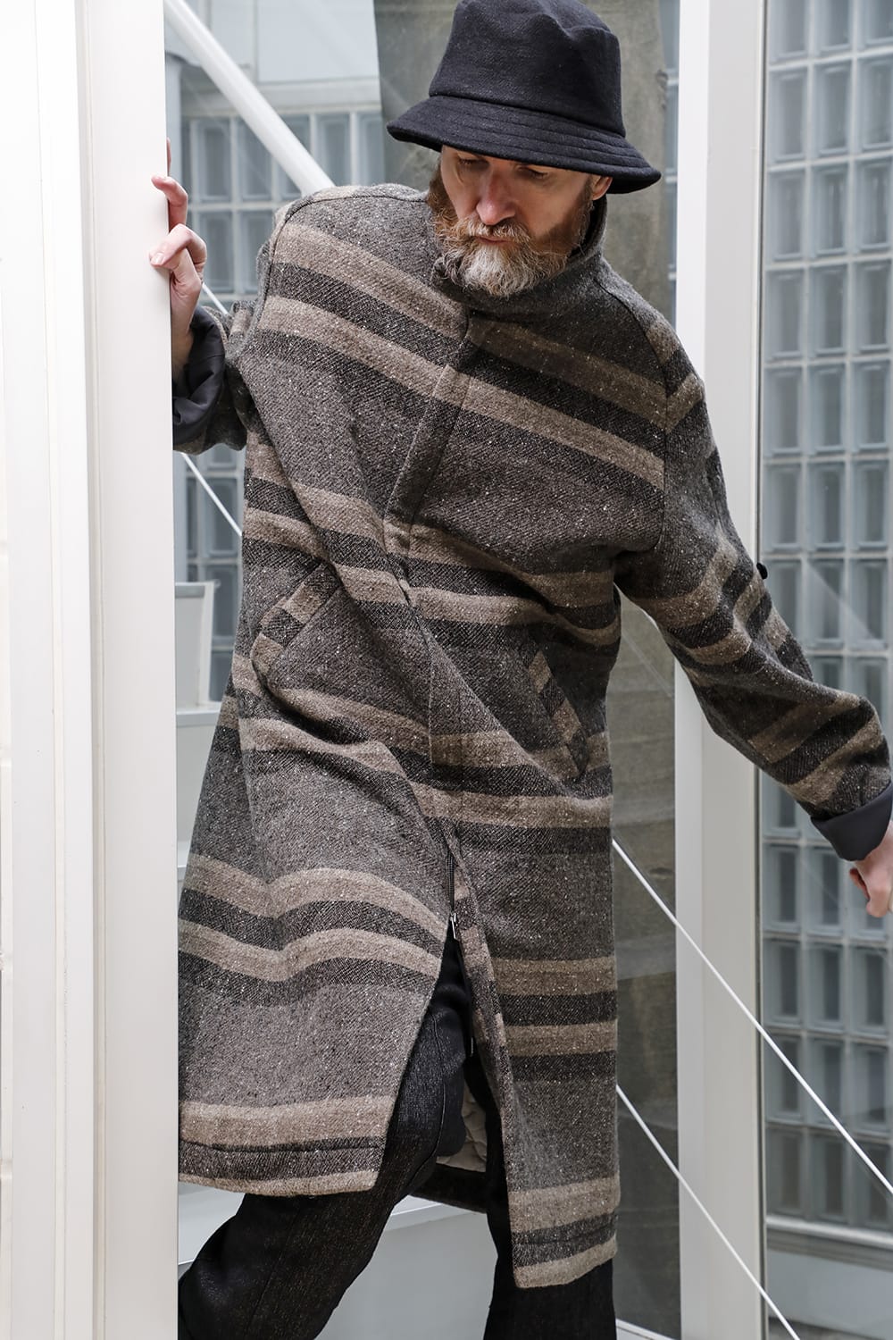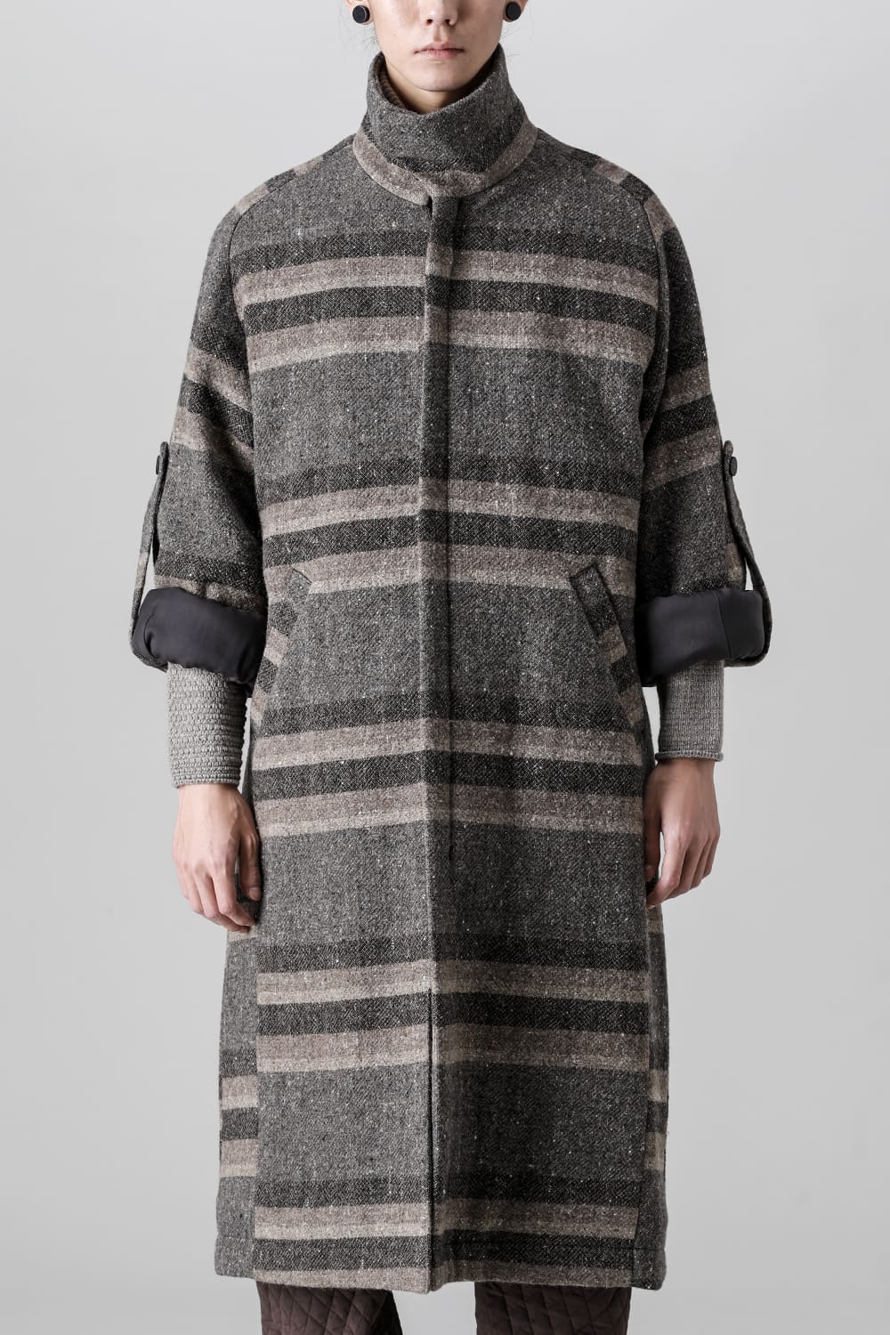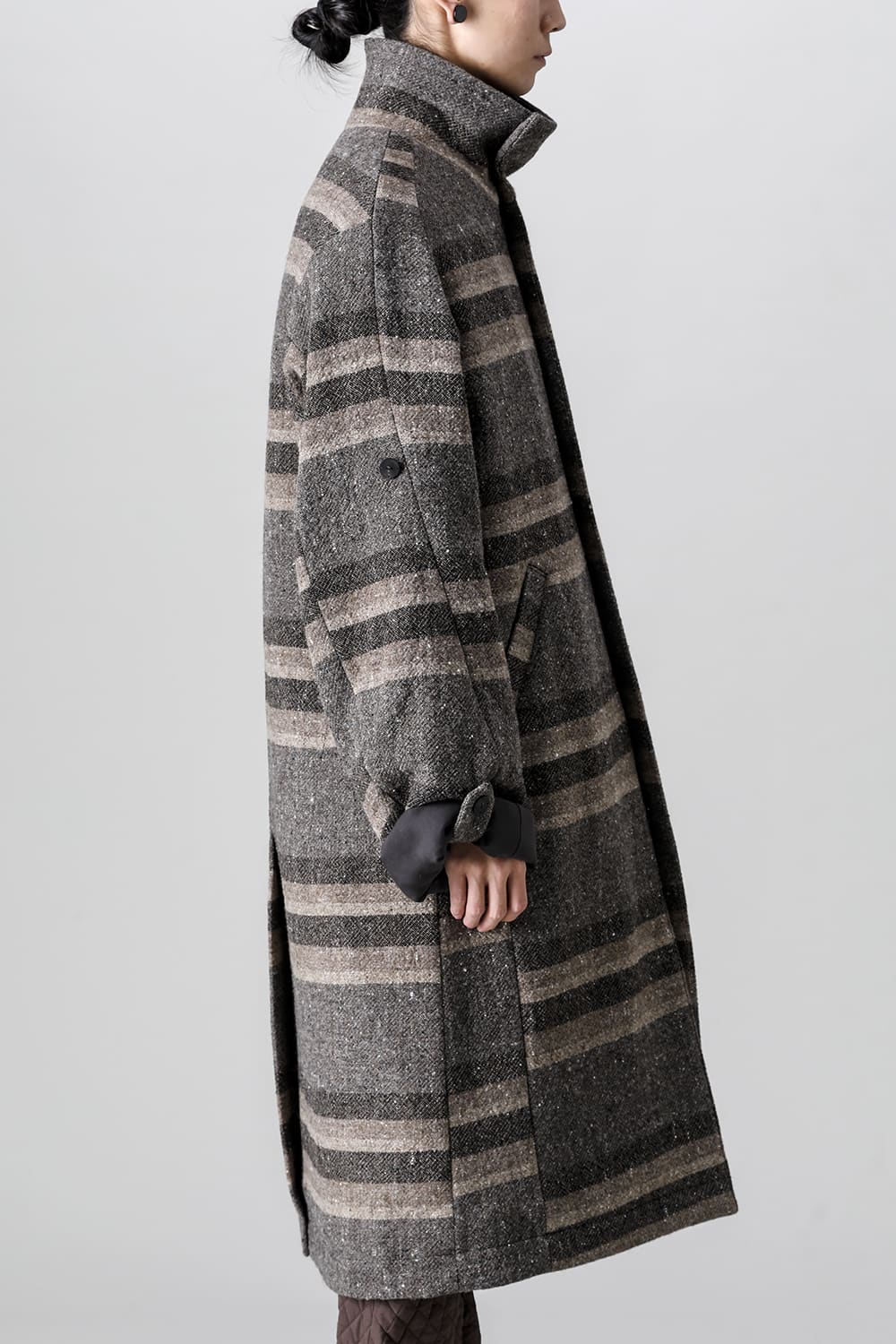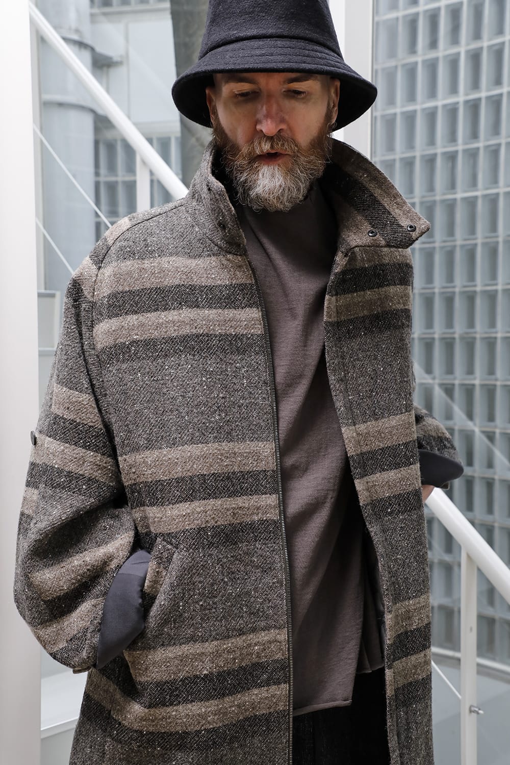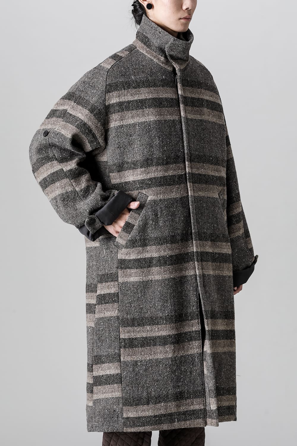 オーバーコートのようなルーズフィットシルエットで制作したハイネックコート。