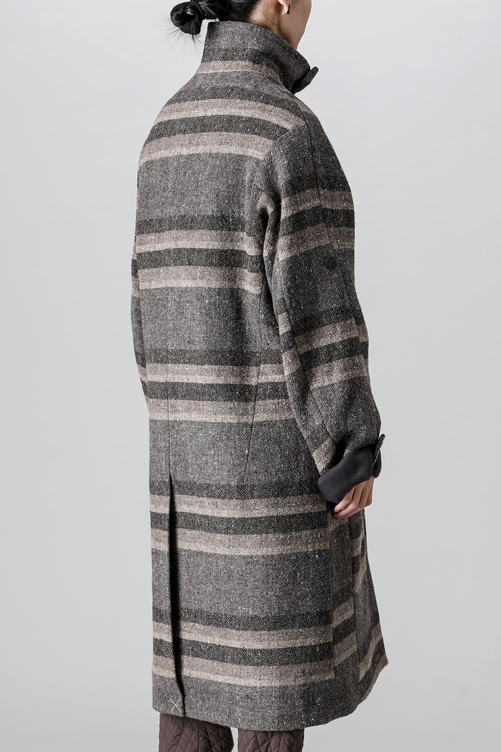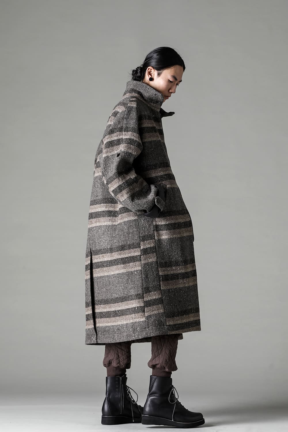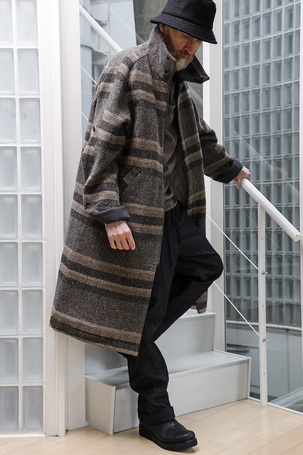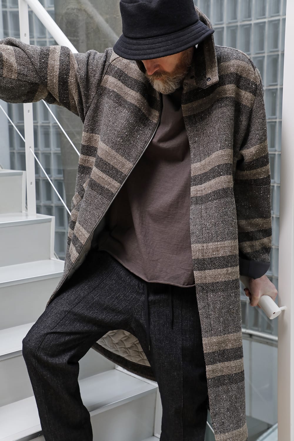 オーバーコートのようなルーズフィットシルエットで制作したハイネックコート。