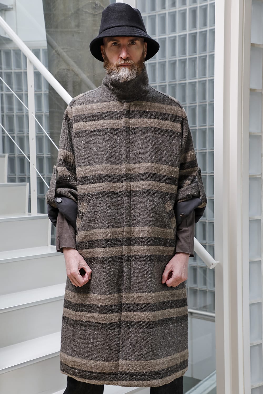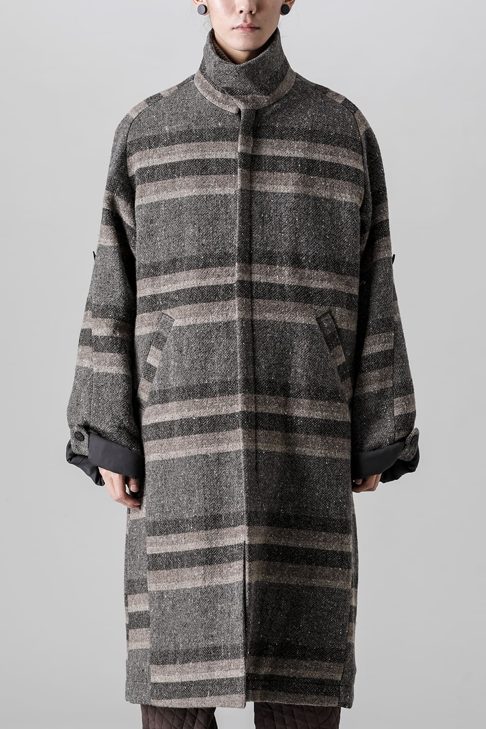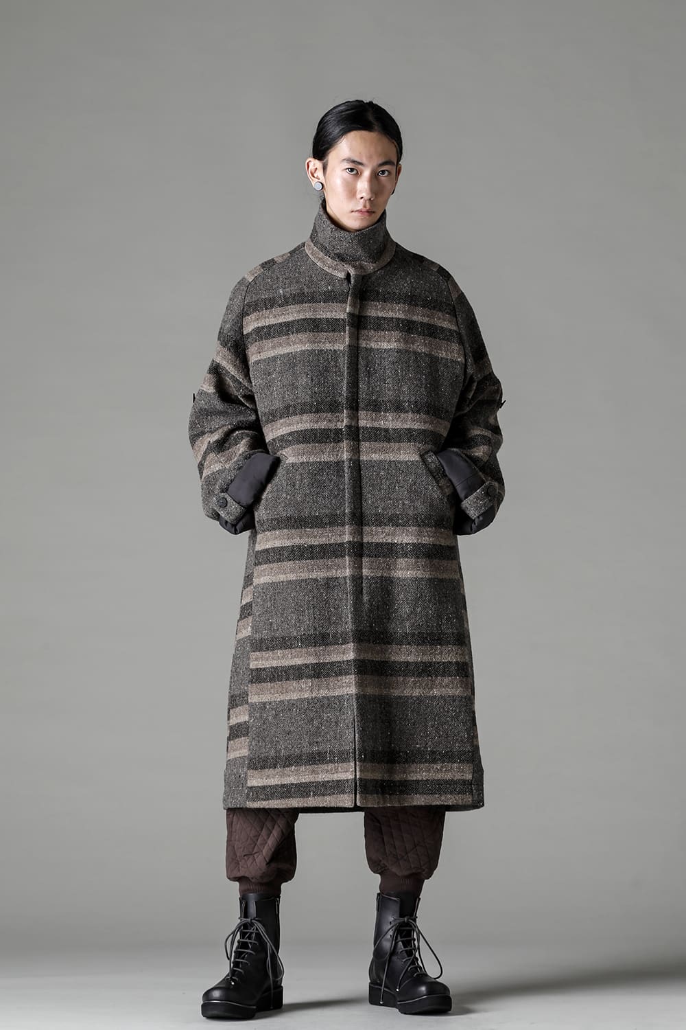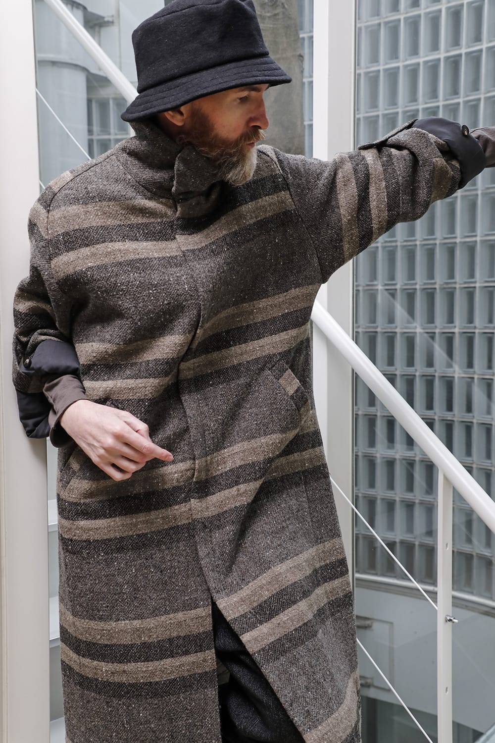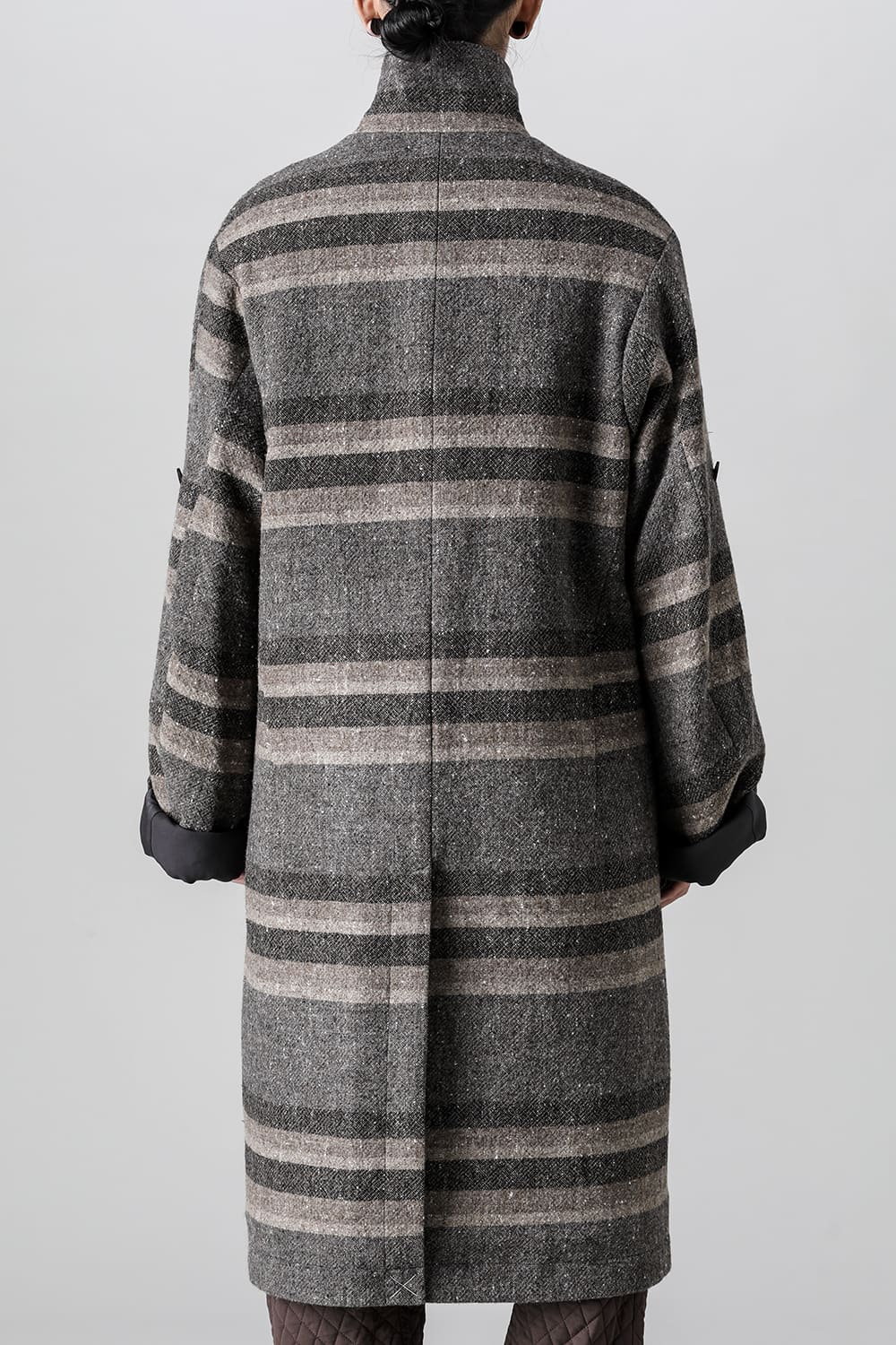 オーバーコートのようなルーズフィットシルエットで制作したハイネックコート。