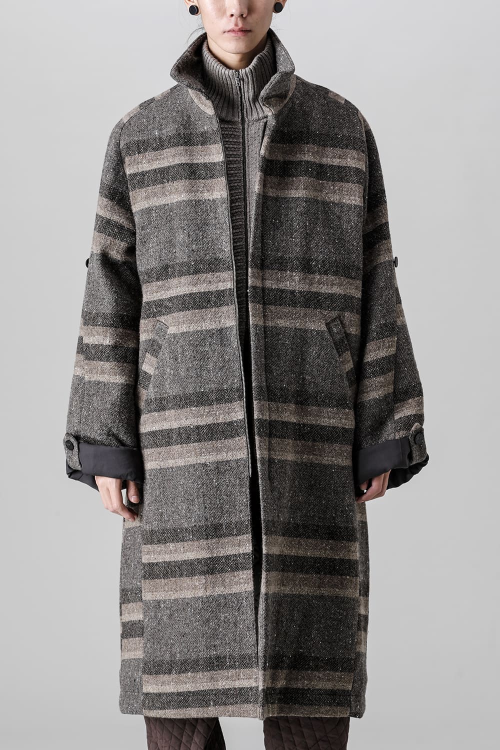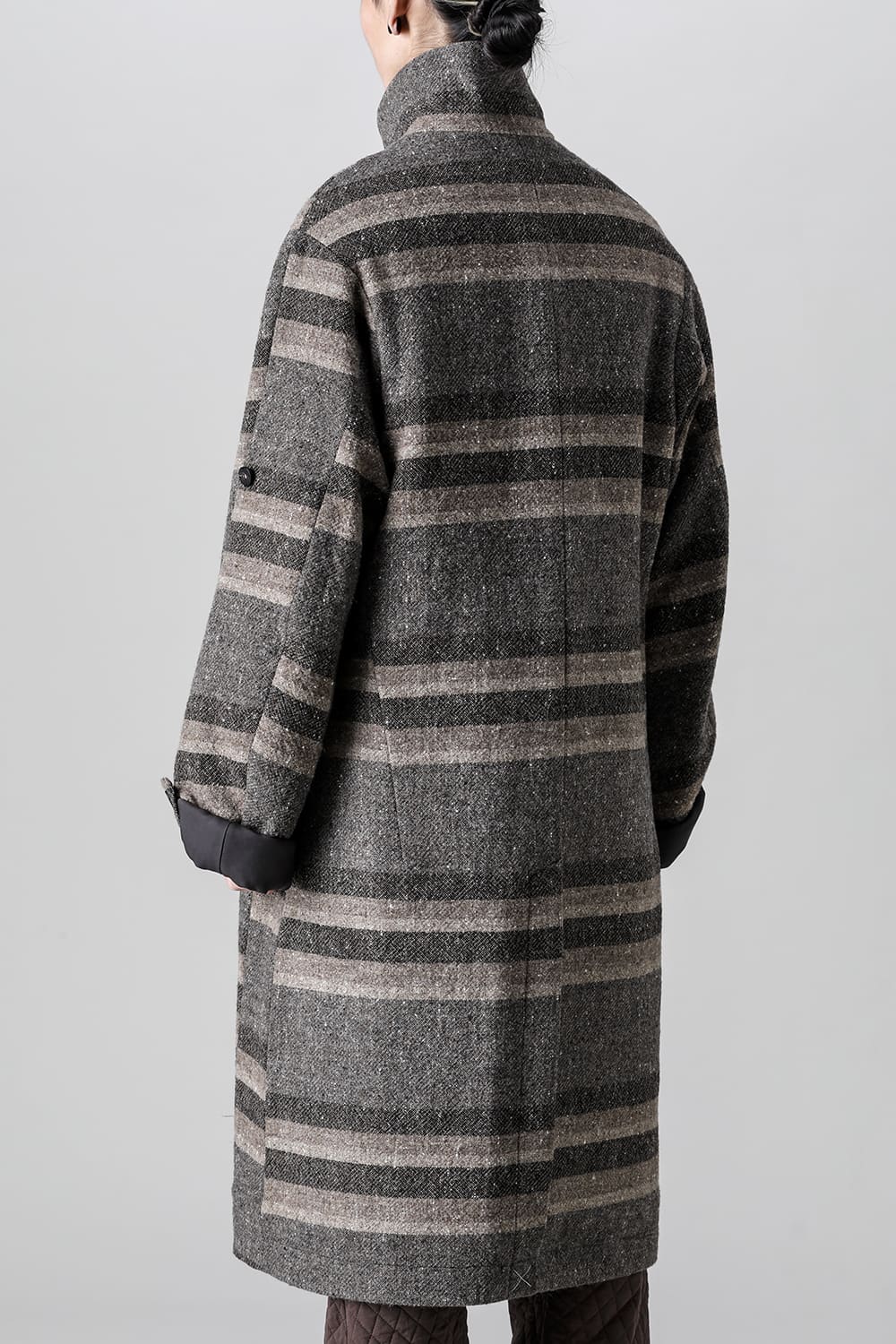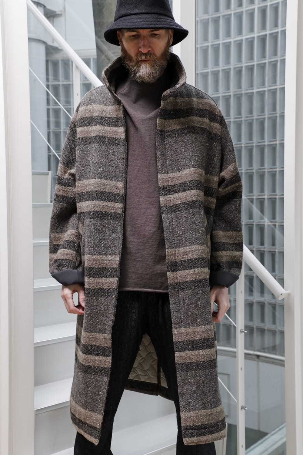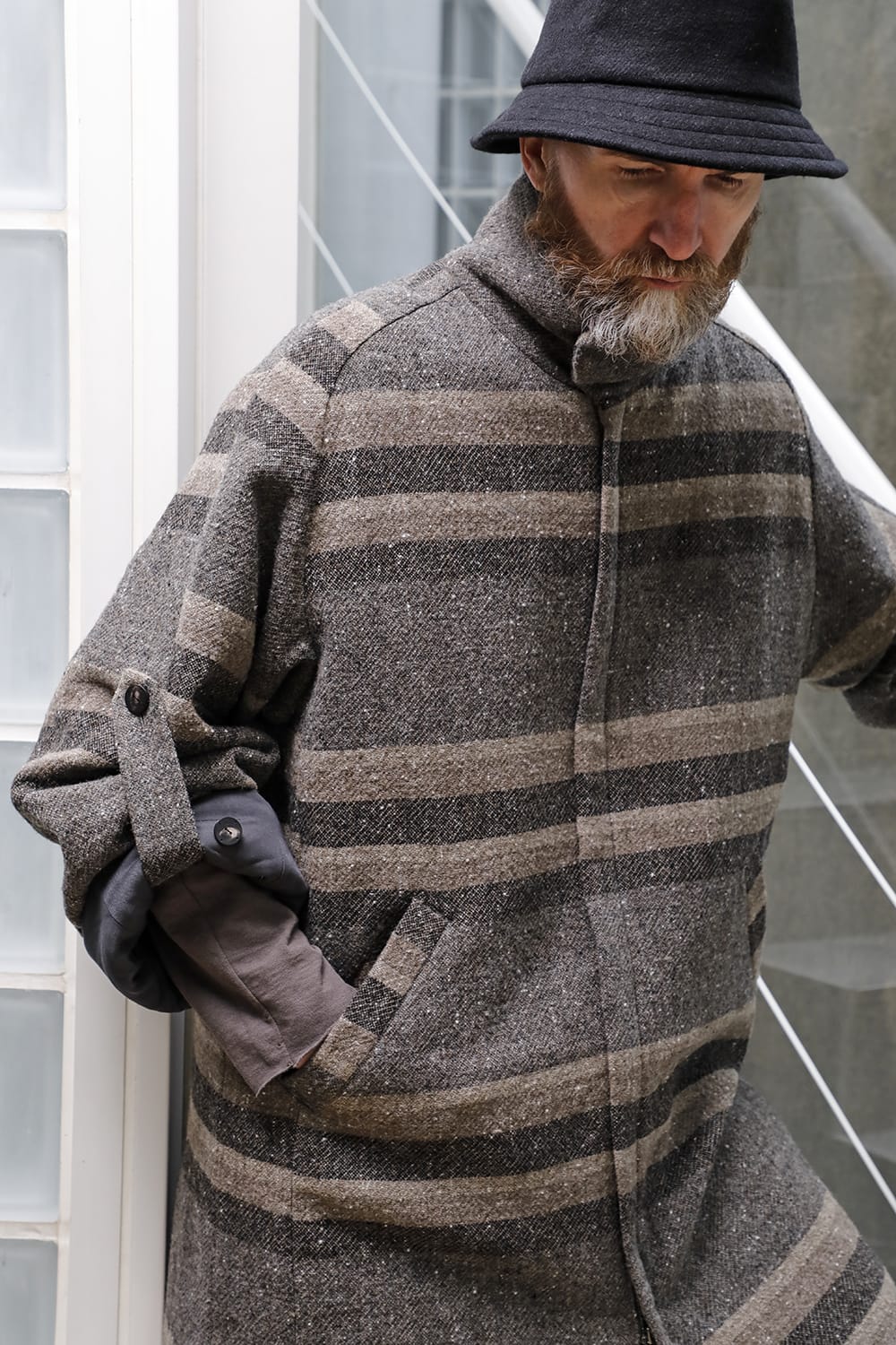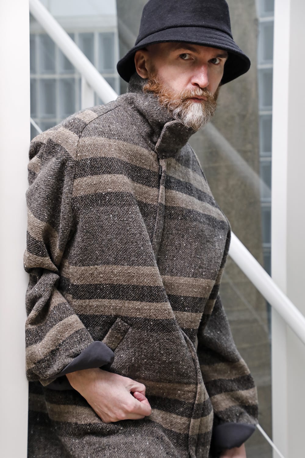 オーバーコートのようなルーズフィットシルエットで制作したハイネックコート。