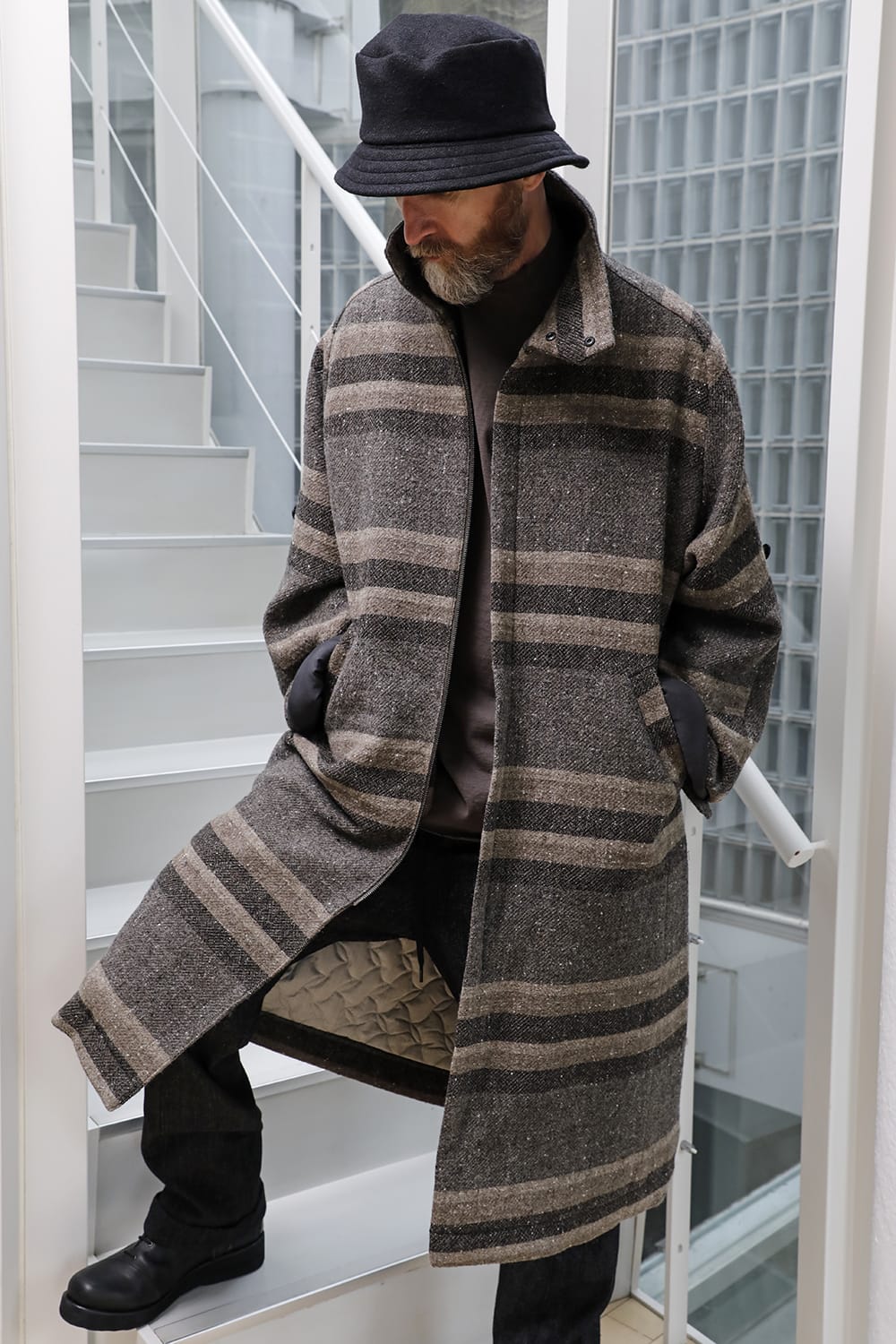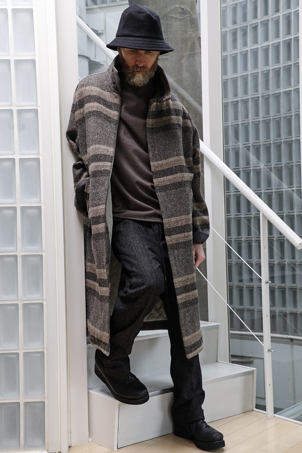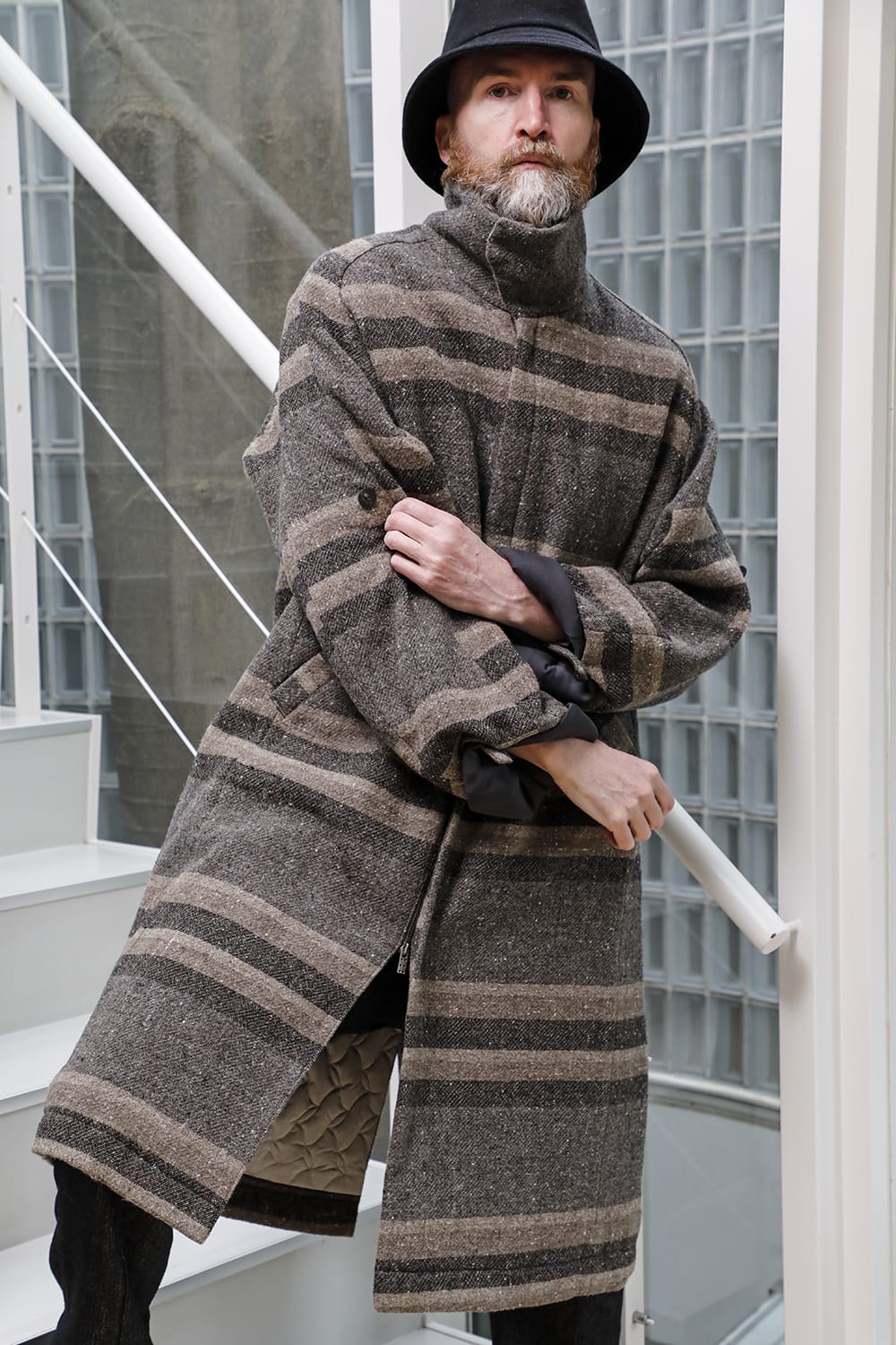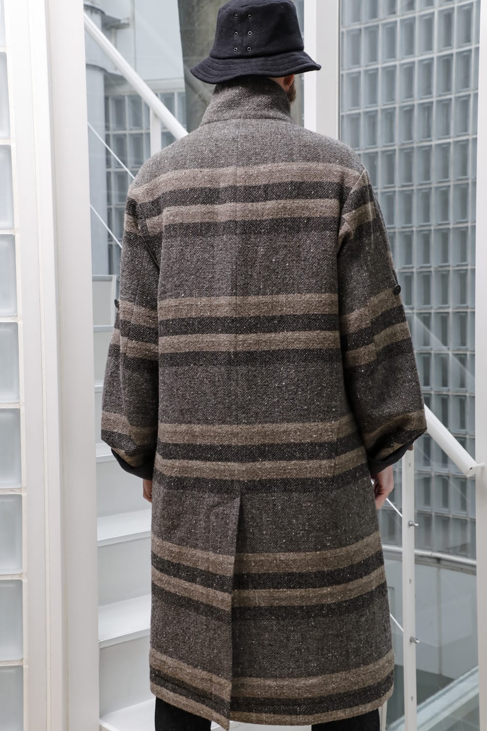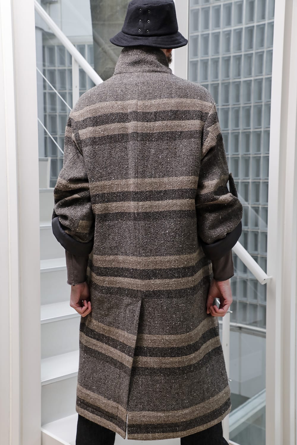 オーバーコートのようなルーズフィットシルエットで制作したハイネックコート。