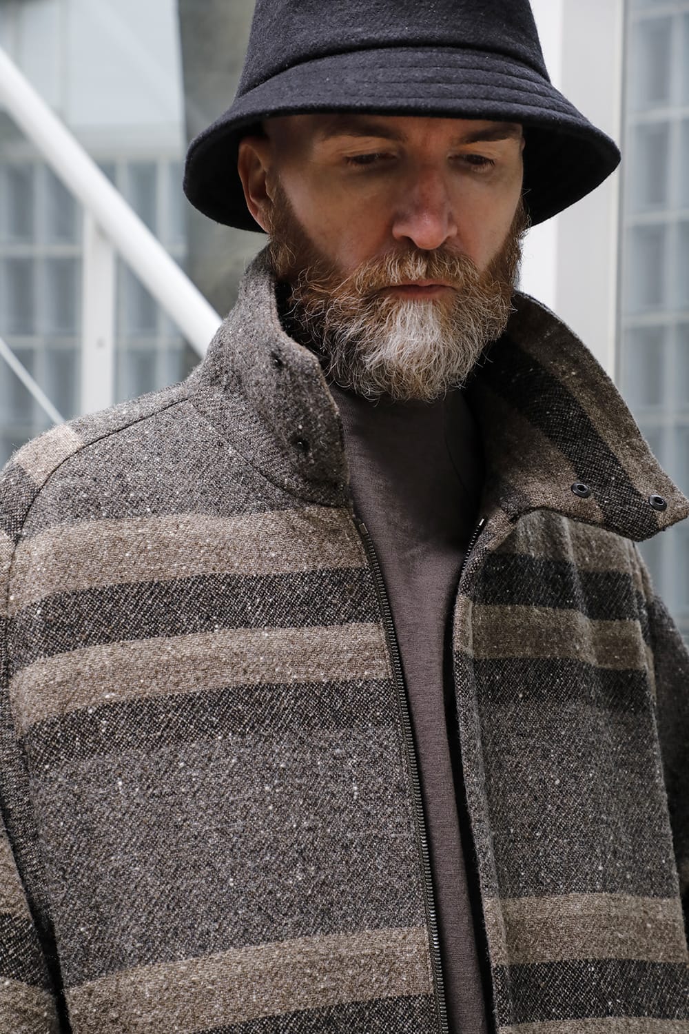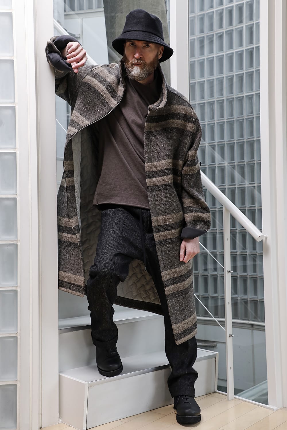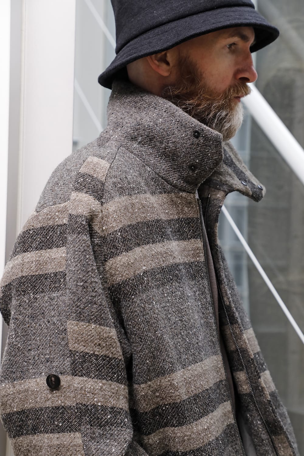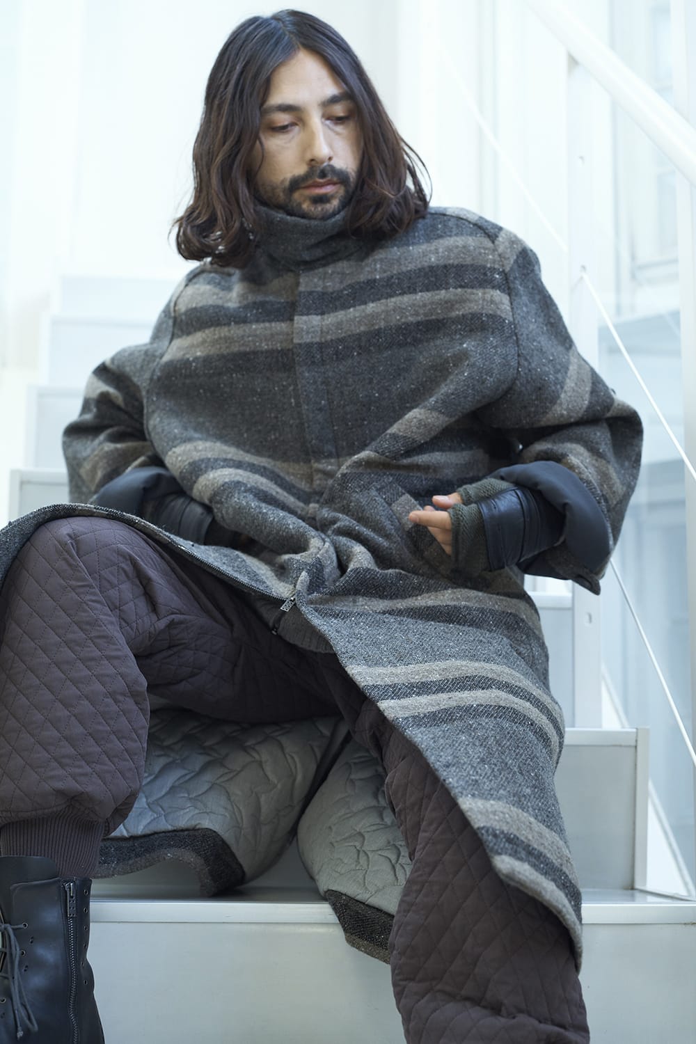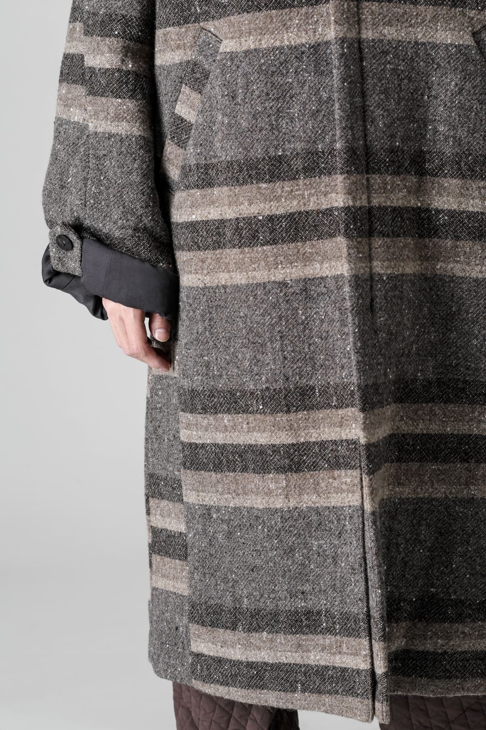 オーバーコートのようなルーズフィットシルエットで制作したハイネックコート。