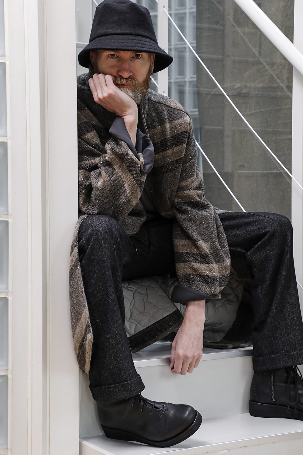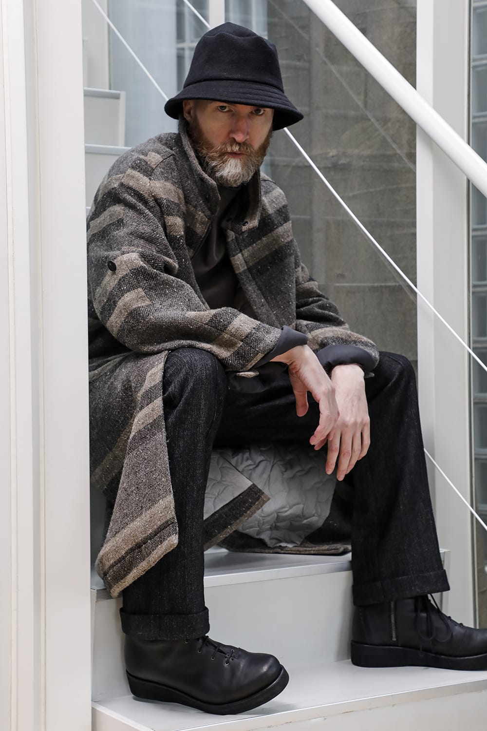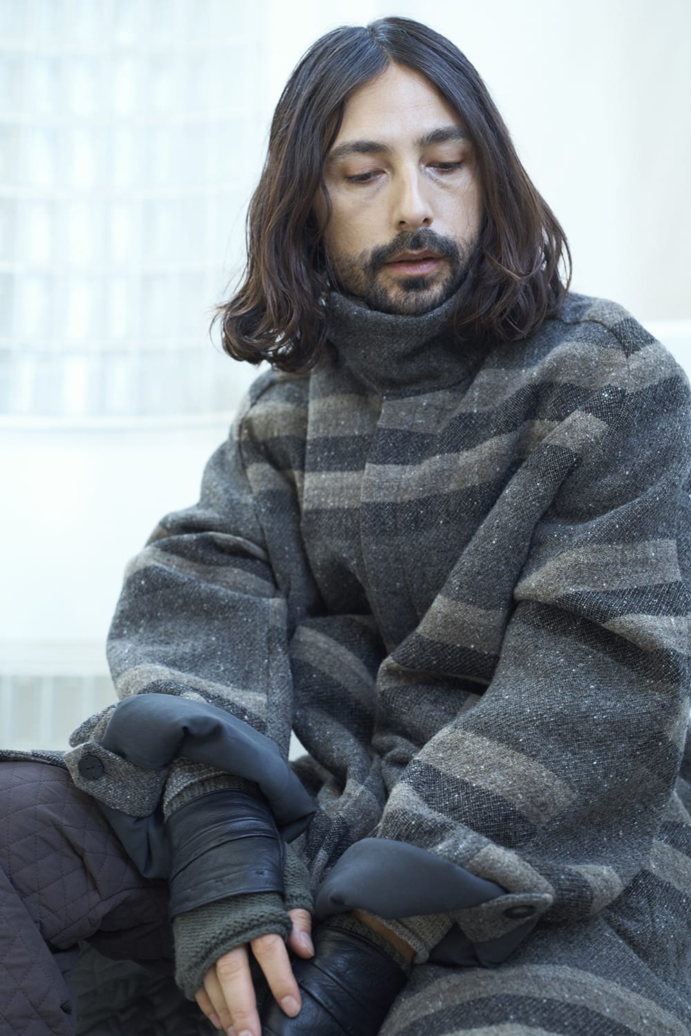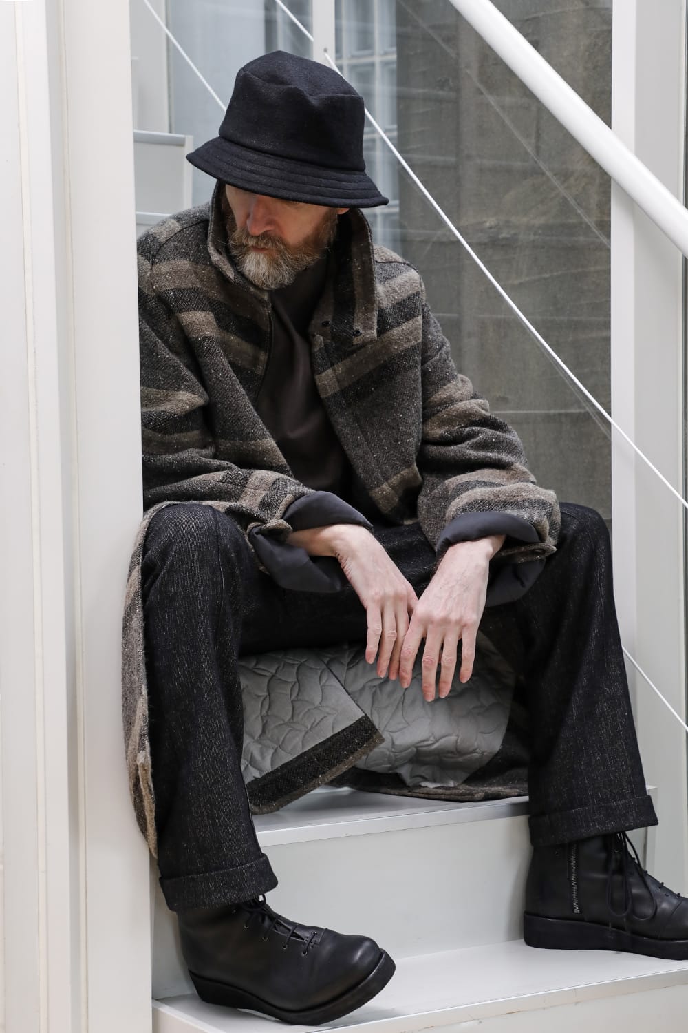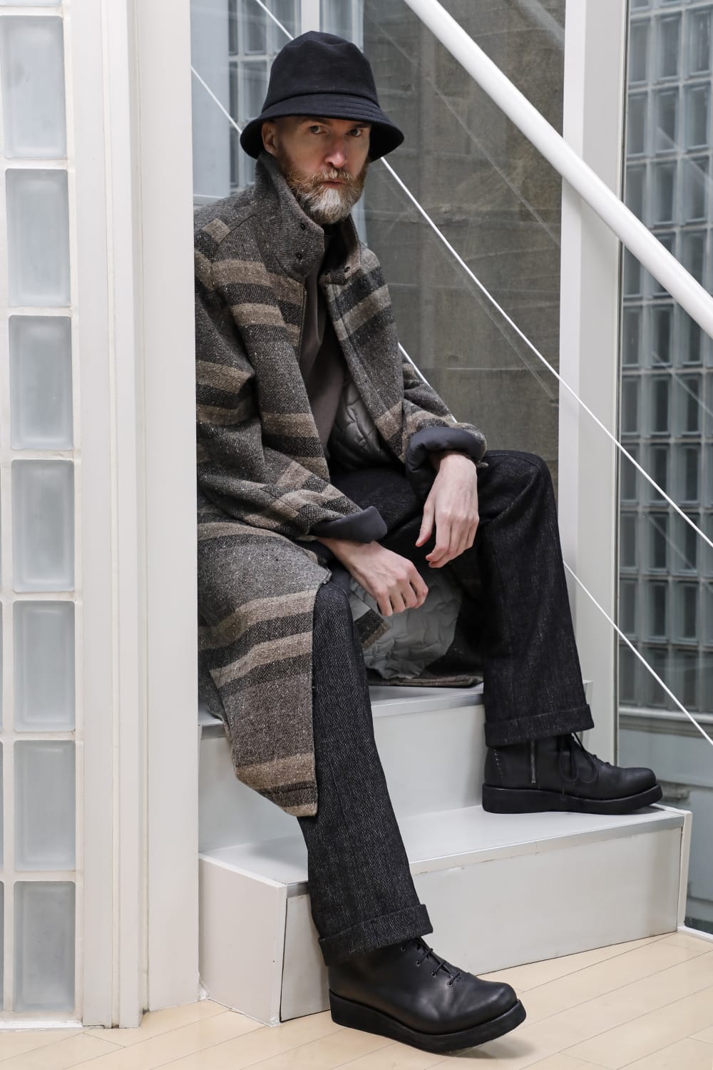 オーバーコートのようなルーズフィットシルエットで制作したハイネックコート。