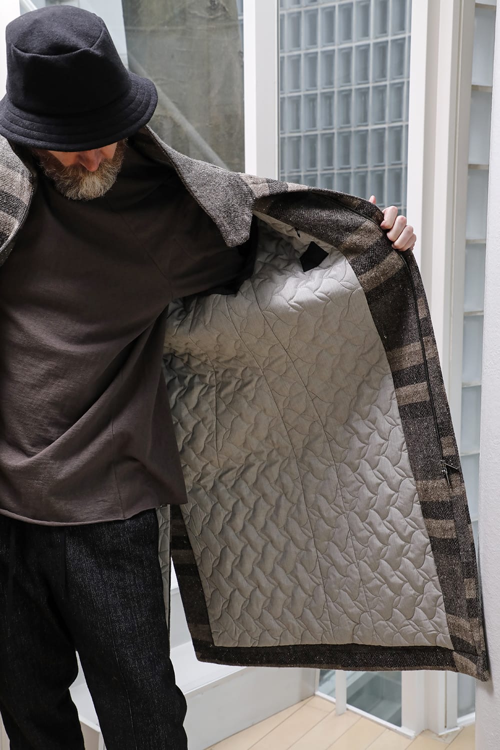 身頃裏地のみシルクのキルティングで中綿が入り、軽いながらも防寒性と保温性に非常に優れた暖かいコートです。