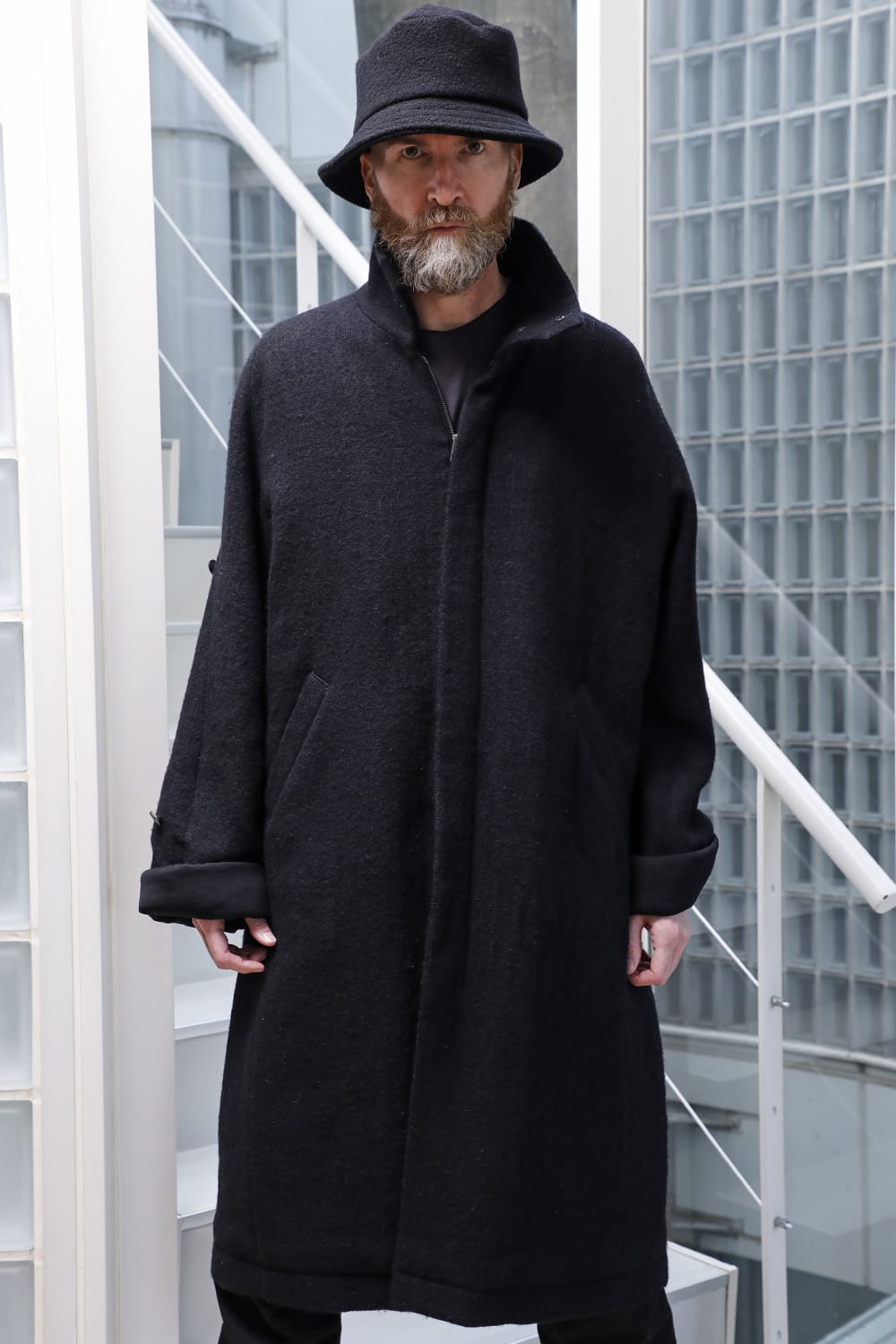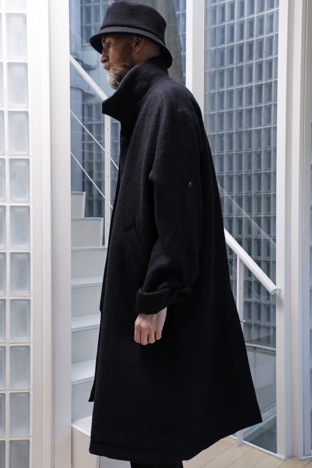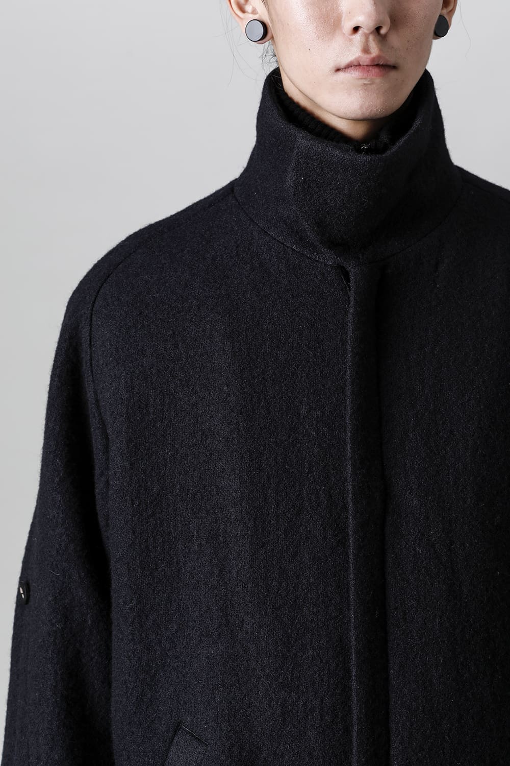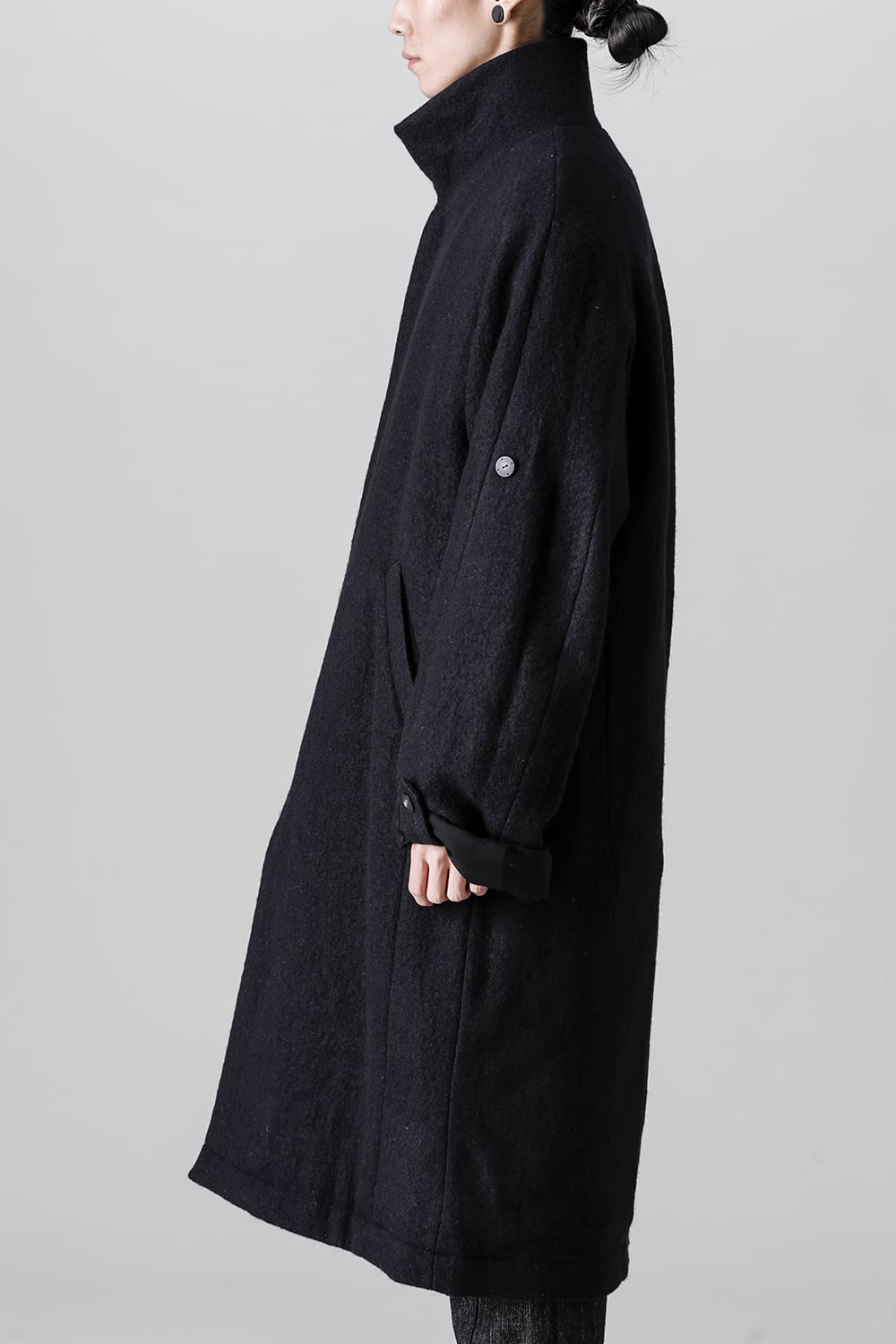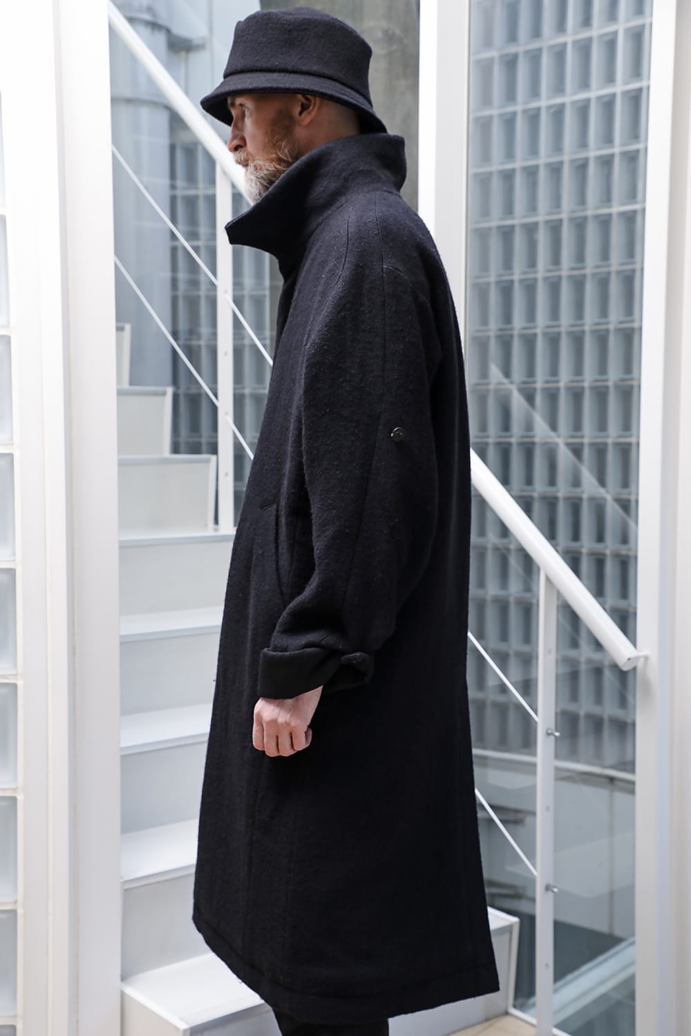 日本の毛織物産地、尾州でウール、コットン、リネンの混紡生地を縮絨加工して膨らみを持たせた生地を用いてオーバーコートのようなルーズフィットシルエットで制作したハイネックコート。