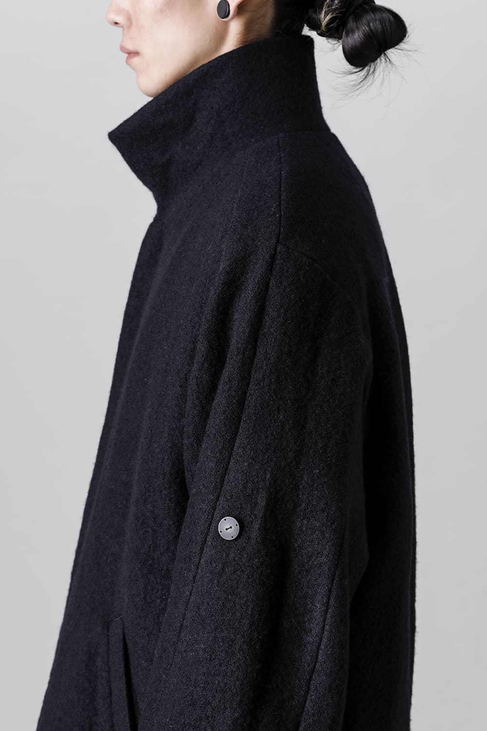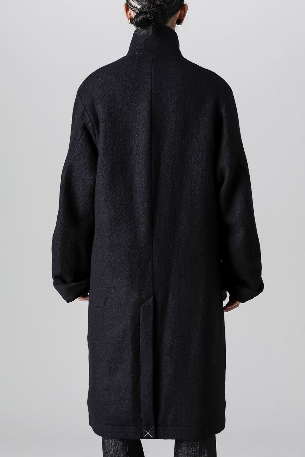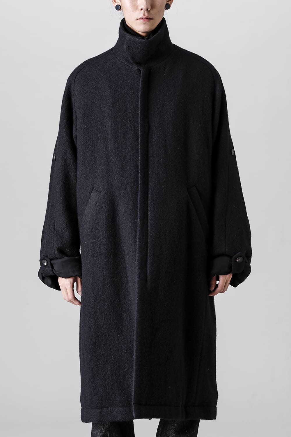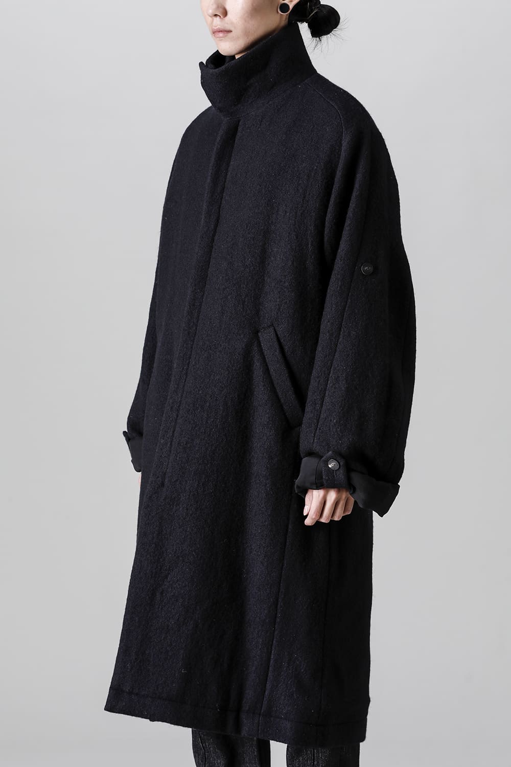 日本の毛織物産地、尾州でウール、コットン、リネンの混紡生地を縮絨加工して膨らみを持たせた生地を用いてオーバーコートのようなルーズフィットシルエットで制作したハイネックコート。