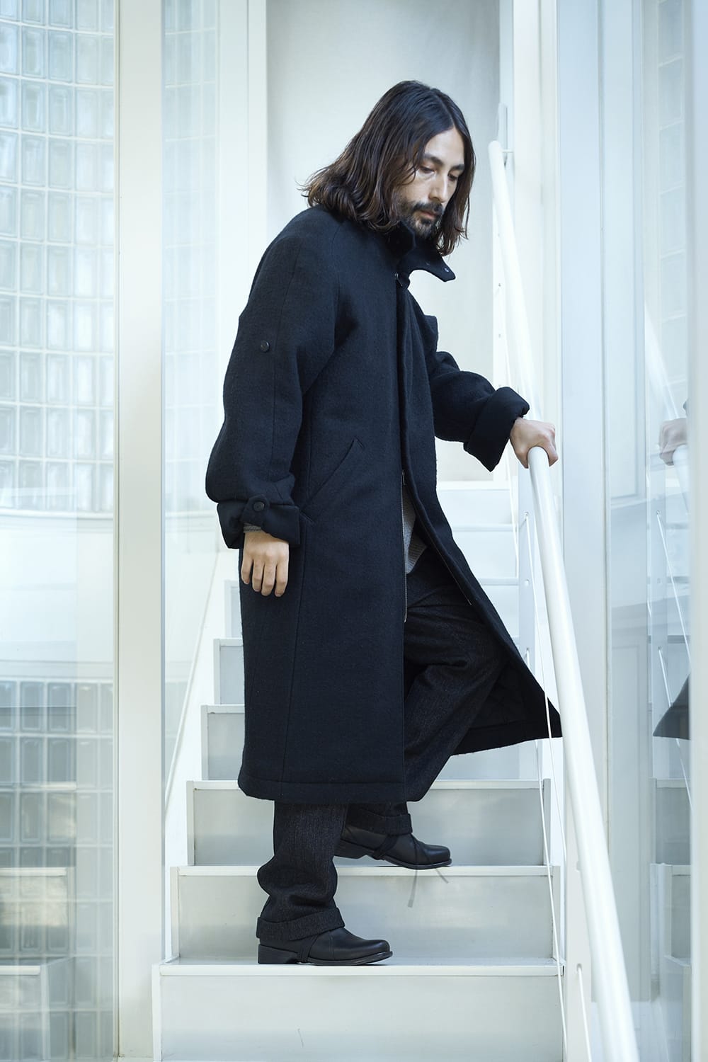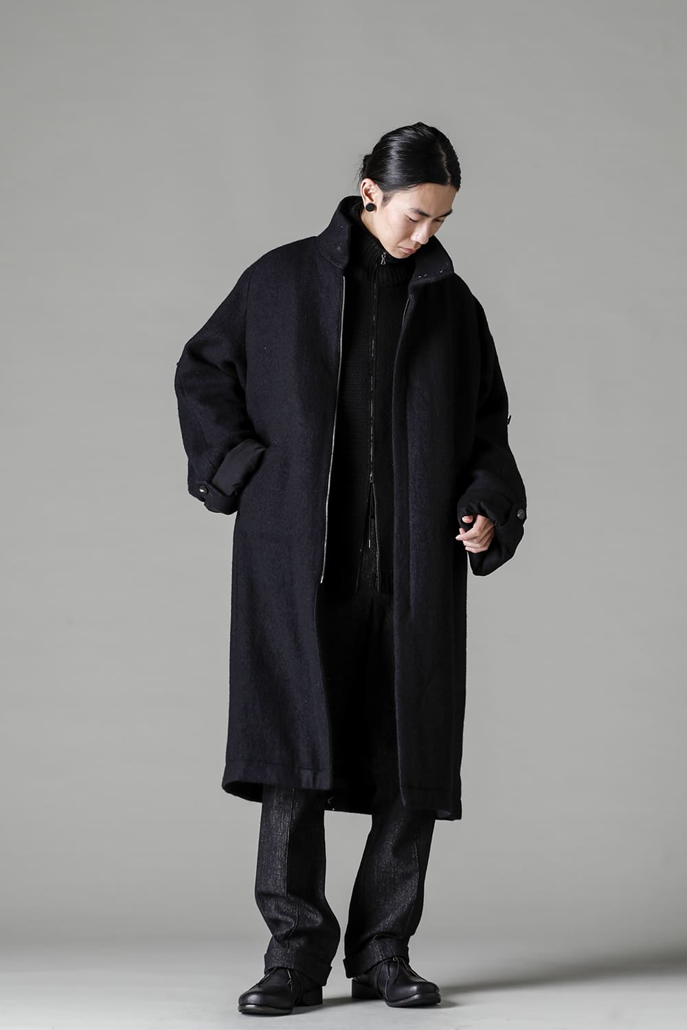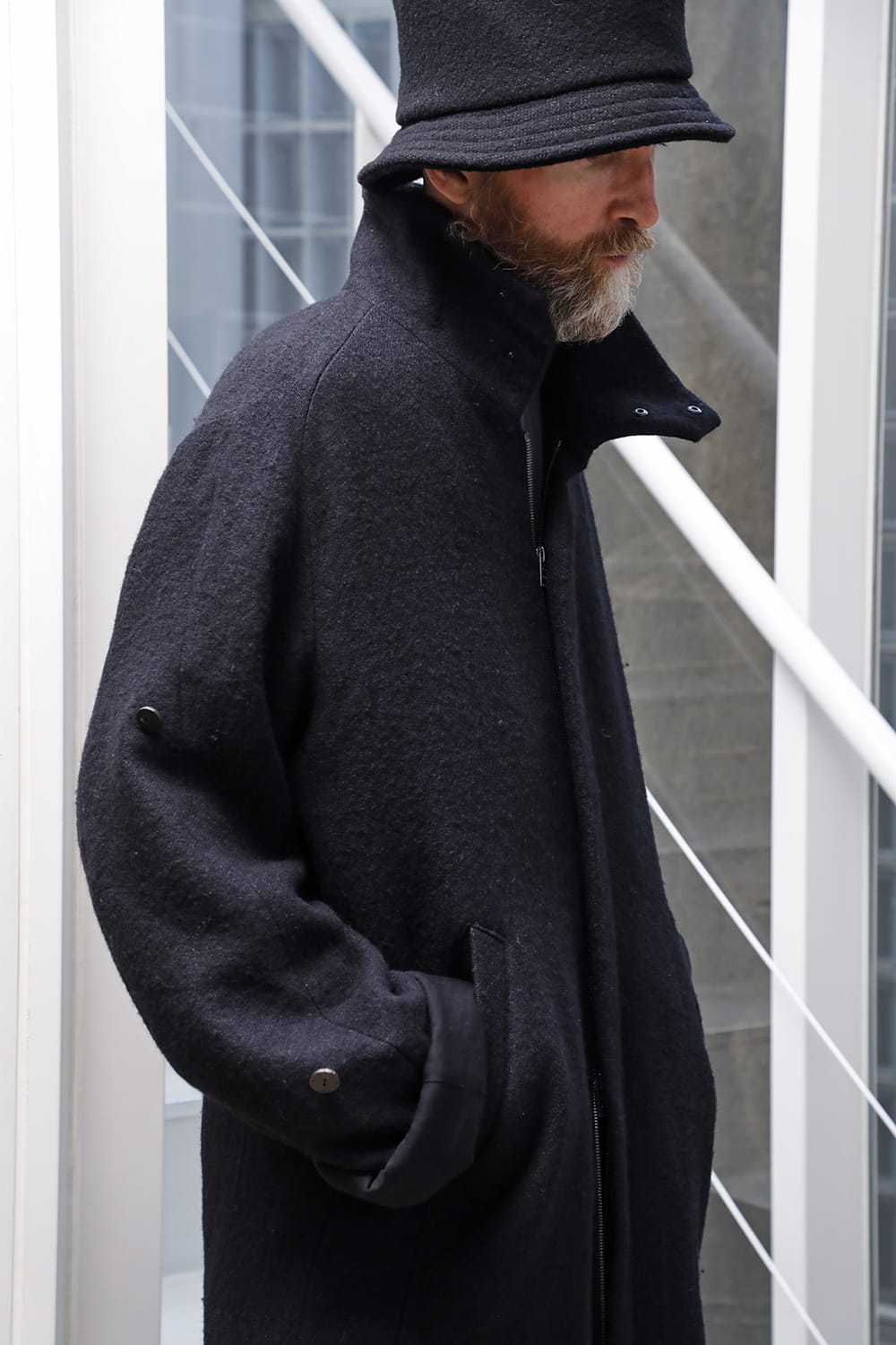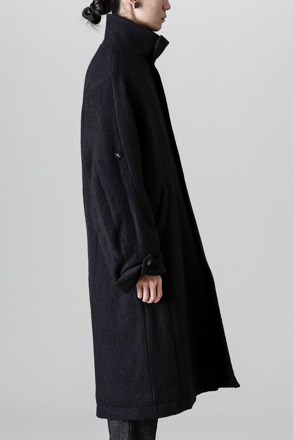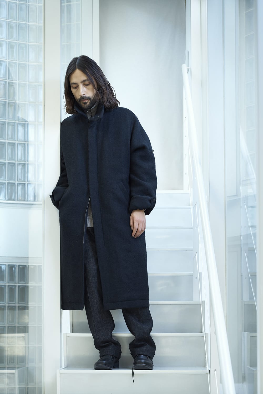日本の毛織物産地、尾州でウール、コットン、リネンの混紡生地を縮絨加工して膨らみを持たせた生地を用いてオーバーコートのようなルーズフィットシルエットで制作したハイネックコート。
