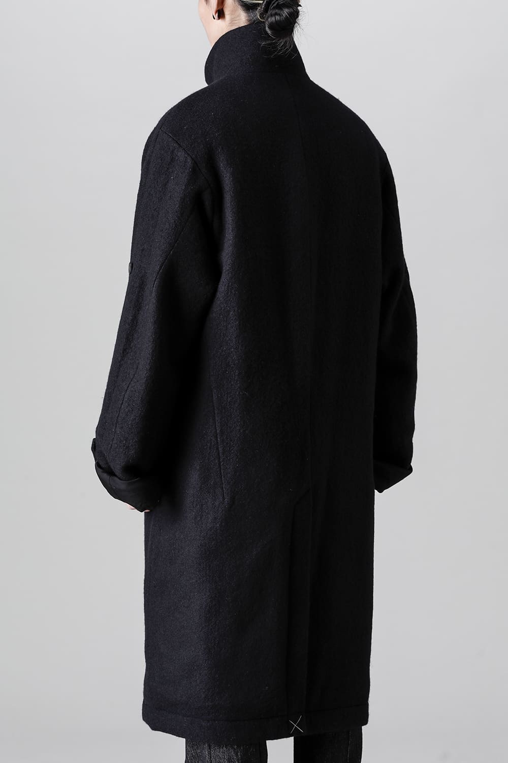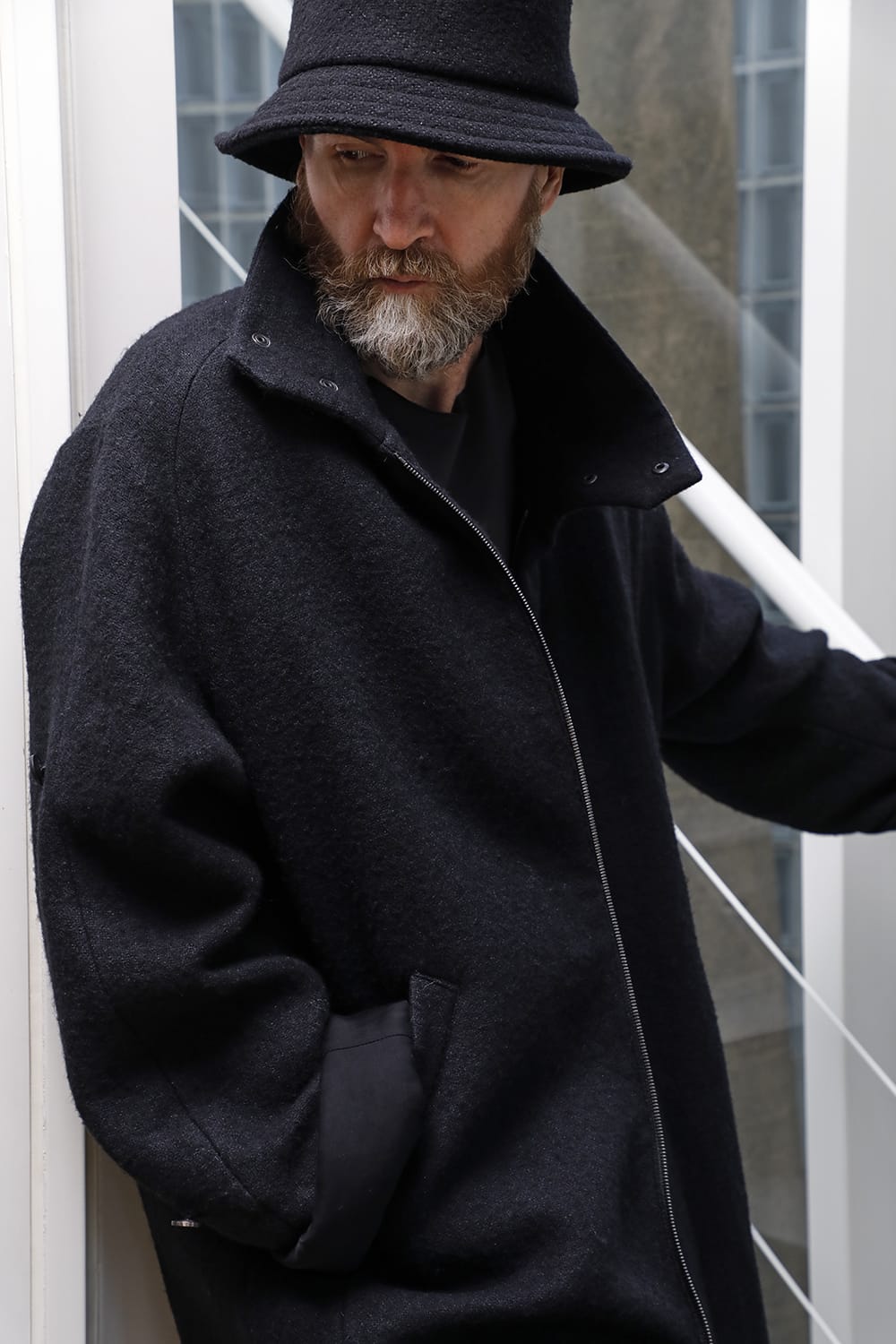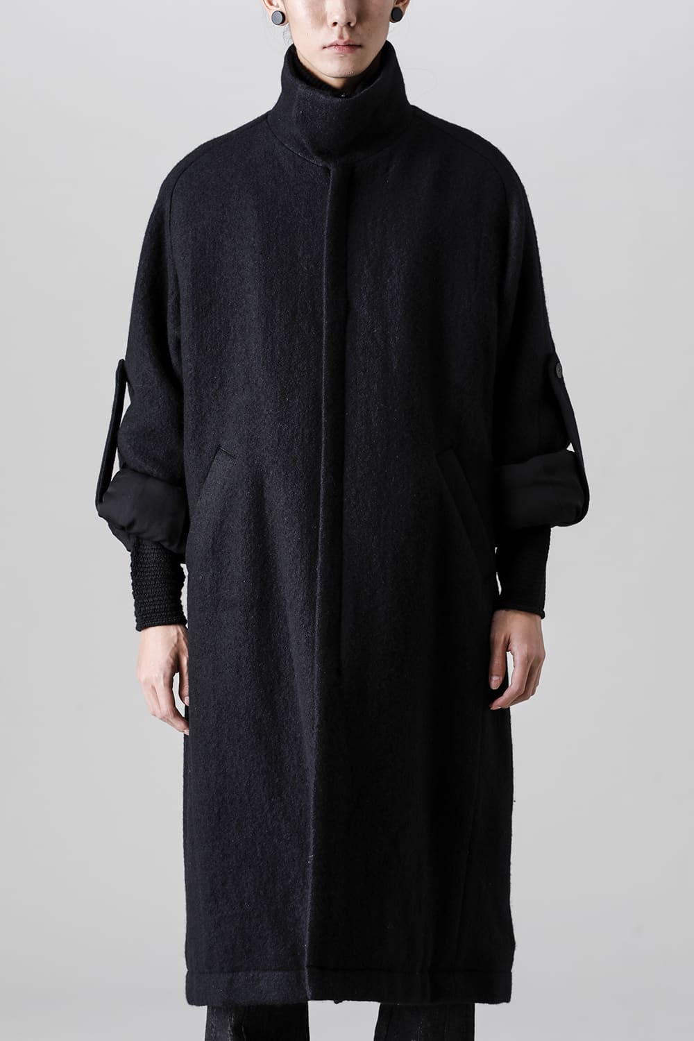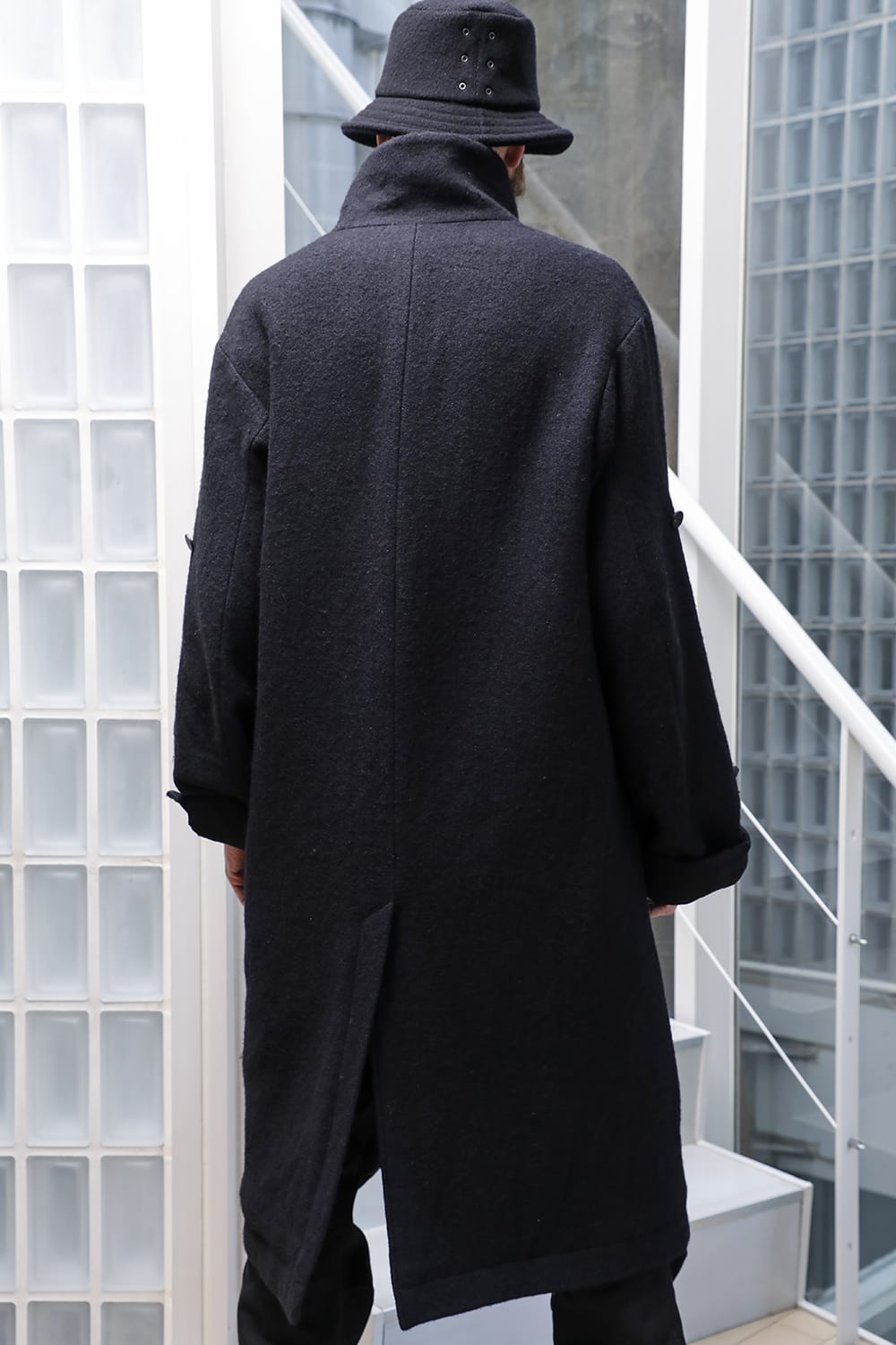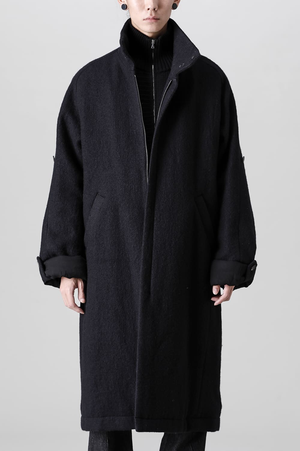 日本の毛織物産地、尾州でウール、コットン、リネンの混紡生地を縮絨加工して膨らみを持たせた生地を用いてオーバーコートのようなルーズフィットシルエットで制作したハイネックコート。