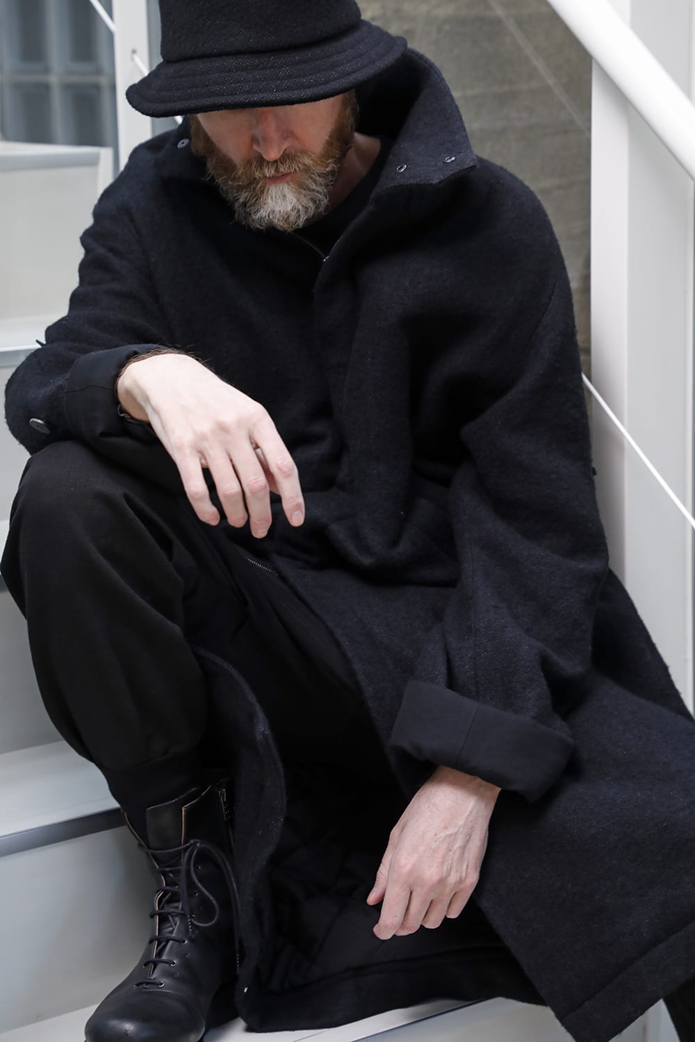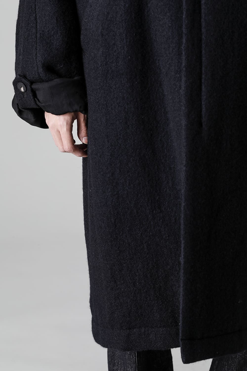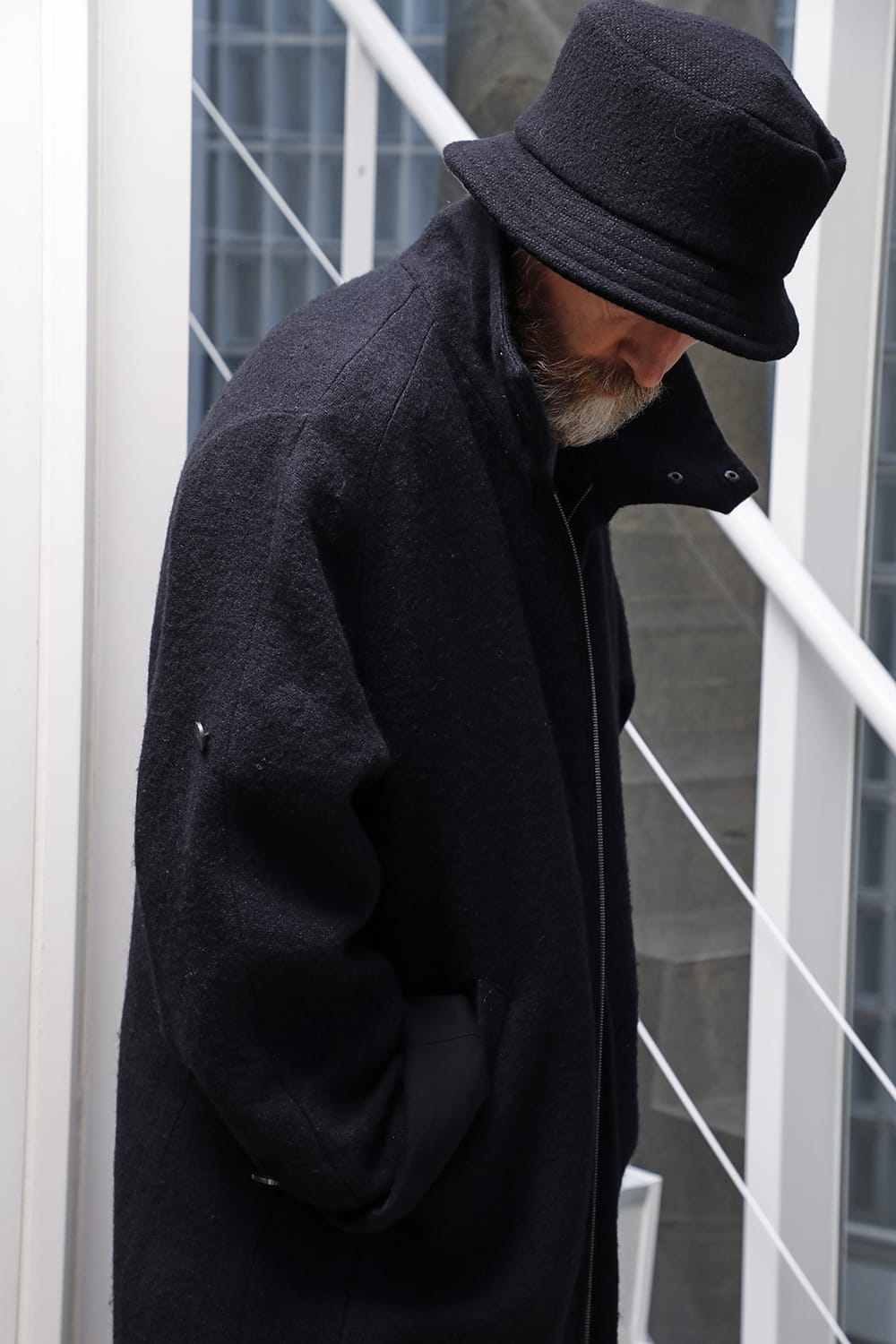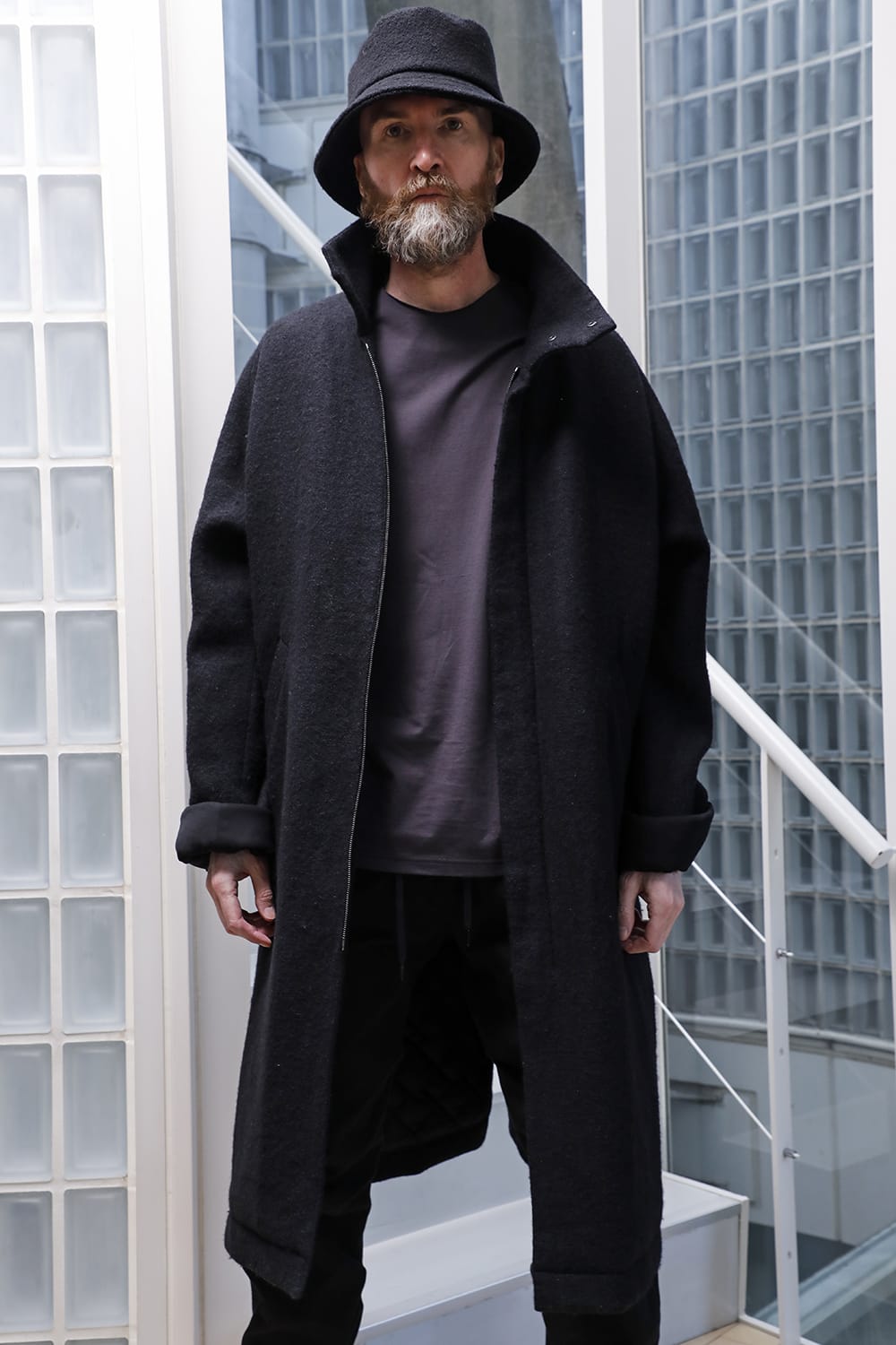 日本の毛織物産地、尾州でウール、コットン、リネンの混紡生地を縮絨加工して膨らみを持たせた生地を用いてオーバーコートのようなルーズフィットシルエットで制作したハイネックコート。