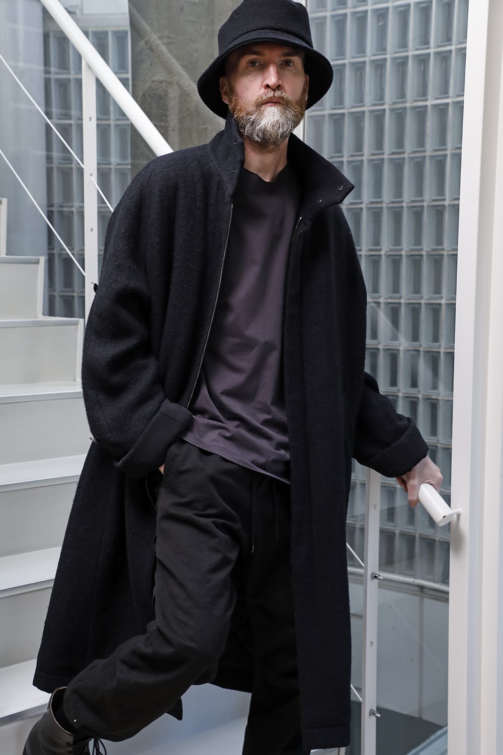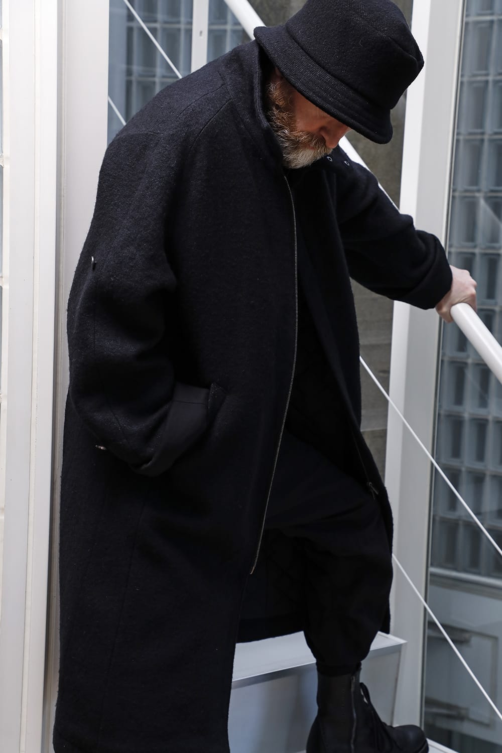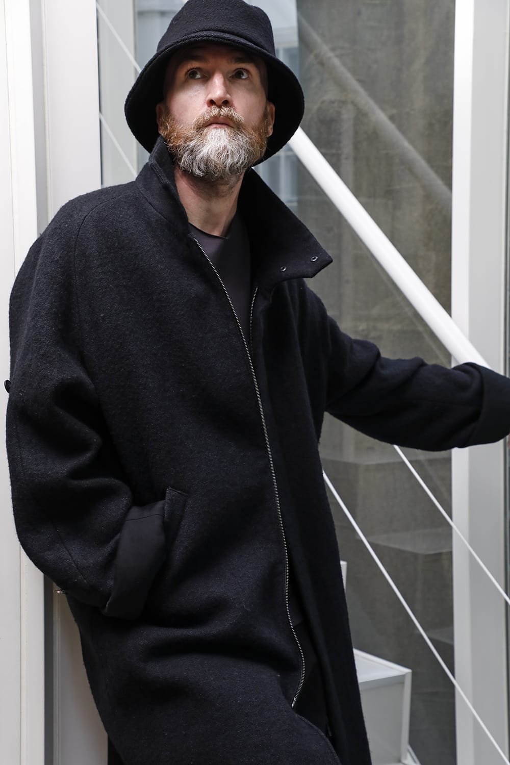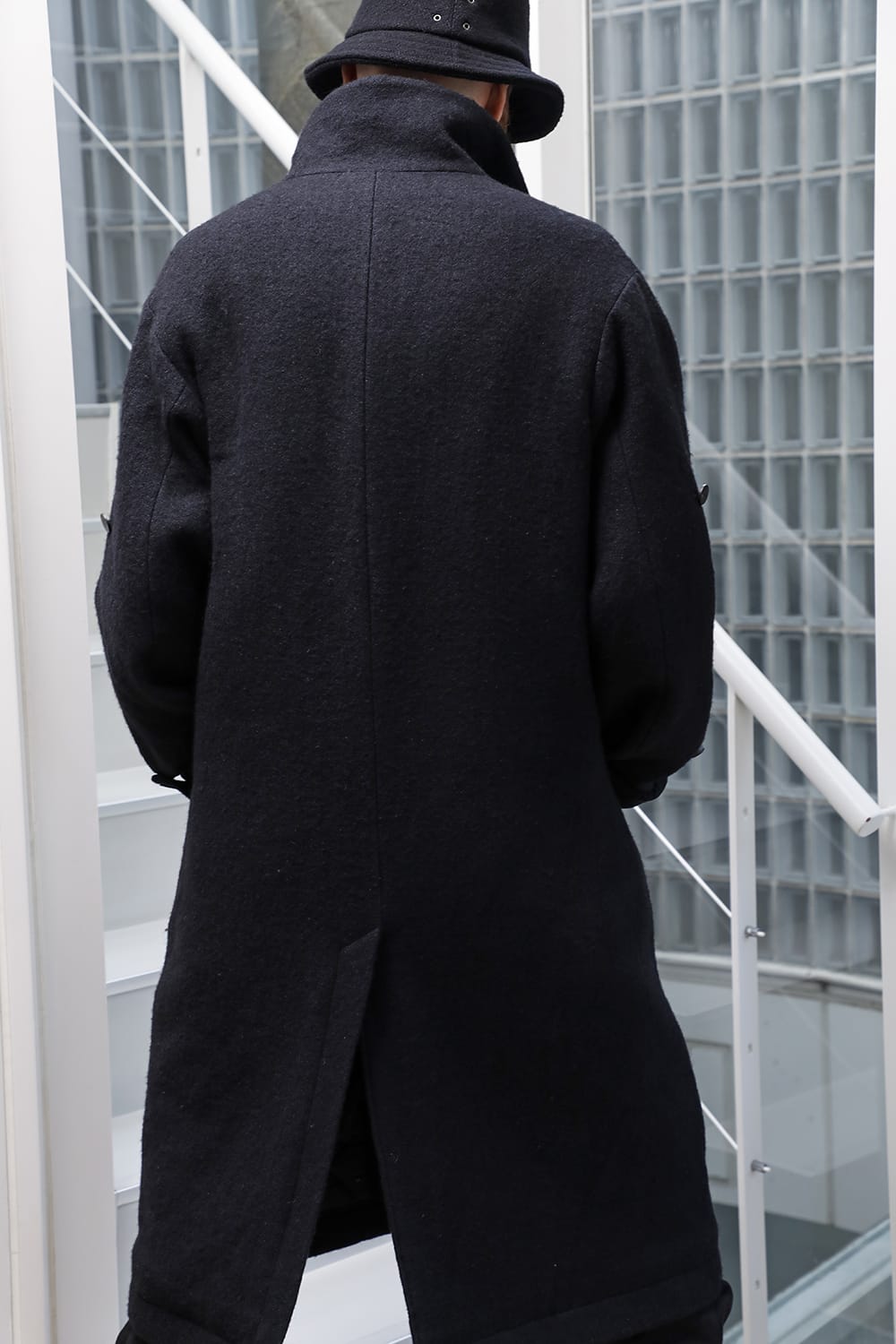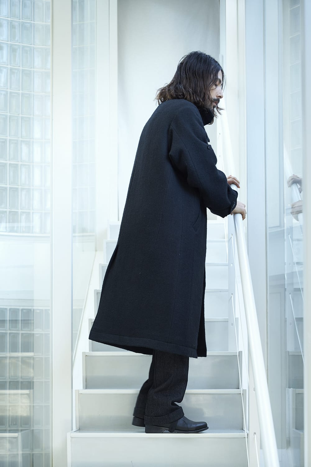 日本の毛織物産地、尾州でウール、コットン、リネンの混紡生地を縮絨加工して膨らみを持たせた生地を用いてオーバーコートのようなルーズフィットシルエットで制作したハイネックコート。