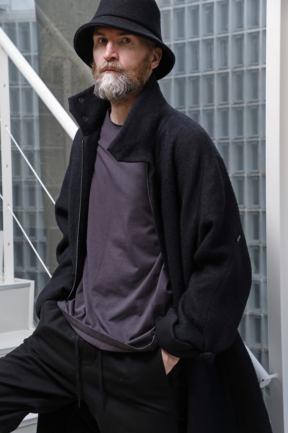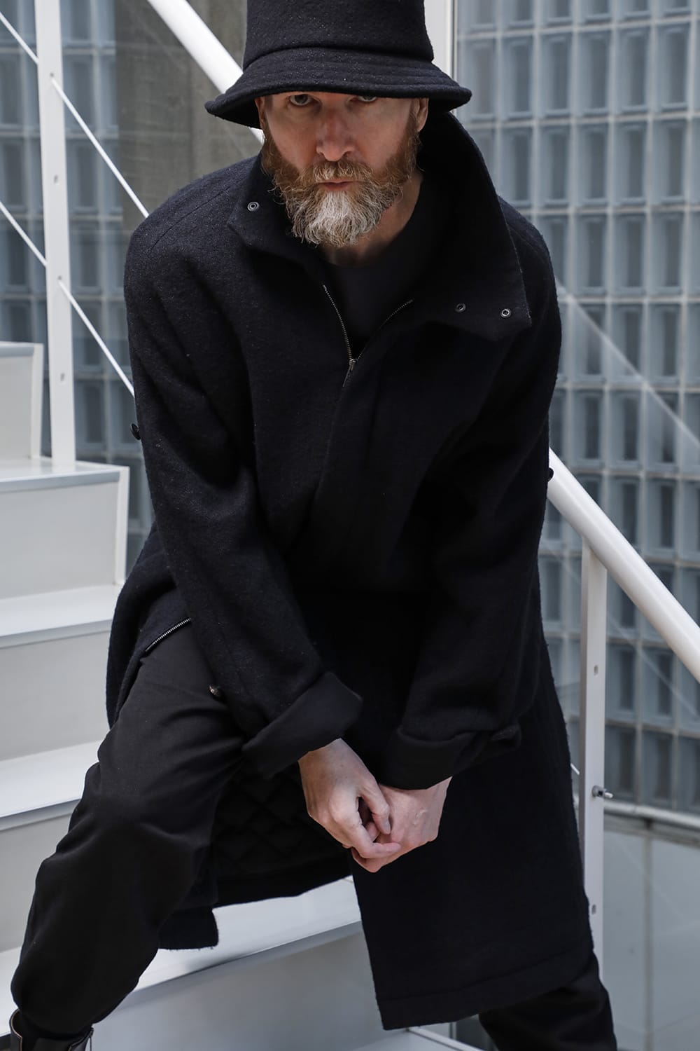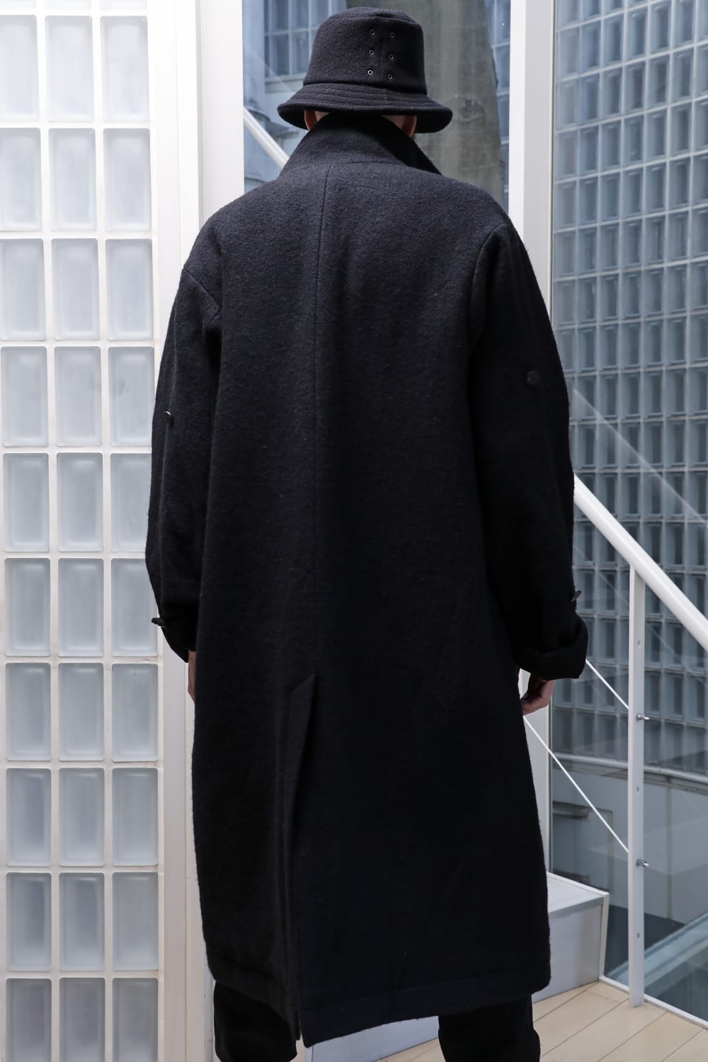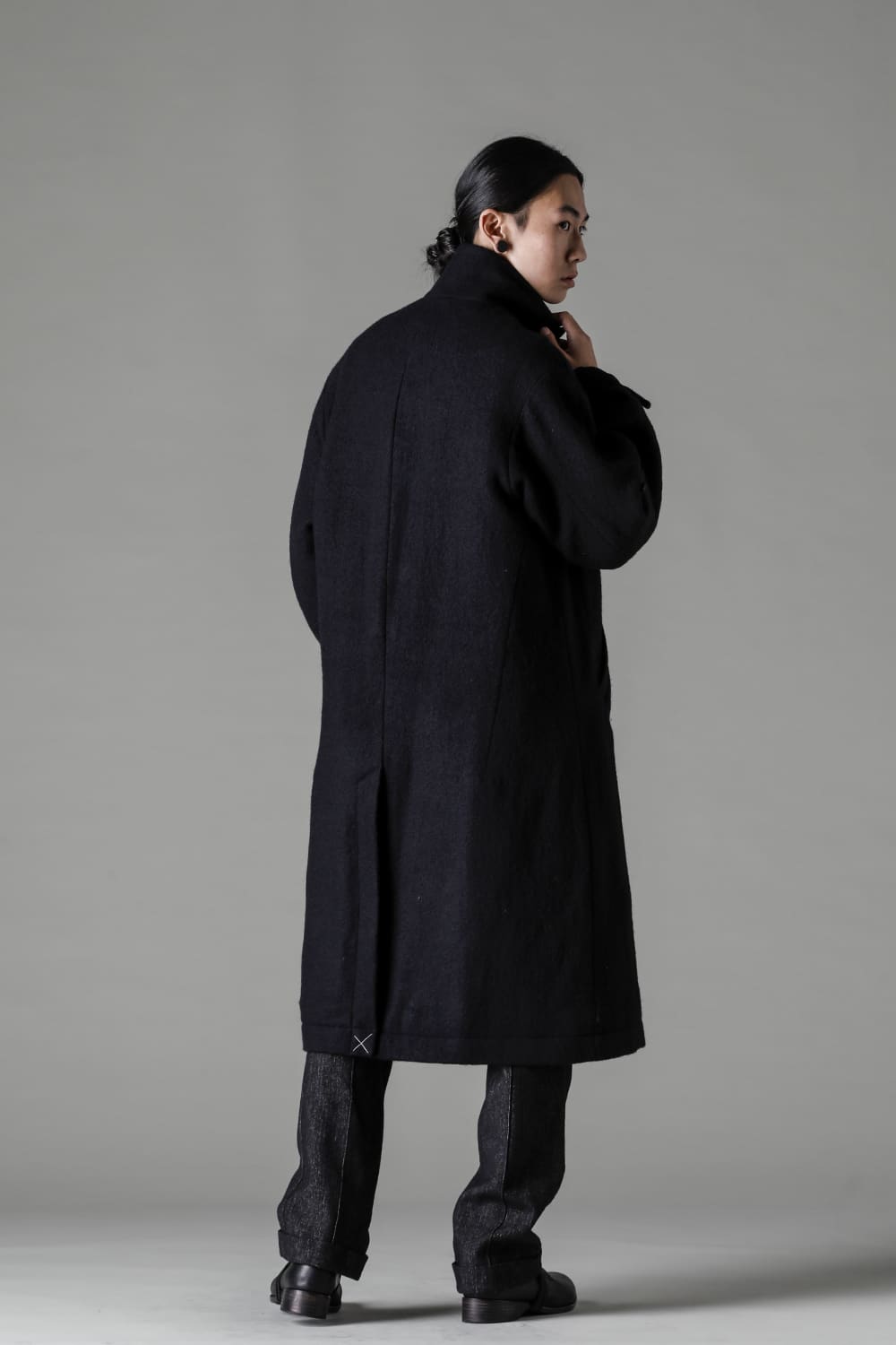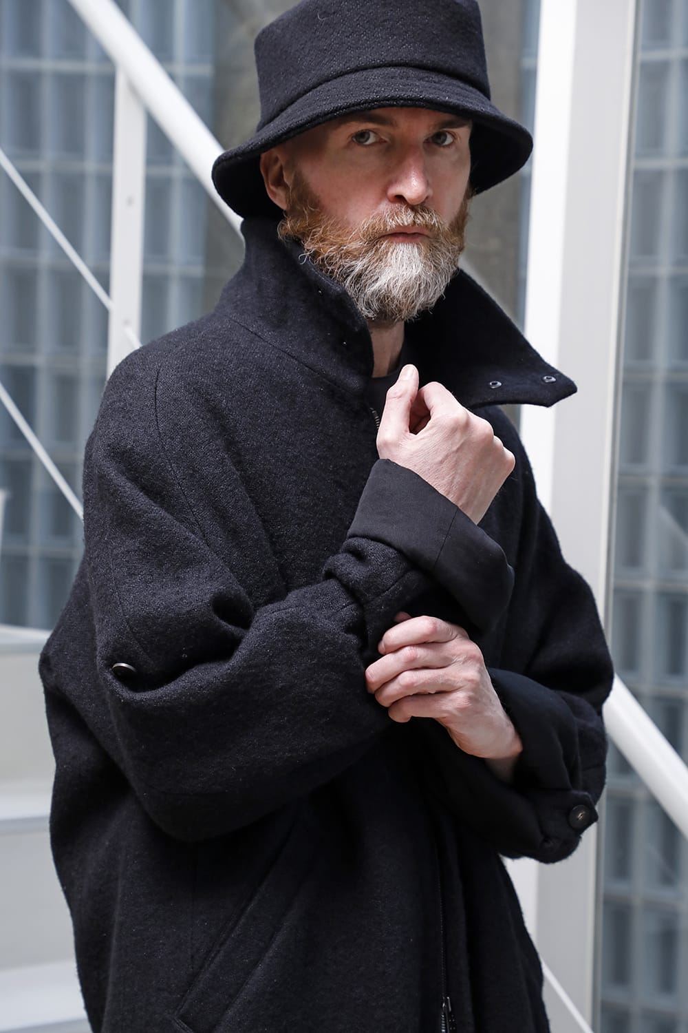 日本の毛織物産地、尾州でウール、コットン、リネンの混紡生地を縮絨加工して膨らみを持たせた生地を用いてオーバーコートのようなルーズフィットシルエットで制作したハイネックコート。