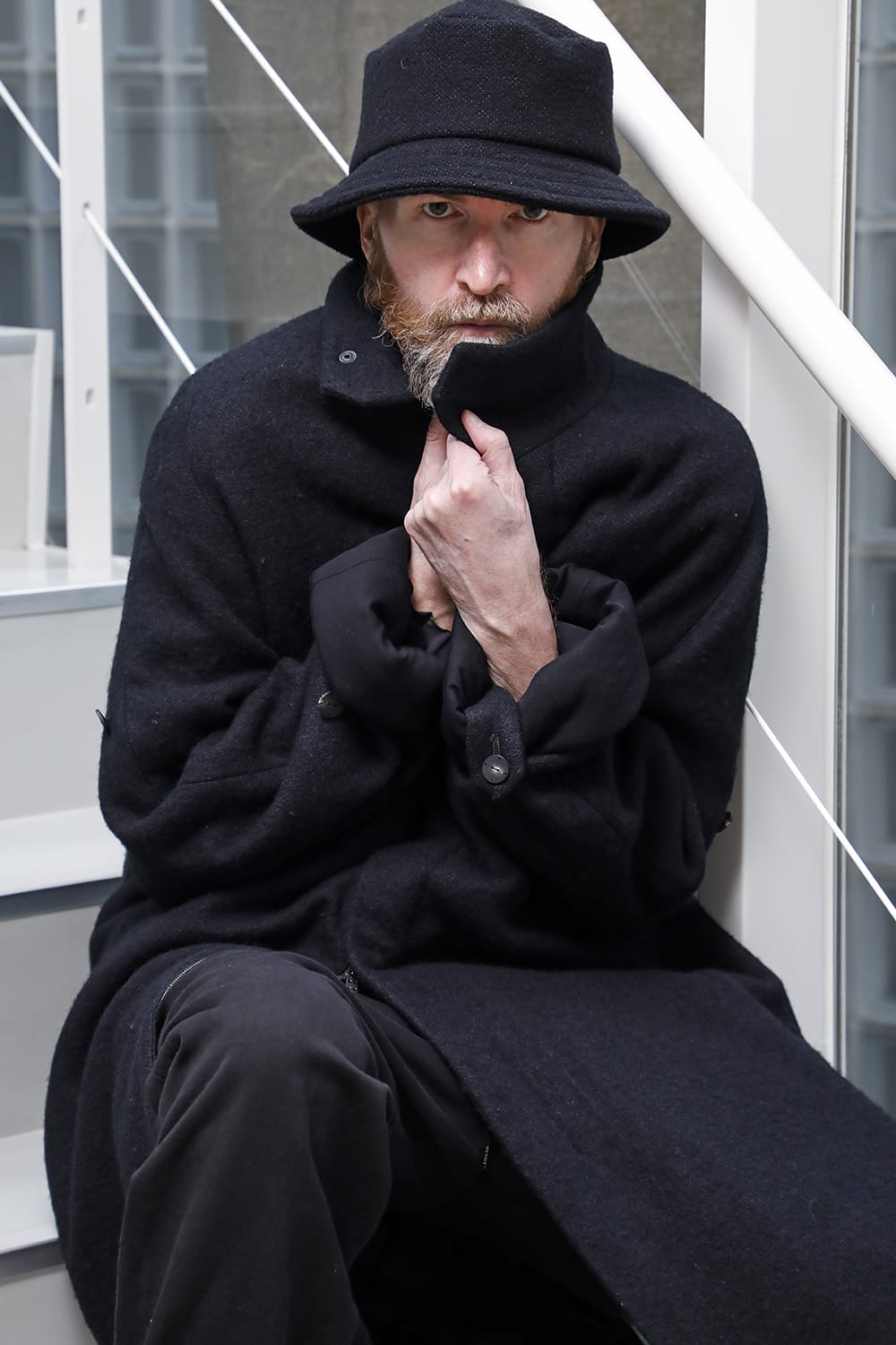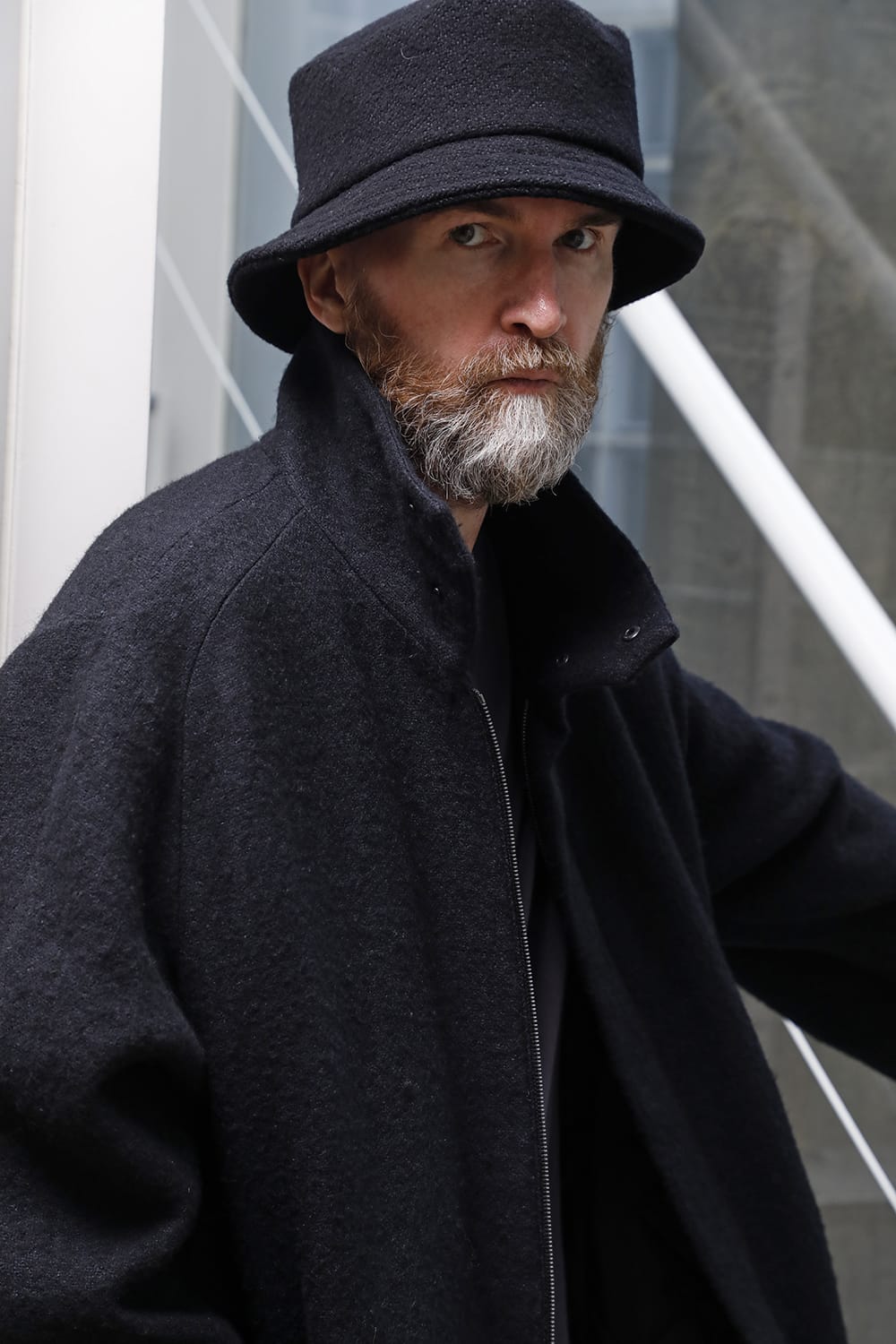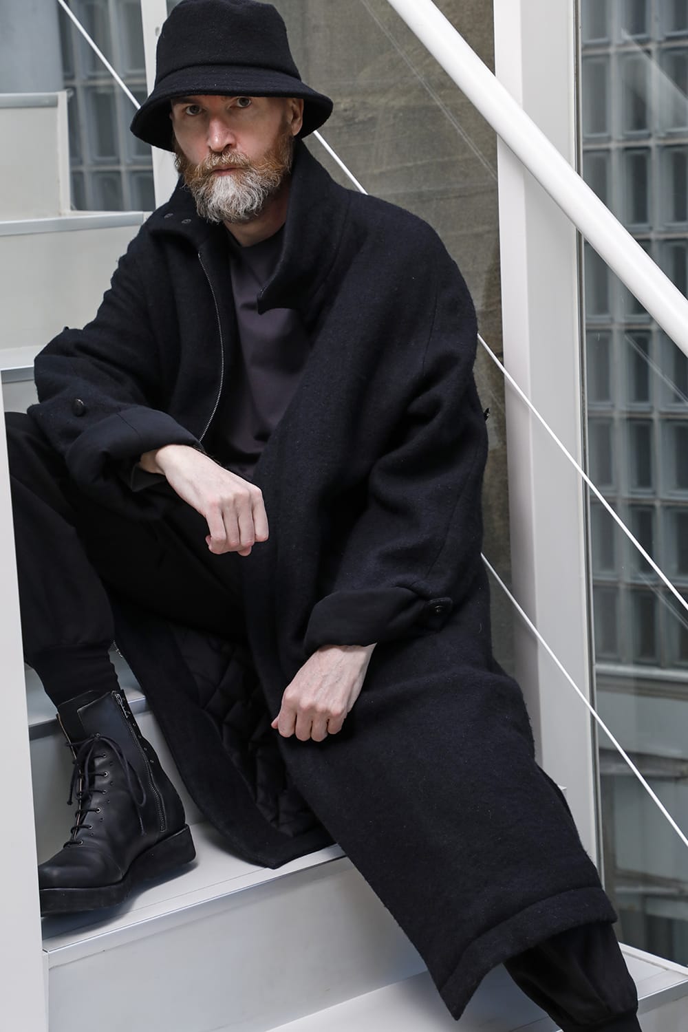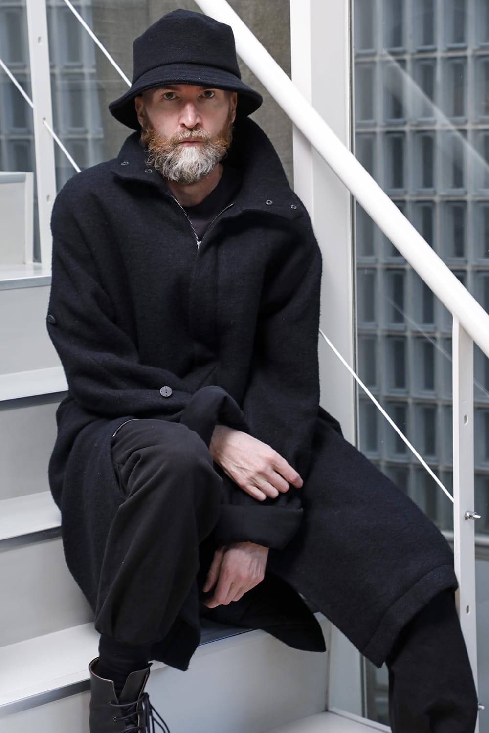 日本の毛織物産地、尾州でウール、コットン、リネンの混紡生地を縮絨加工して膨らみを持たせた生地を用いてオーバーコートのようなルーズフィットシルエットで制作したハイネックコート。