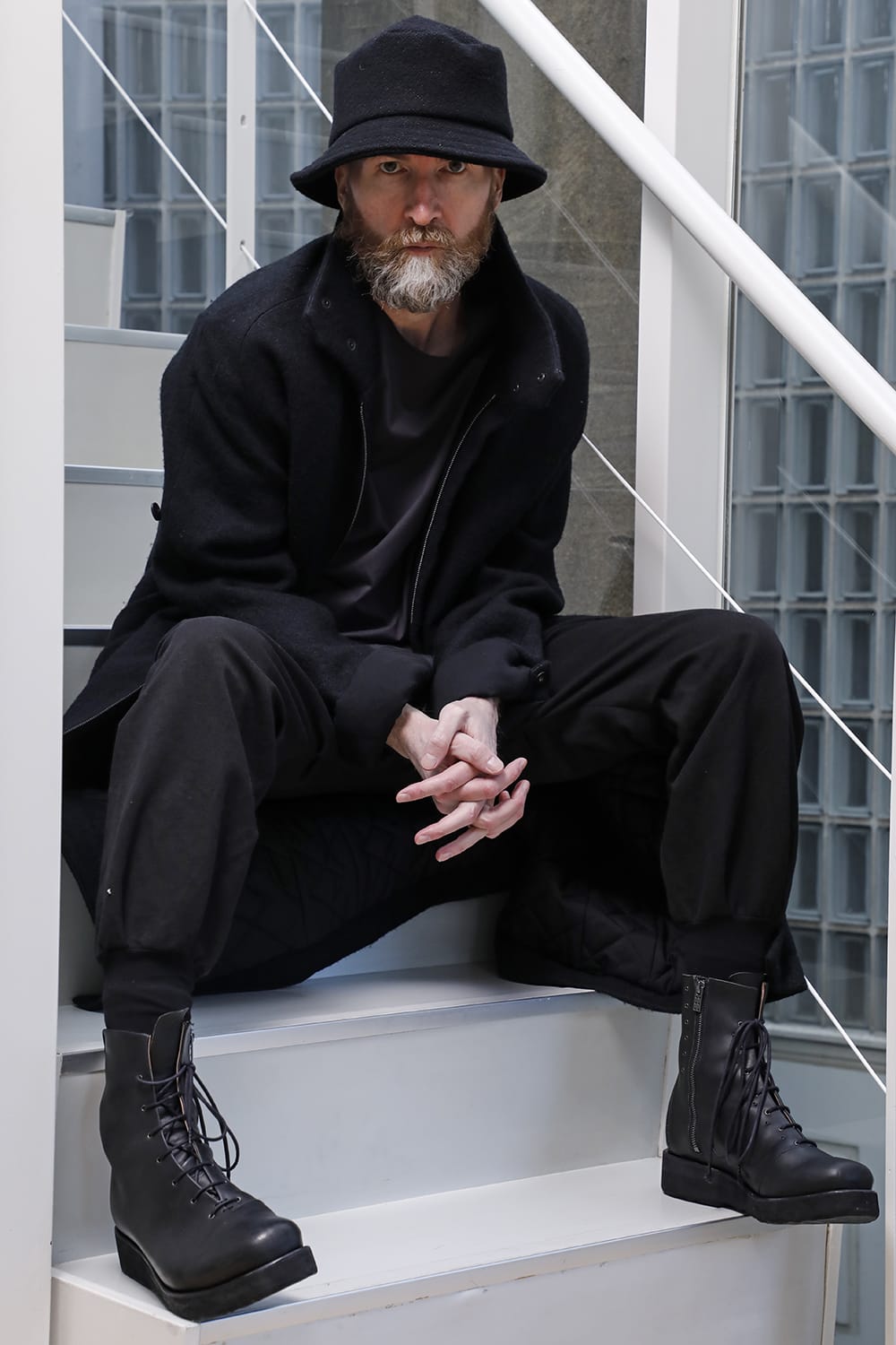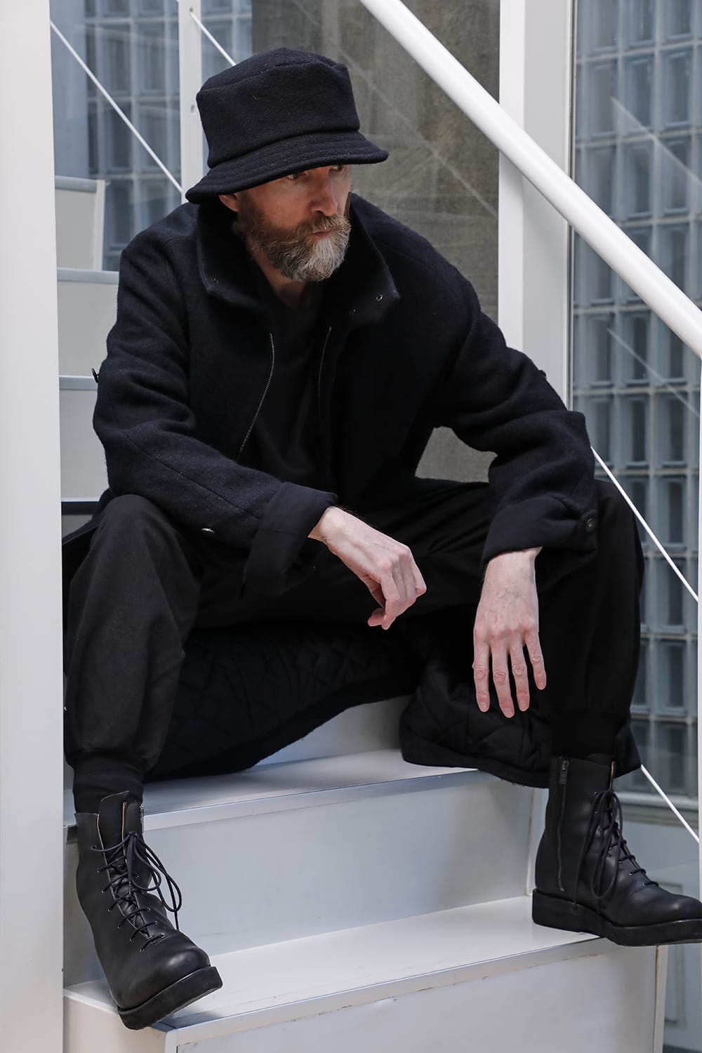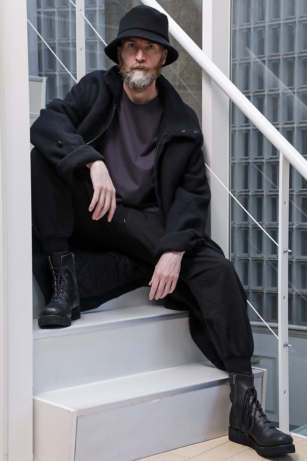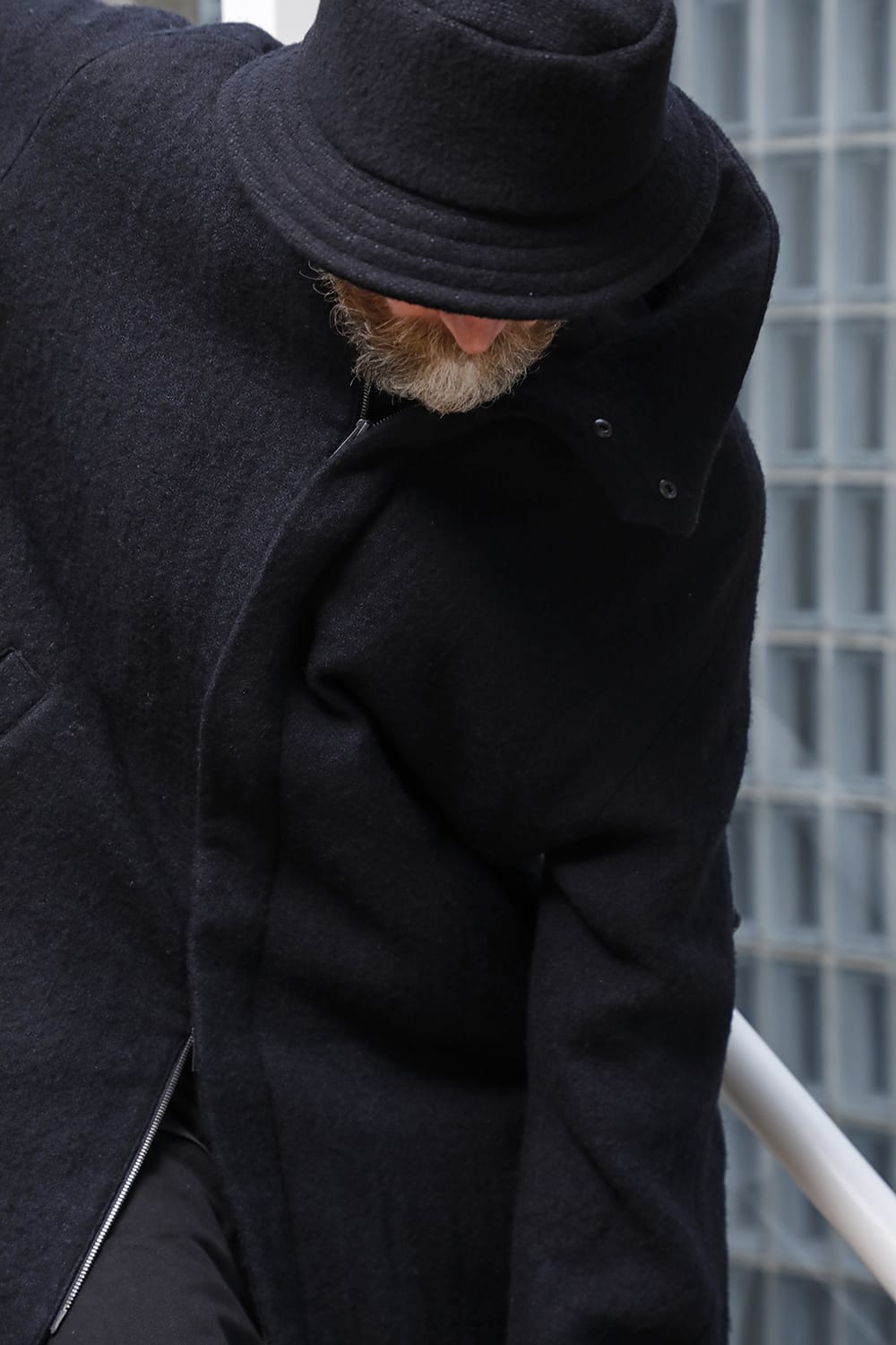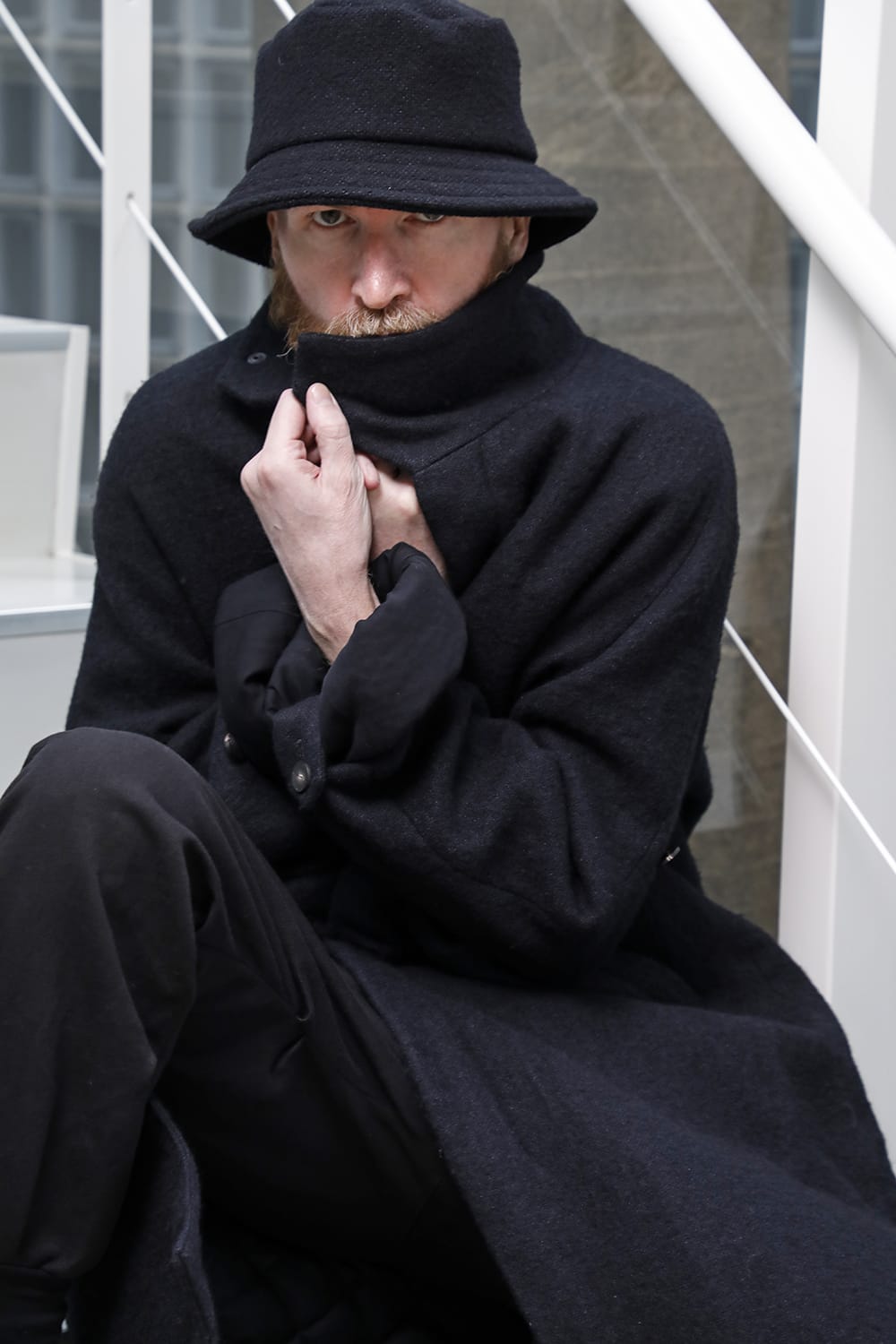 日本の毛織物産地、尾州でウール、コットン、リネンの混紡生地を縮絨加工して膨らみを持たせた生地を用いてオーバーコートのようなルーズフィットシルエットで制作したハイネックコート。