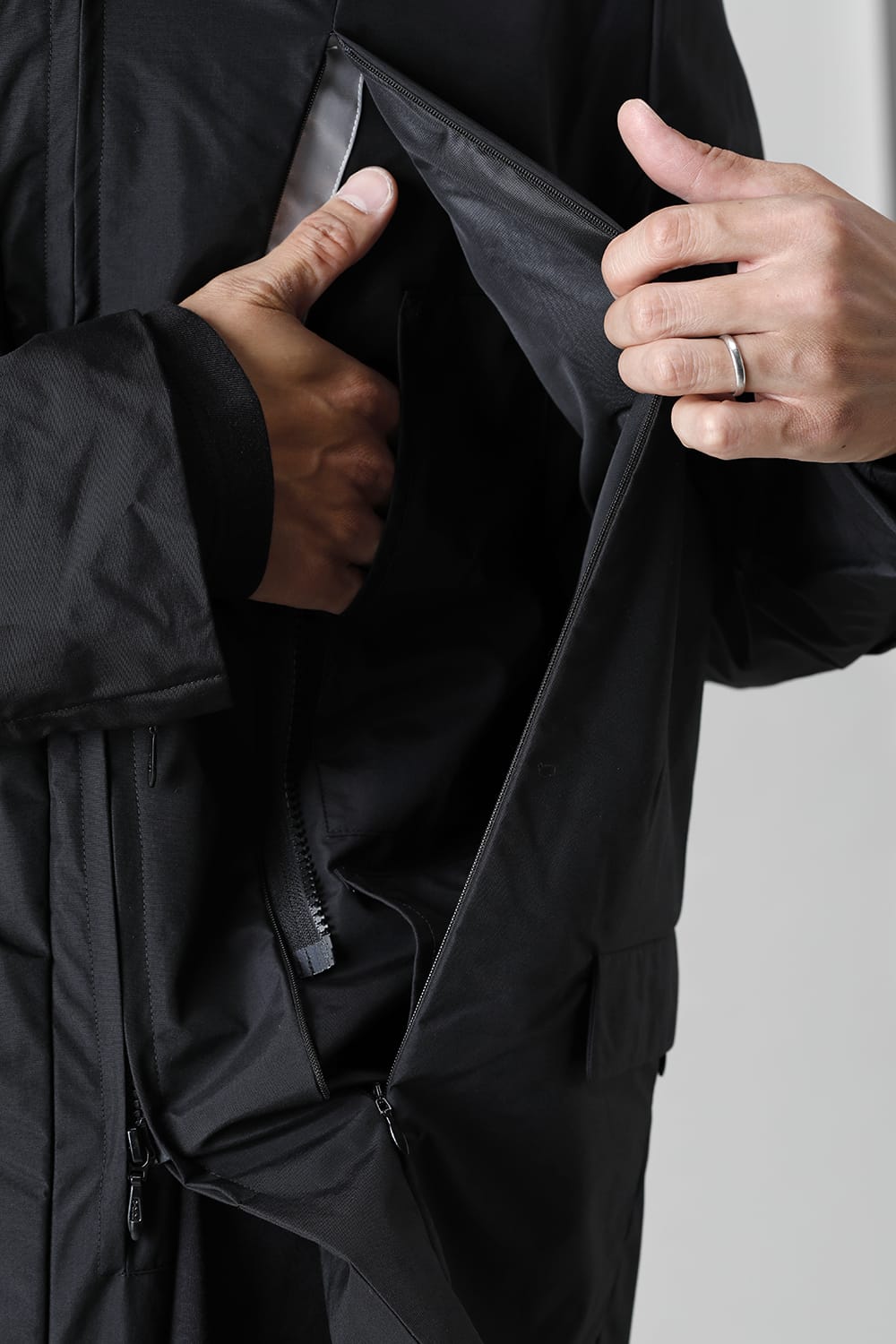 左右フロントに配した胸ポケットは前身頃全体を利用した大容量のポケットで、ファスナーが身頃を大きく切り開きます。そのポケット内にはモバイルポケットを配し合計4箇所に分けて収納が可能。