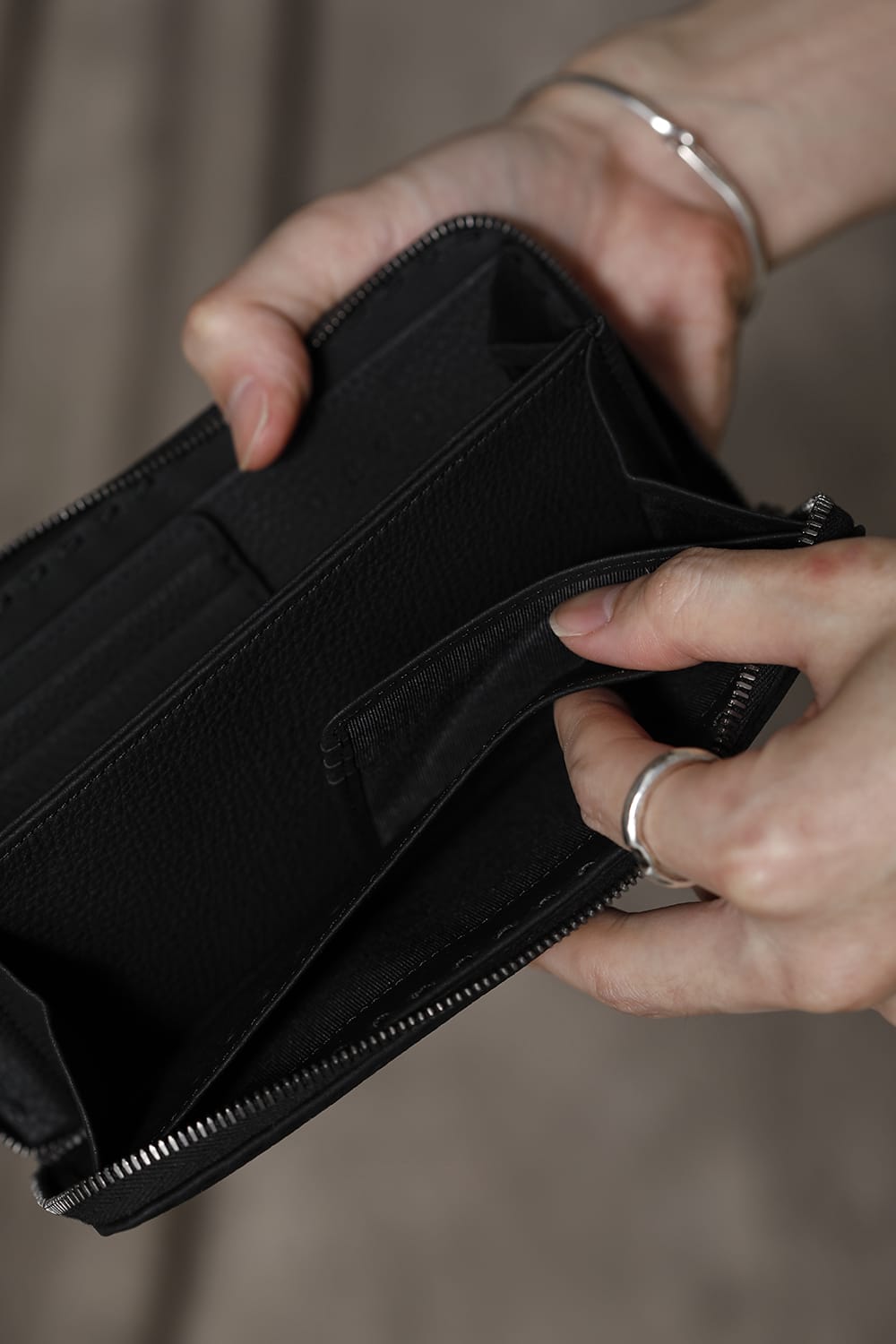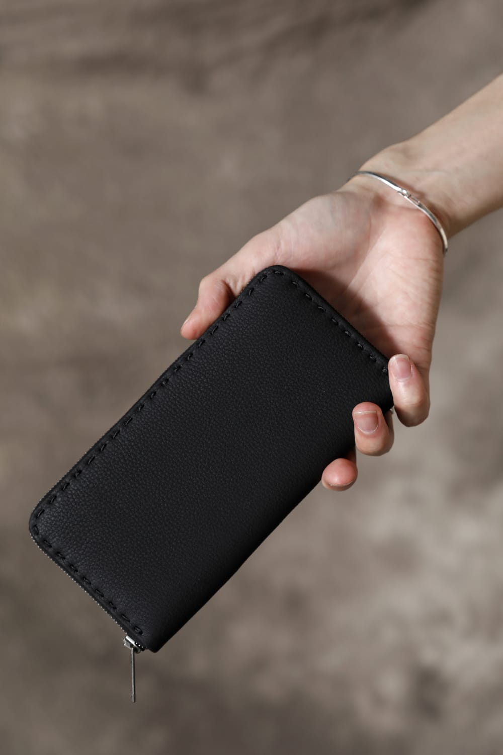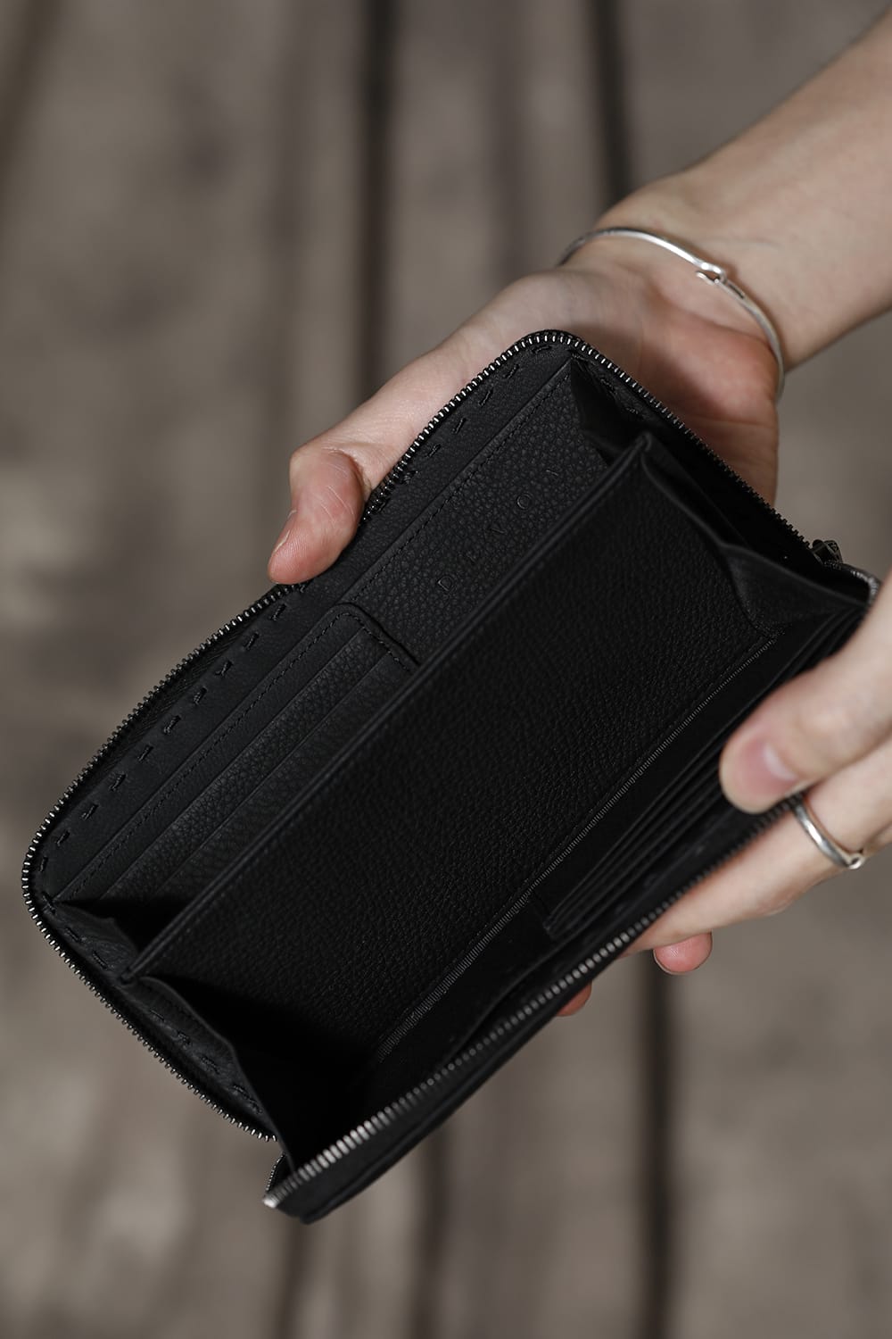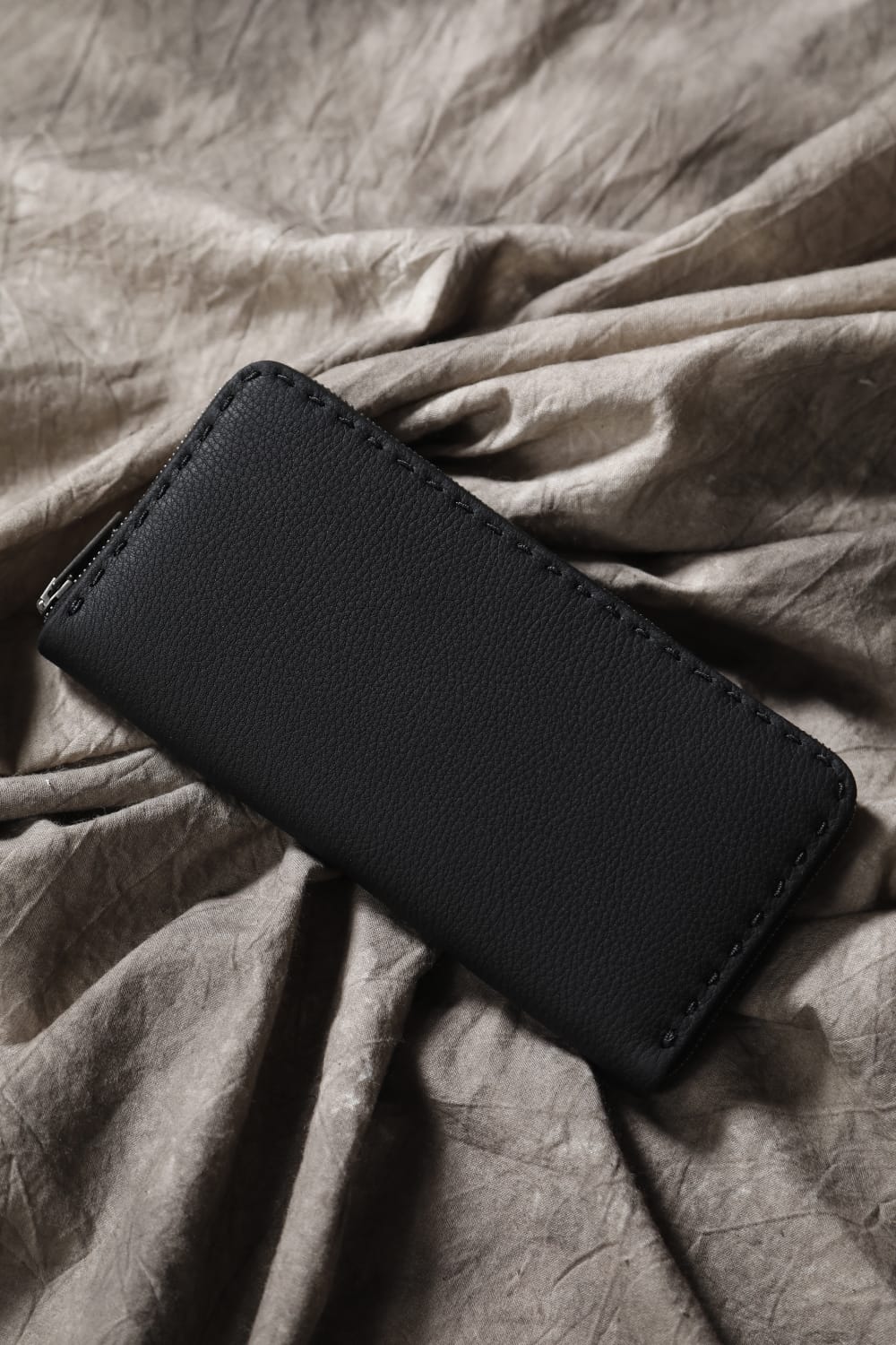 長財布にしては少し小さいサイズ感のラウンドファスナーのロングウォレット。ファスナーの外側はハンドステッチで丁寧しに仕上げています。 内部は中央に小銭を入れるスペースがあり、左右の外側にフリーポケットが1箇所ずつ、左右非対称につけられたカード入れが8箇所ついています。 マチが大きいため中が見やすく、取り出しやすい構造になっています。 ファスナーはイタリアのラッカーニ社製コイルファスナー。このコイルファスナーは止水ジップのように表にファスナーのムシ部分が見えない仕様です。 使用しているレザーは「Du puy/デュプイ」社のバブルカーフレザーを使用。1948年創業のフランス・オーヴェルニュ地方にあるこのタンナーは世界最高峰のタンナーとして広く知られており、有名なメゾンブランドへも革を提供しています。 マットな色目が落ち着いた上品な面持ちのブラック。繊維がキメ細かく密で型崩れしにくく、モチっとした手触りの上質なレザーです。
