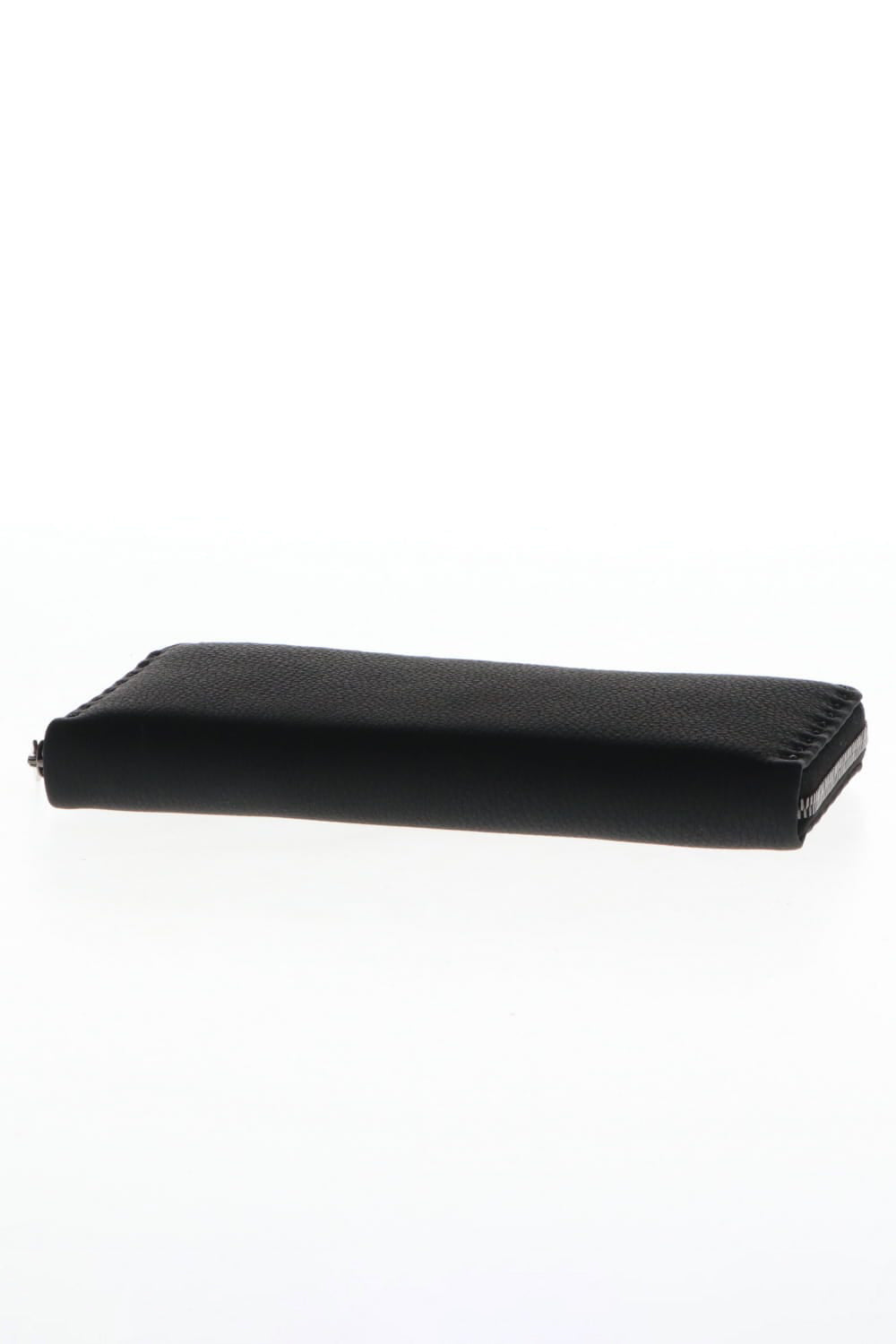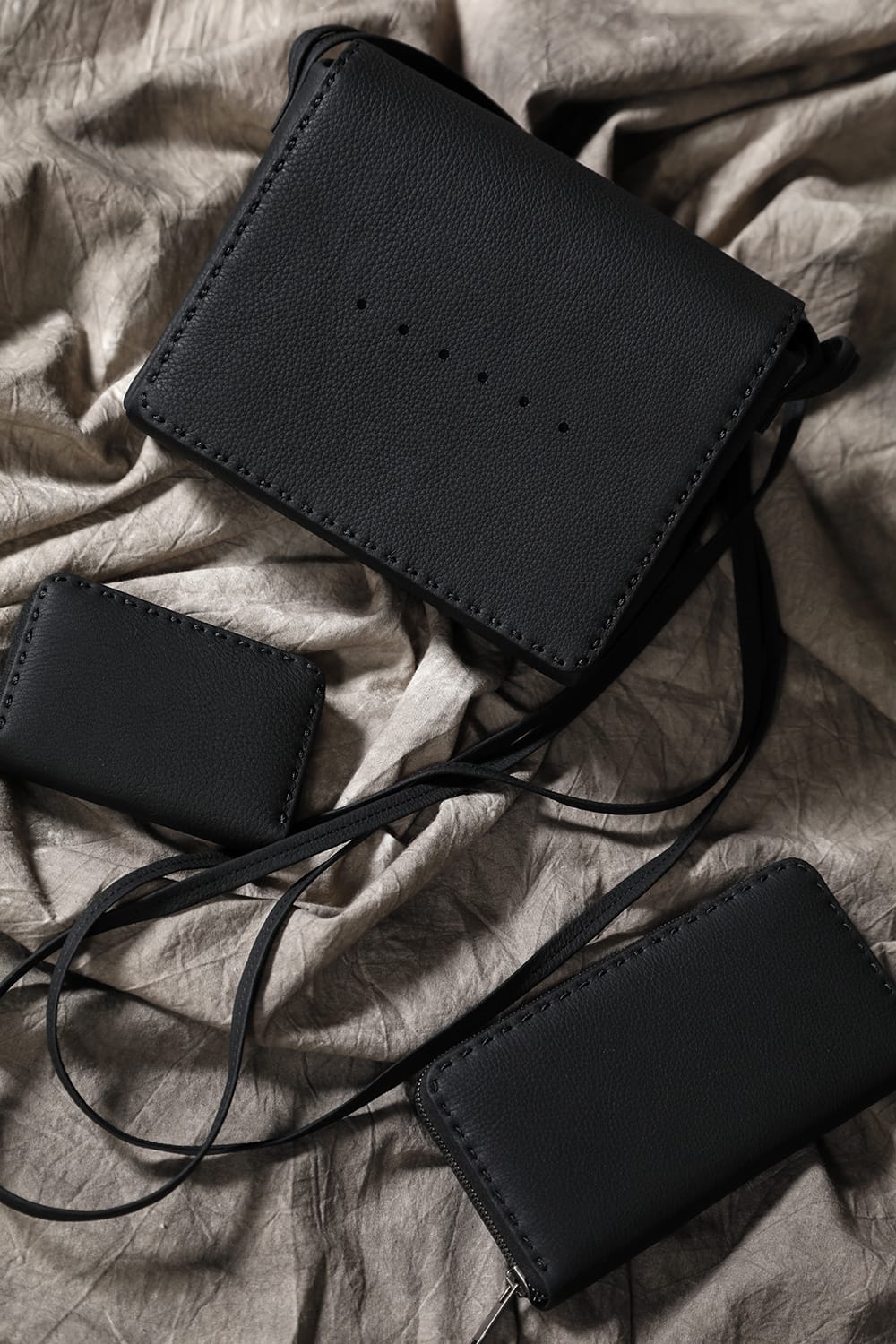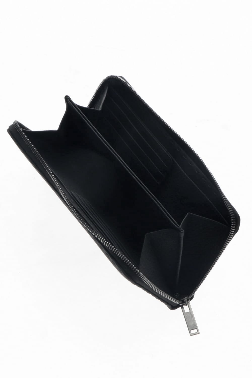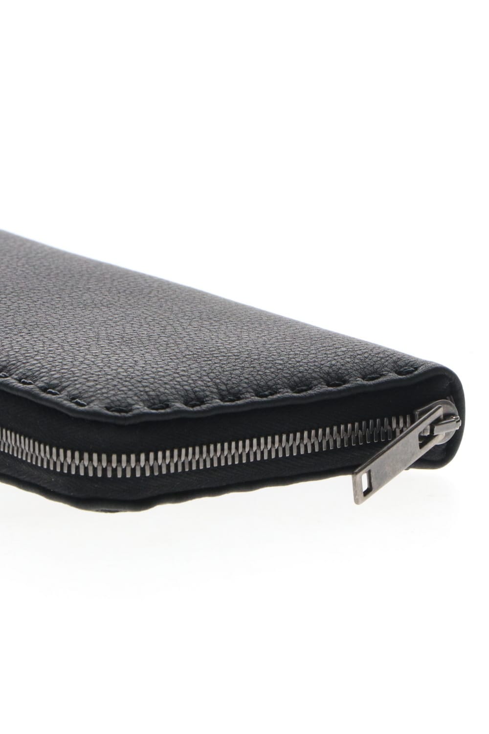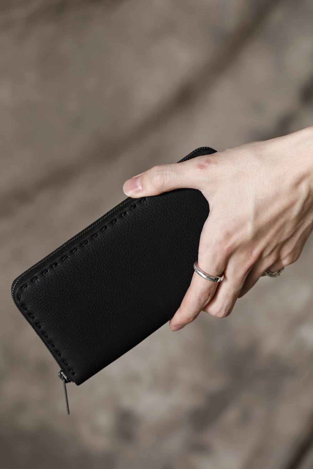 長財布にしては少し小さいサイズ感のラウンドファスナーのロングウォレット。ファスナーの外側はハンドステッチで丁寧しに仕上げています。 内部は中央に小銭を入れるスペースがあり、左右の外側にフリーポケットが1箇所ずつ、左右非対称につけられたカード入れが8箇所ついています。 マチが大きいため中が見やすく、取り出しやすい構造になっています。 ファスナーはイタリアのラッカーニ社製コイルファスナー。このコイルファスナーは止水ジップのように表にファスナーのムシ部分が見えない仕様です。 使用しているレザーは「Du puy/デュプイ」社のバブルカーフレザーを使用。1948年創業のフランス・オーヴェルニュ地方にあるこのタンナーは世界最高峰のタンナーとして広く知られており、有名なメゾンブランドへも革を提供しています。 マットな色目が落ち着いた上品な面持ちのブラック。繊維がキメ細かく密で型崩れしにくく、モチっとした手触りの上質なレザーです。