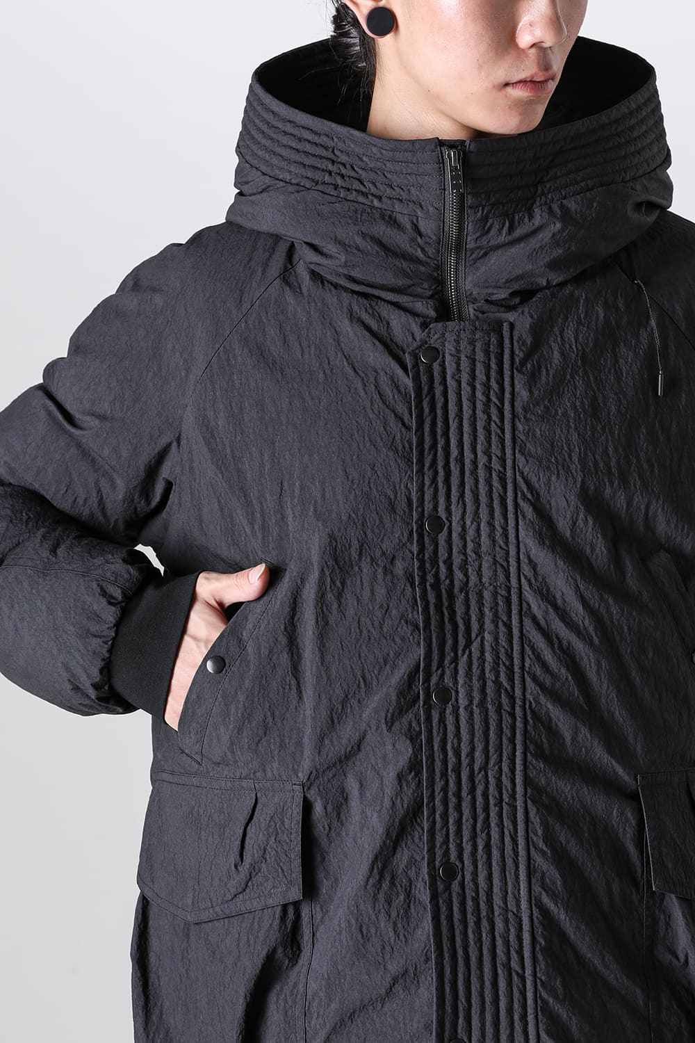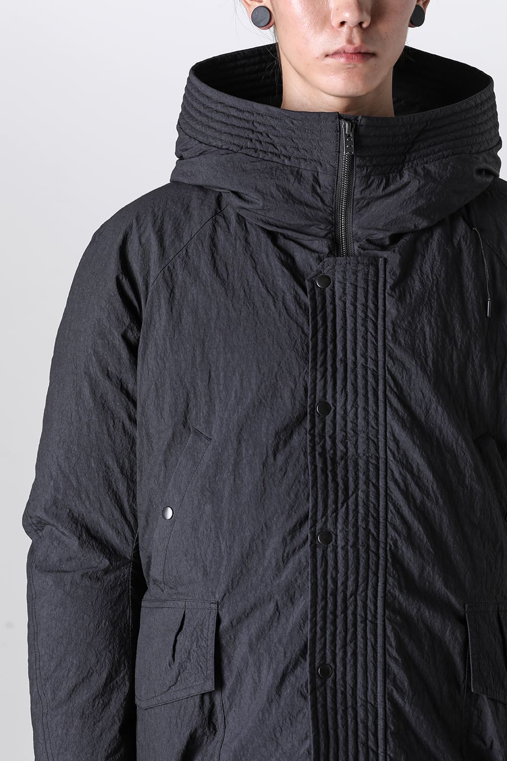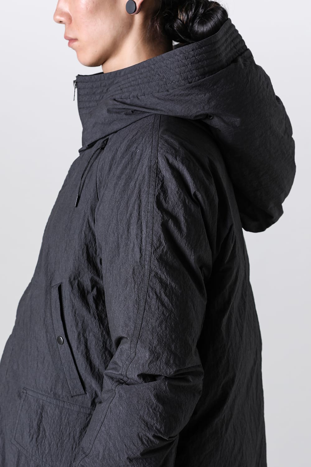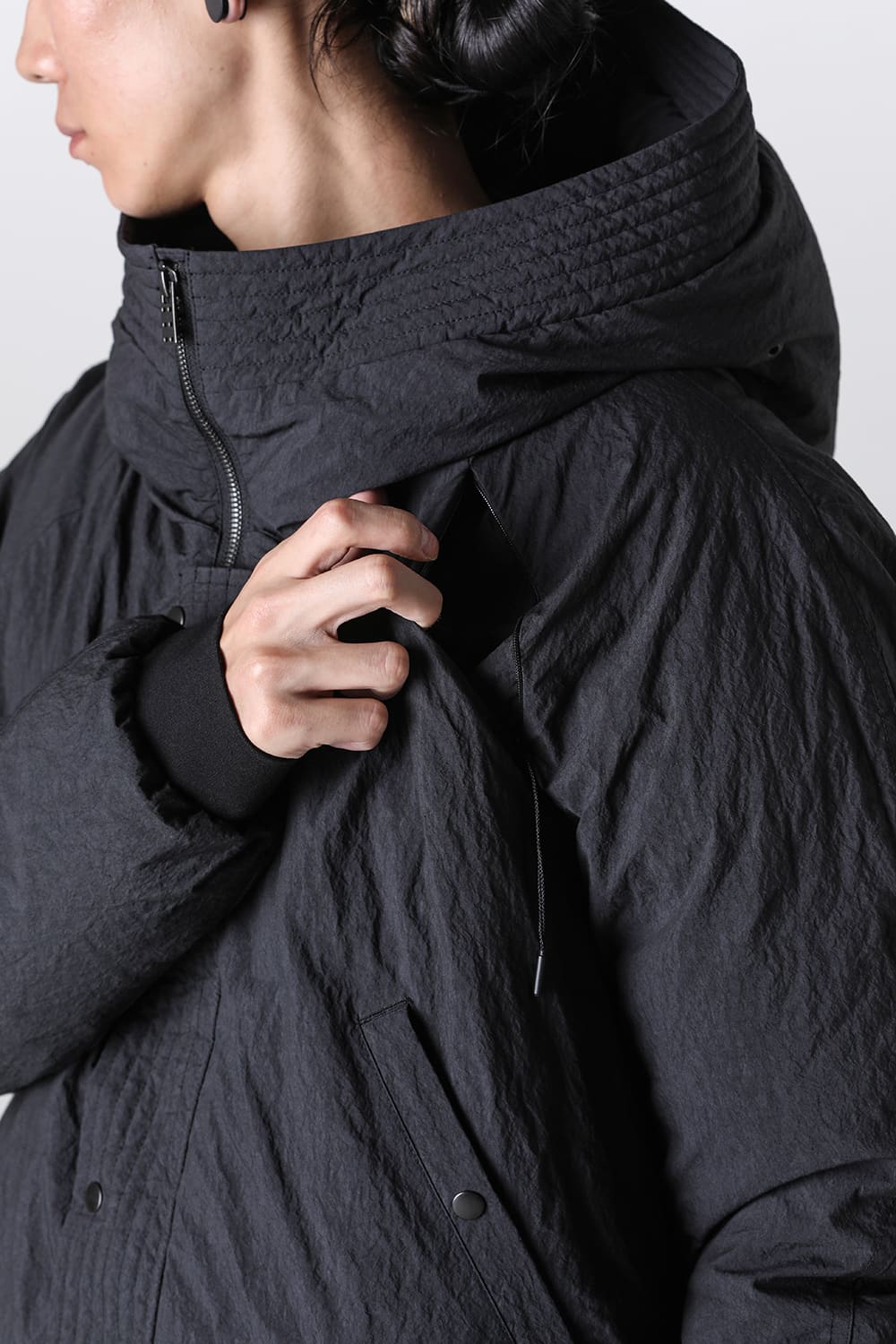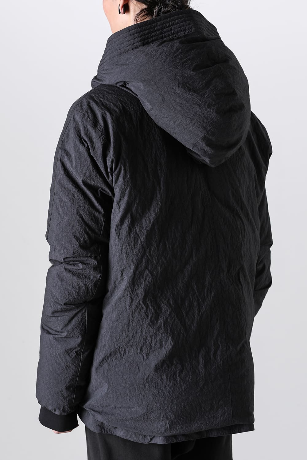 綿とナイロンの高密度織物にシワ加工を施し独特の表情をつけています。