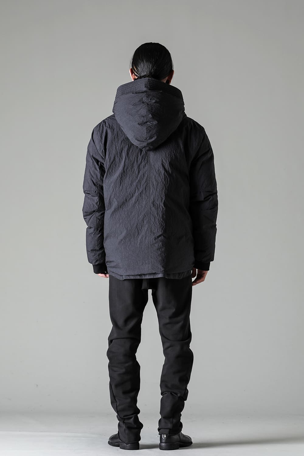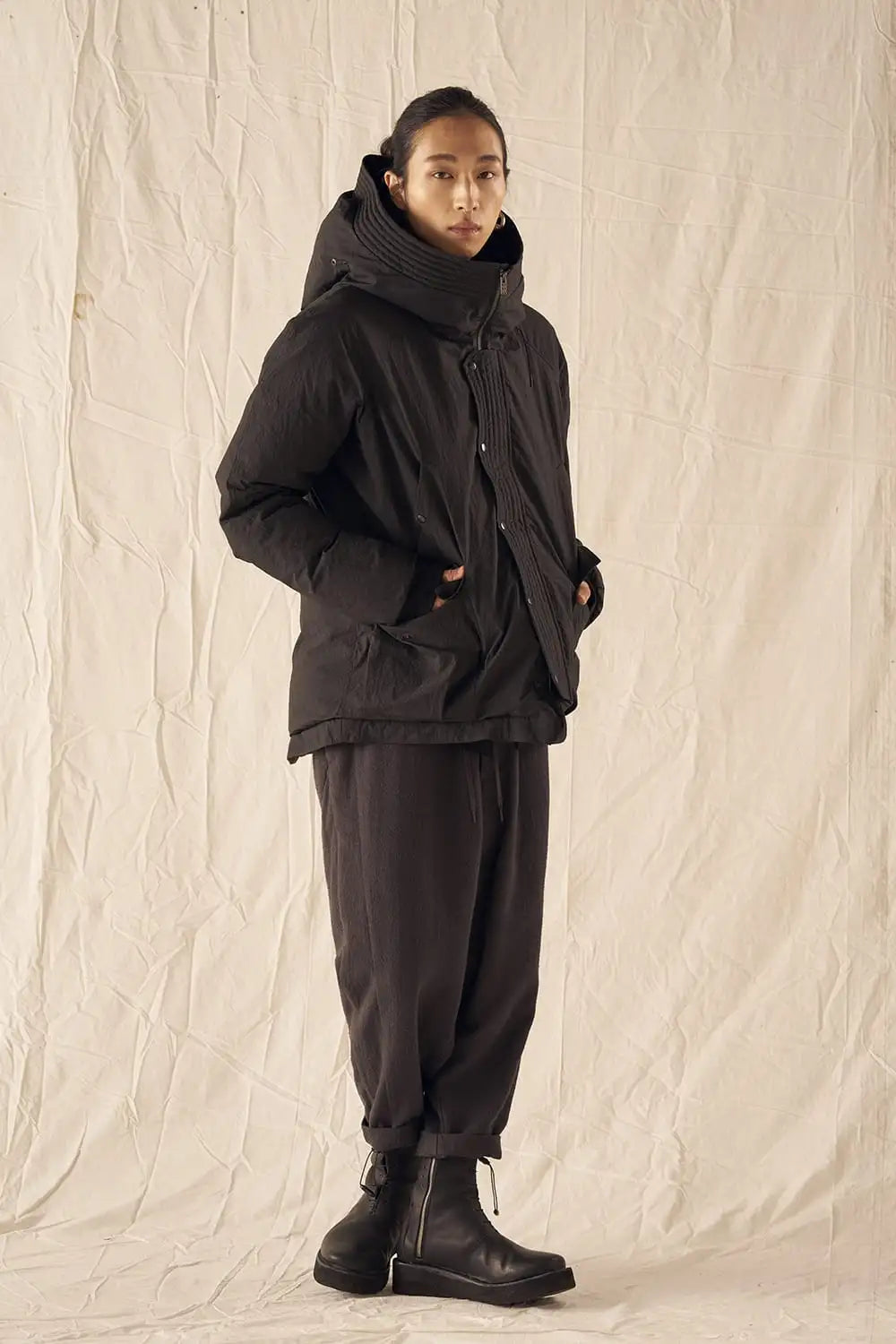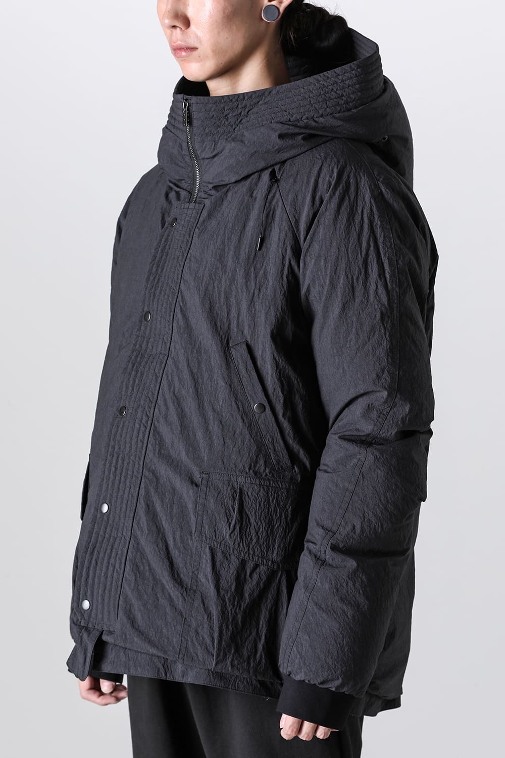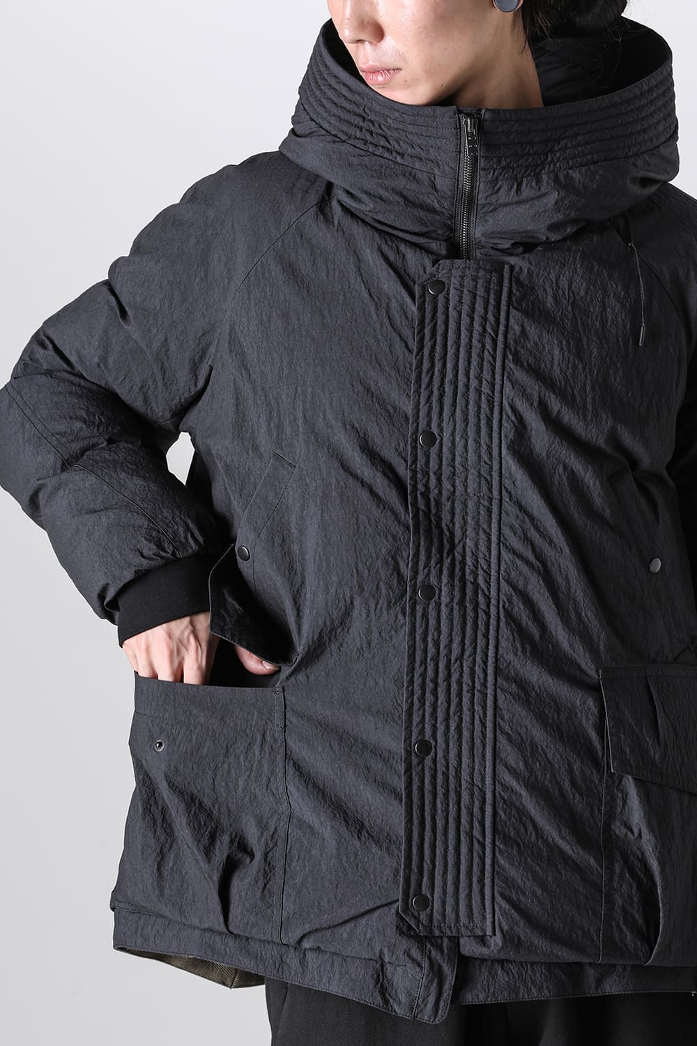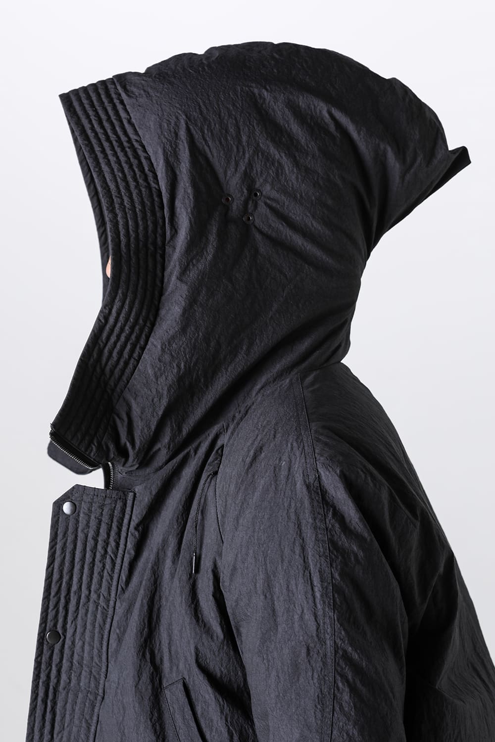 綿とナイロンの高密度織物にシワ加工を施し独特の表情をつけています。