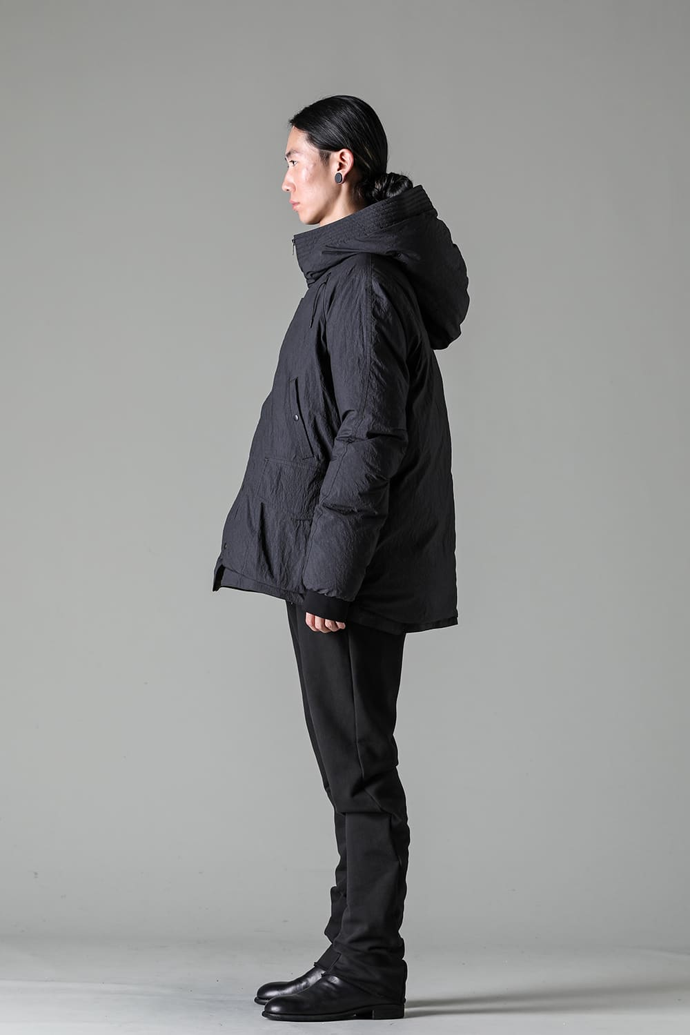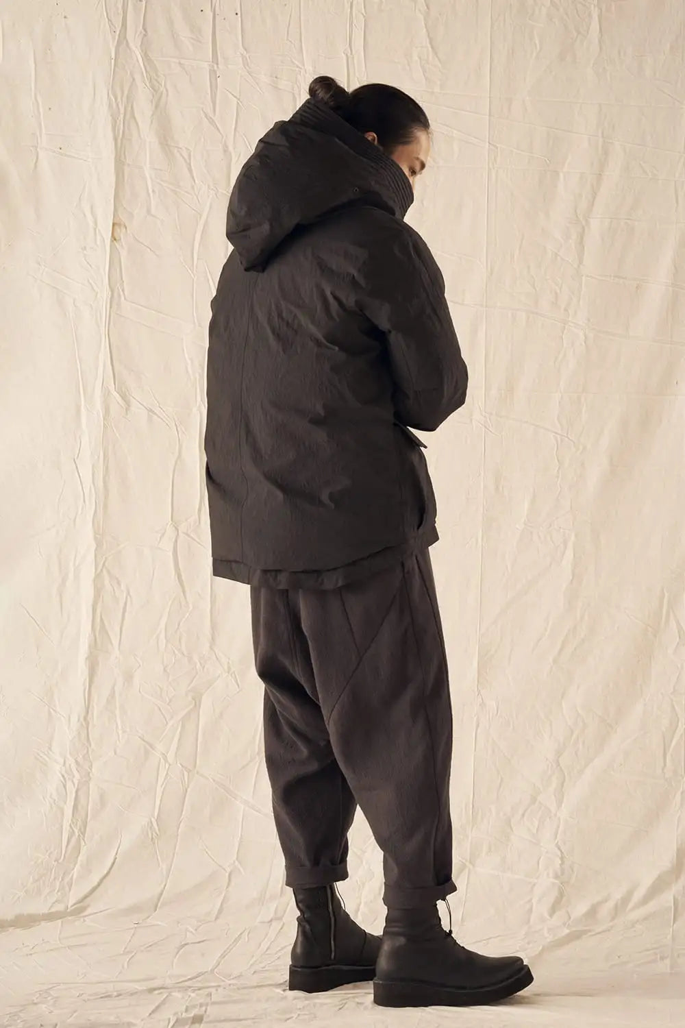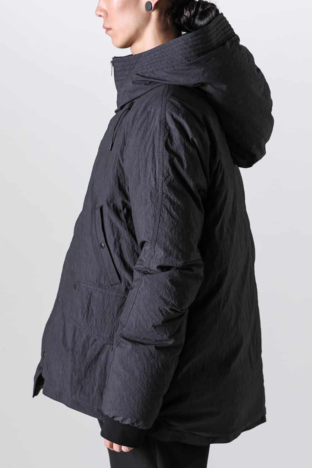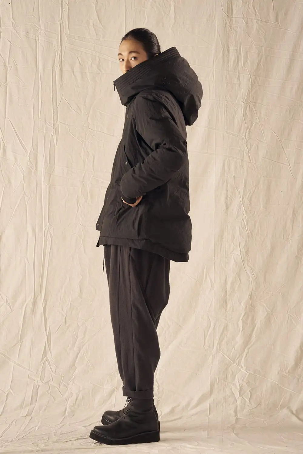 綿とナイロンの高密度織物にシワ加工を施し独特の表情をつけています。