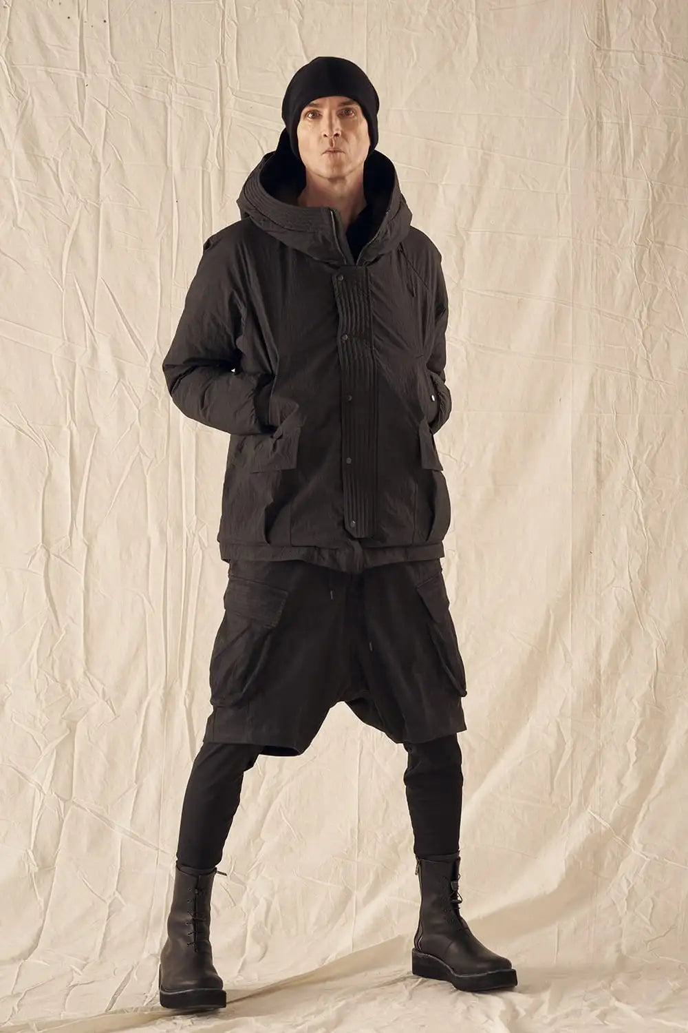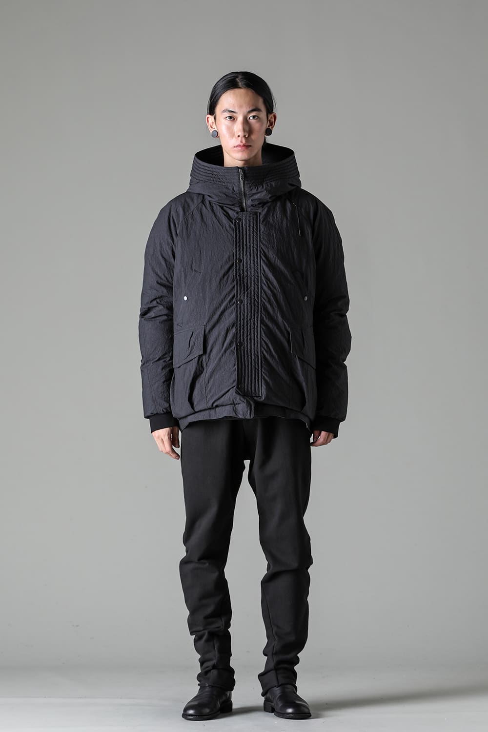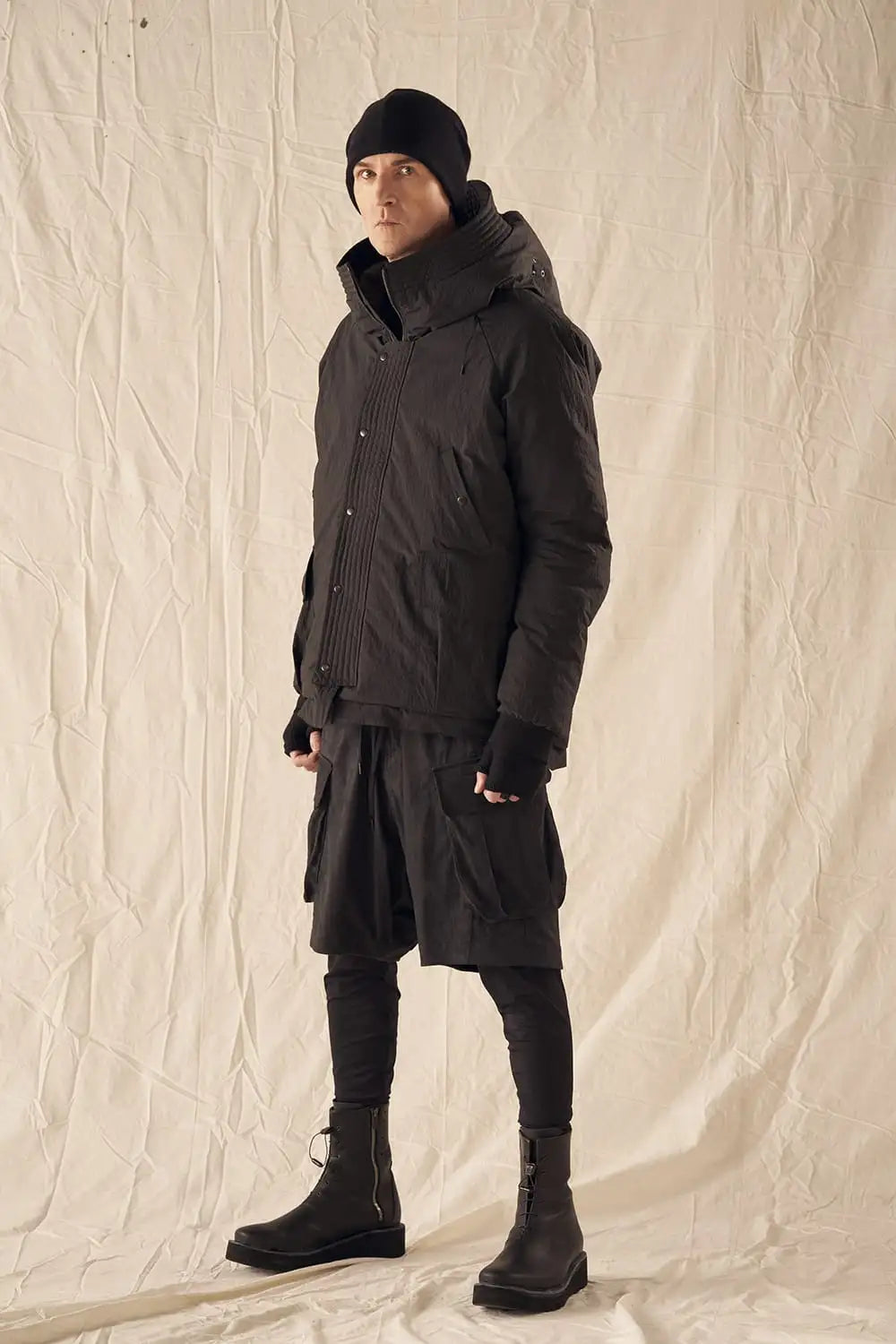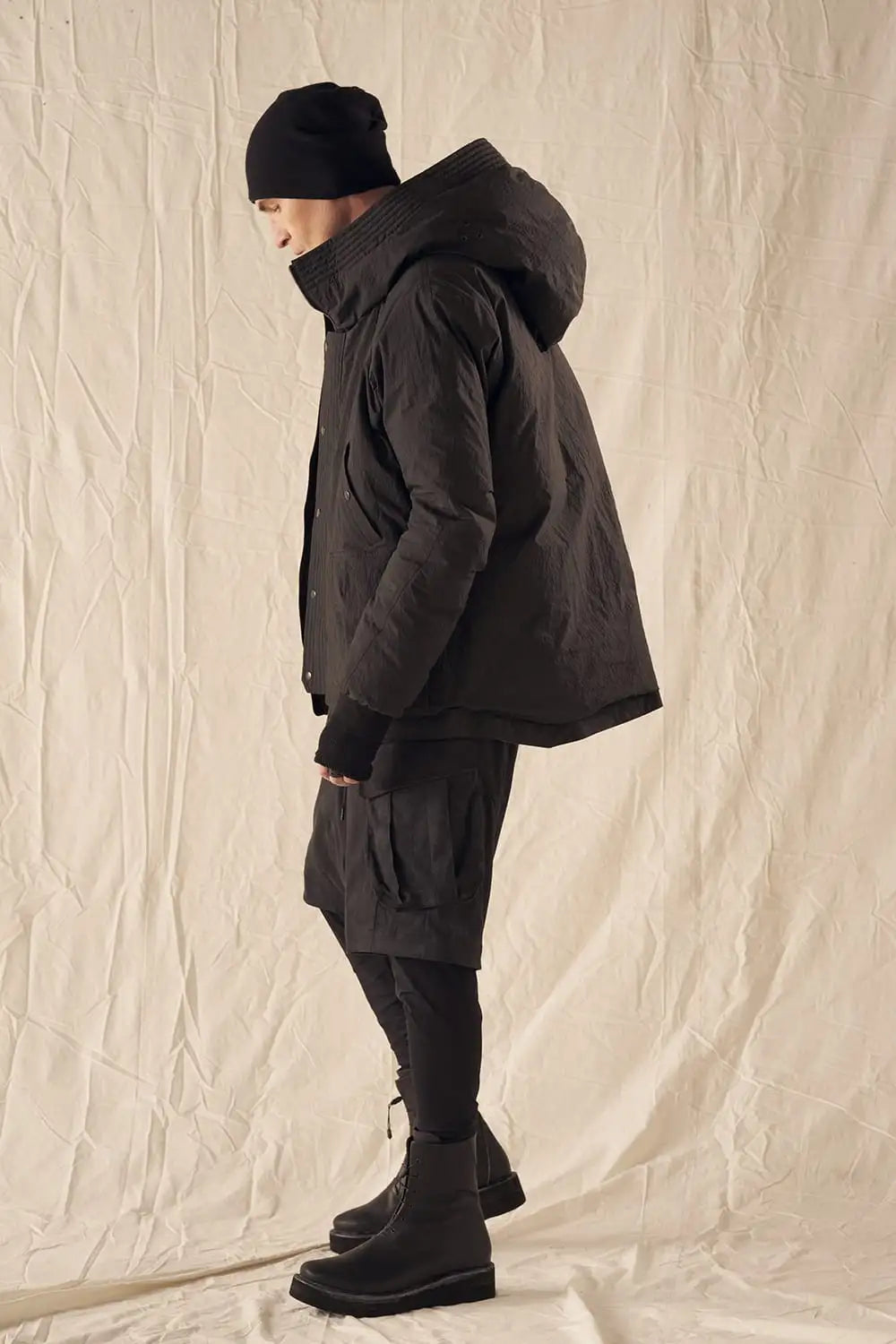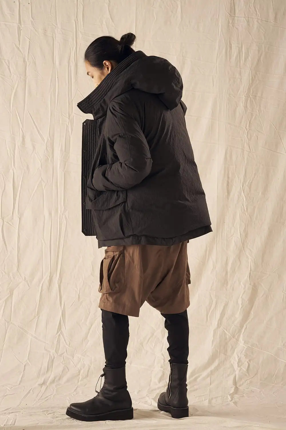 綿とナイロンの高密度織物にシワ加工を施し独特の表情をつけています。
