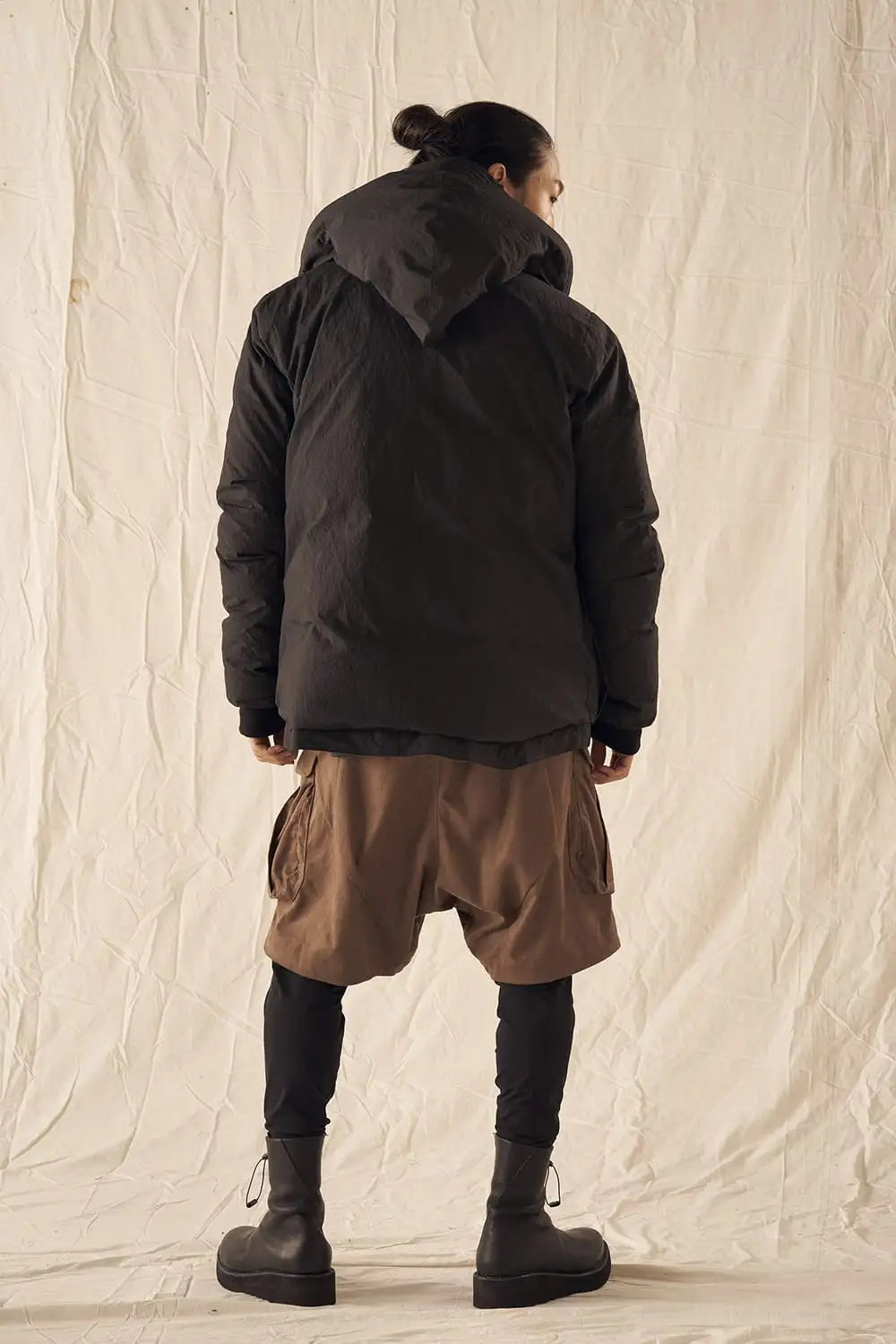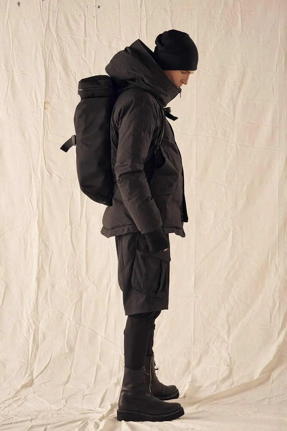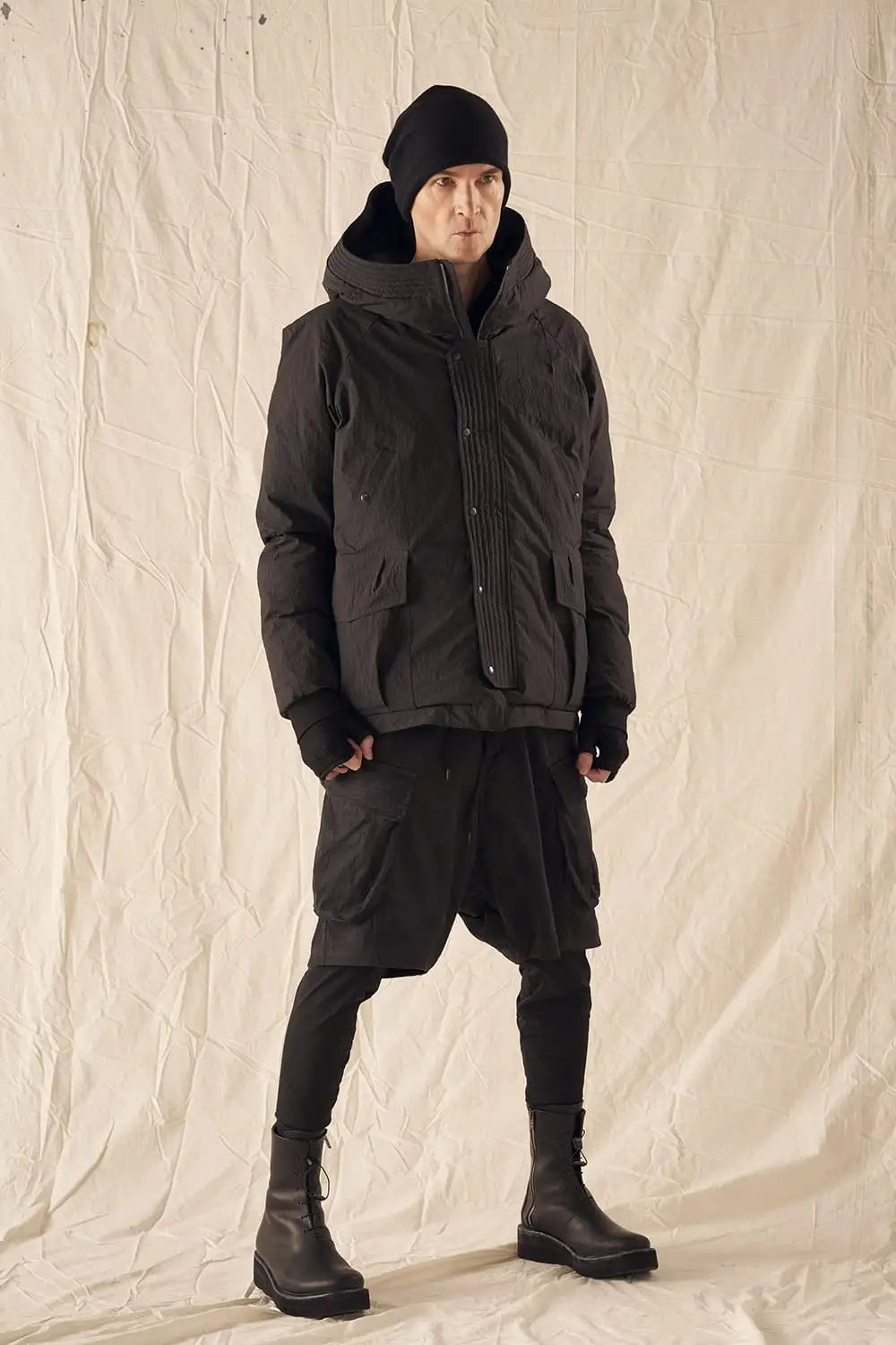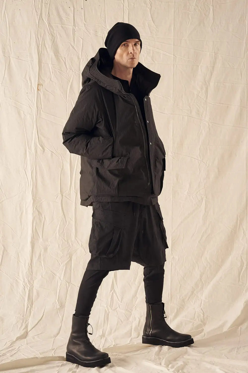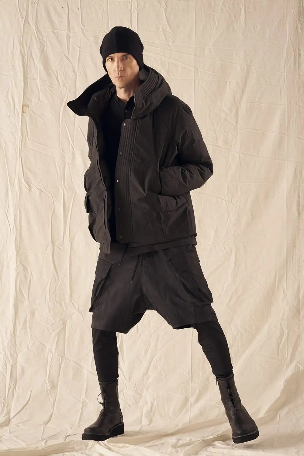 綿とナイロンの高密度織物にシワ加工を施し独特の表情をつけています。