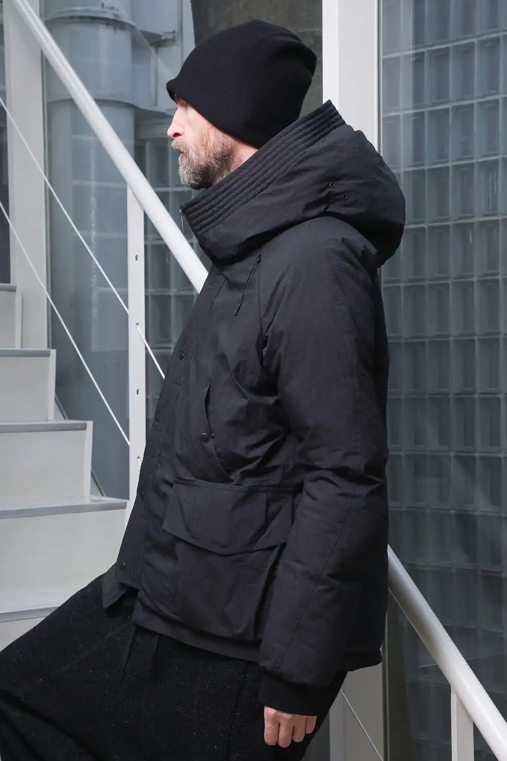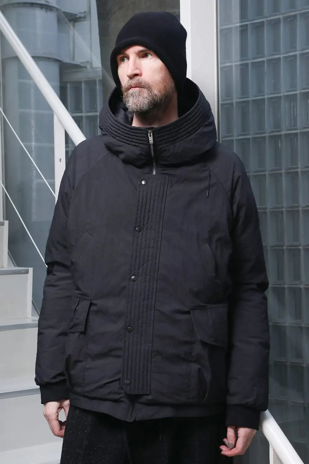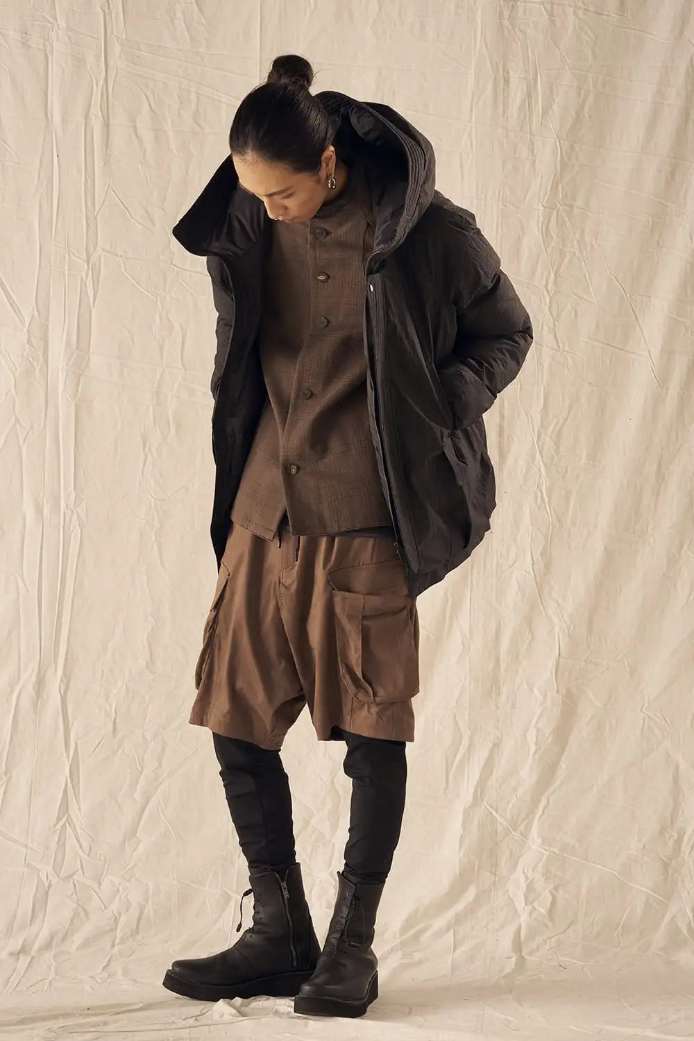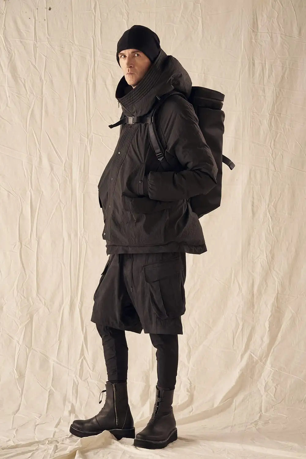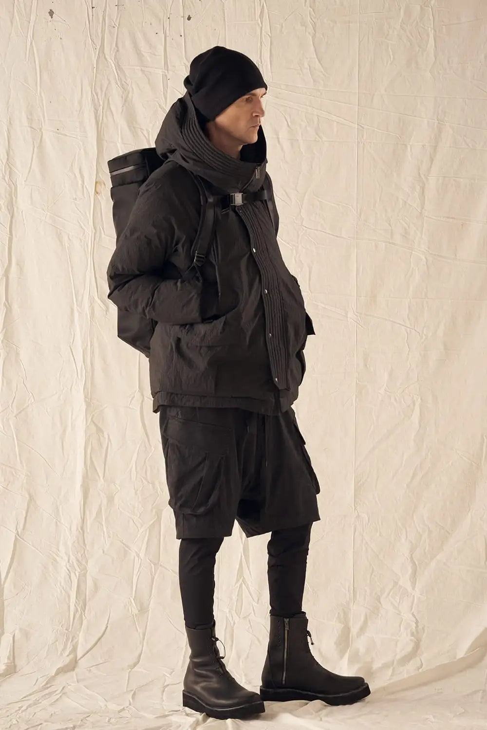 綿とナイロンの高密度織物にシワ加工を施し独特の表情をつけています。