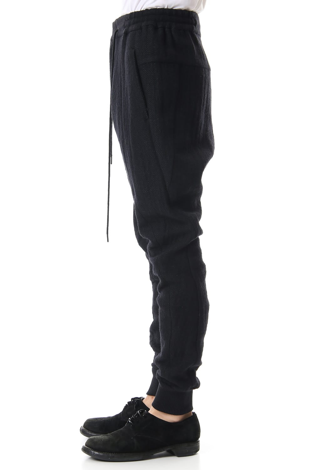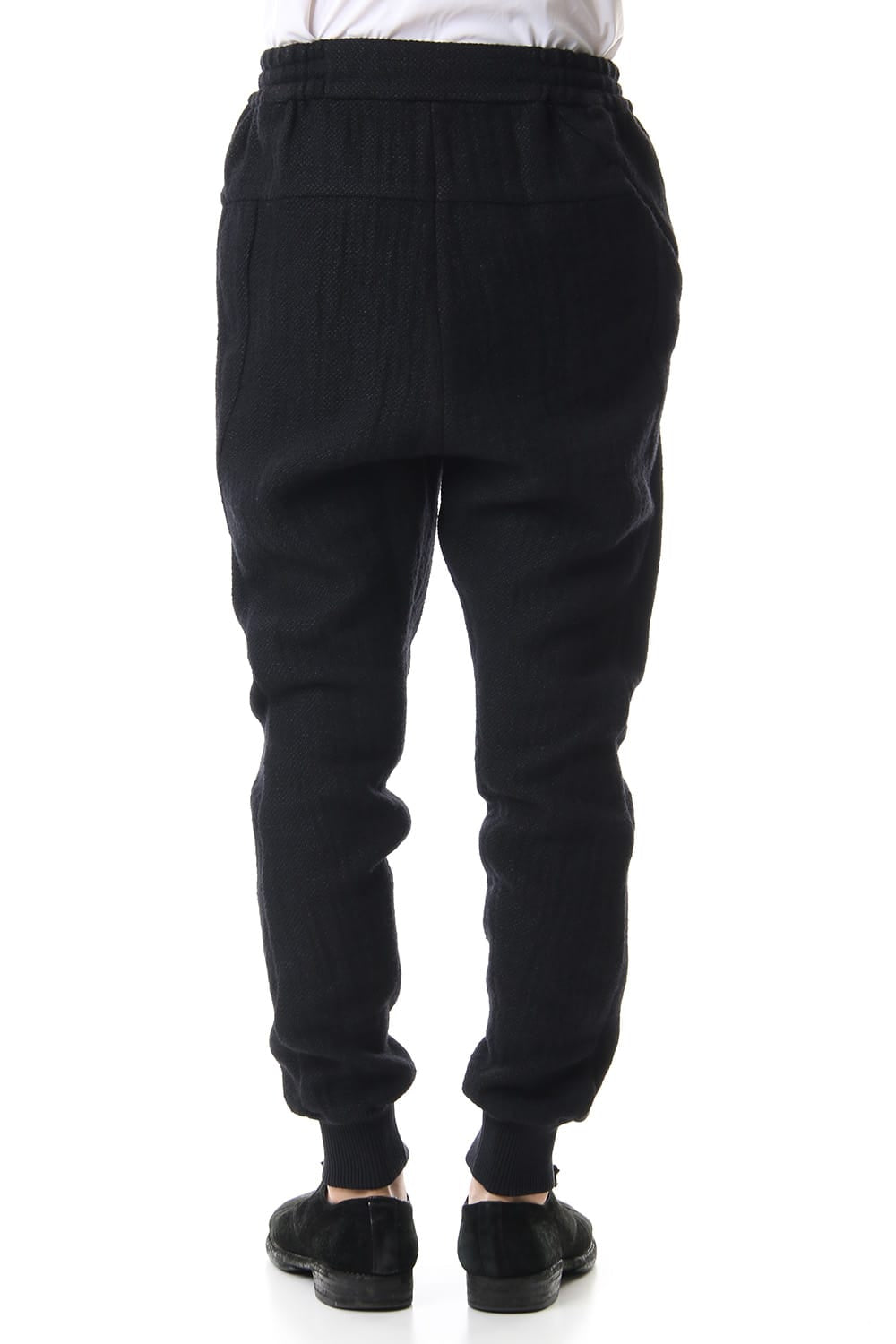 生地はウールリネンの組織と綿の組織を接結したダブルフェイス生地を用いたジョガーパンツ。