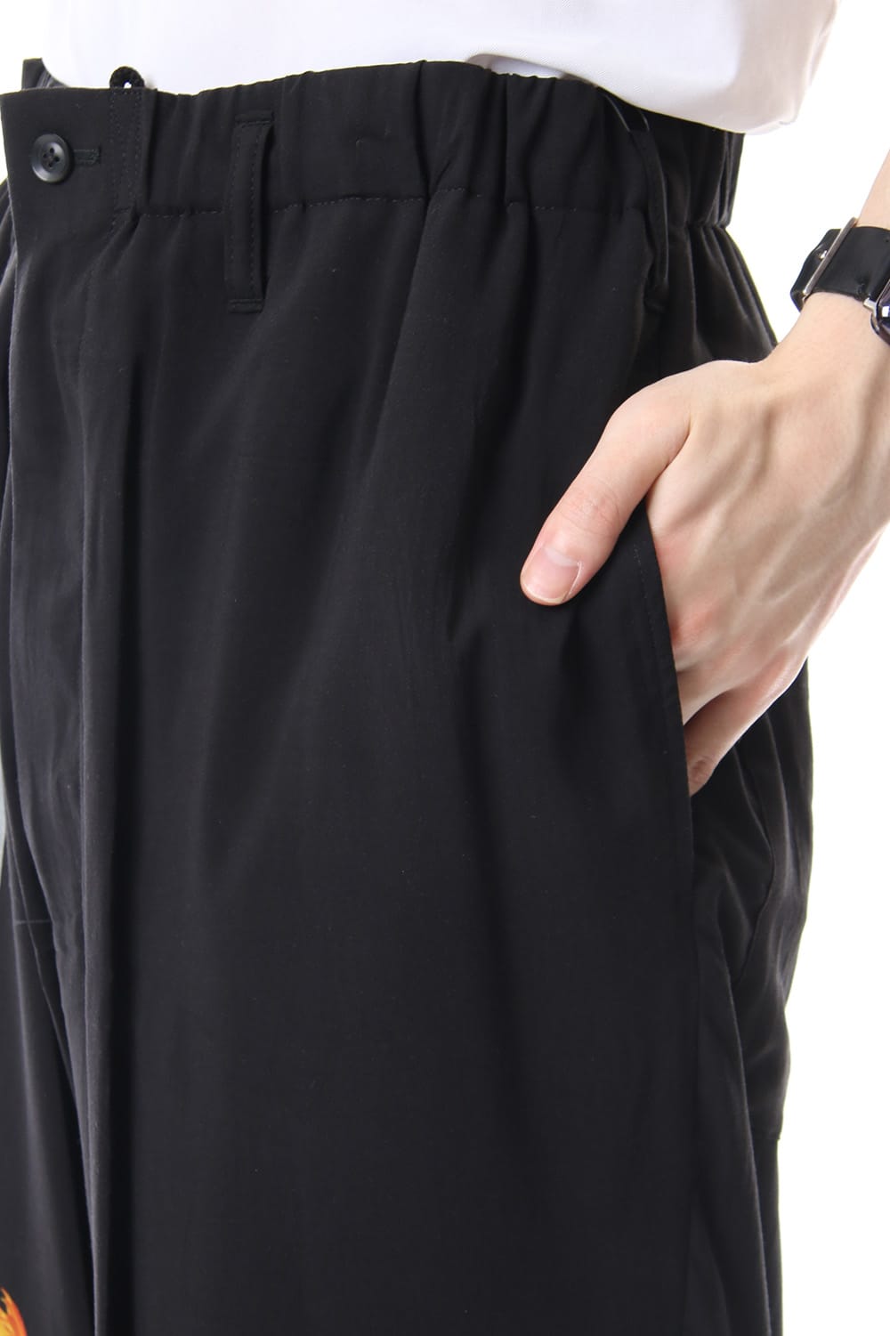 ランウェイLOOK32にて着用されていた全体にグラフィクプリントが施されたウエストゴムタイプの紐パン。 生地は非常にライトなレーヨンローンを使用しており、夏でも着用可能なアイテムとなっております。