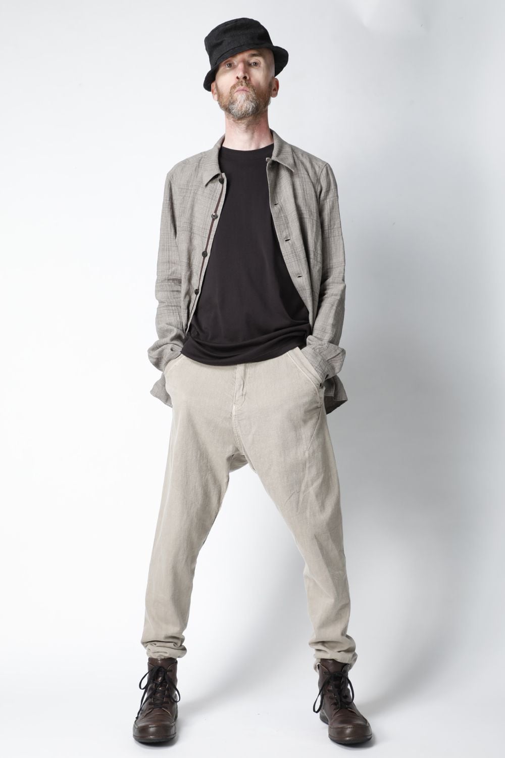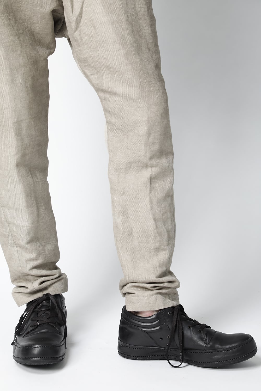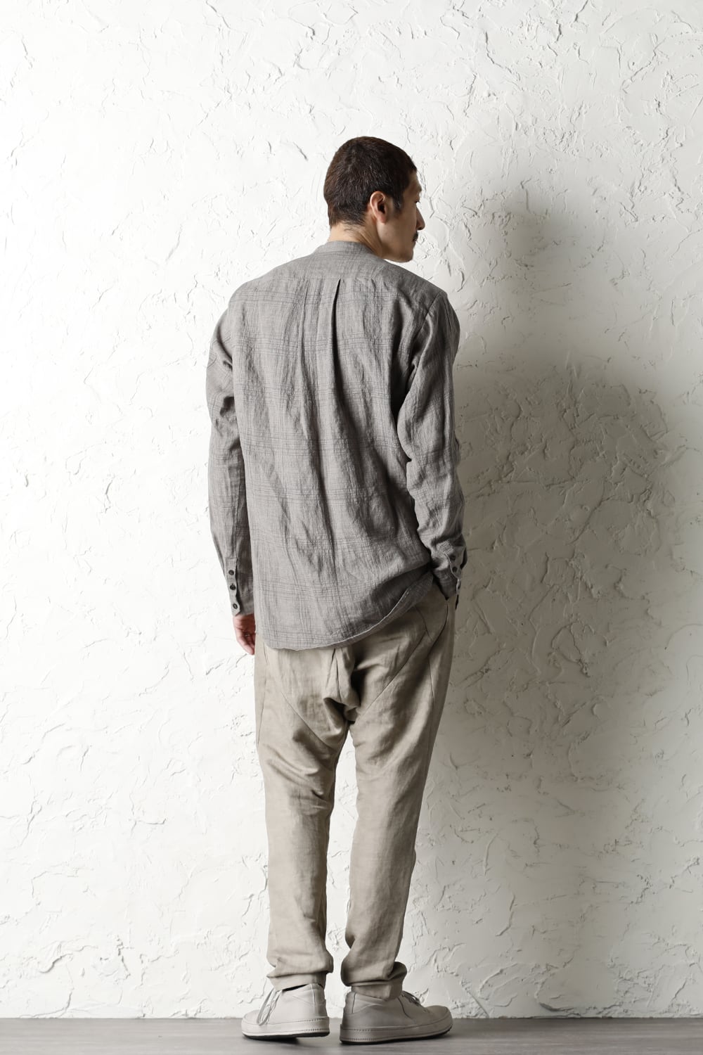 股上を深く取り、独自のパターンで裾に向かって細くテーバードするシルエットのドロップクロッチパンツ。適度なゆるさがあるリラックスシルエットになります。
