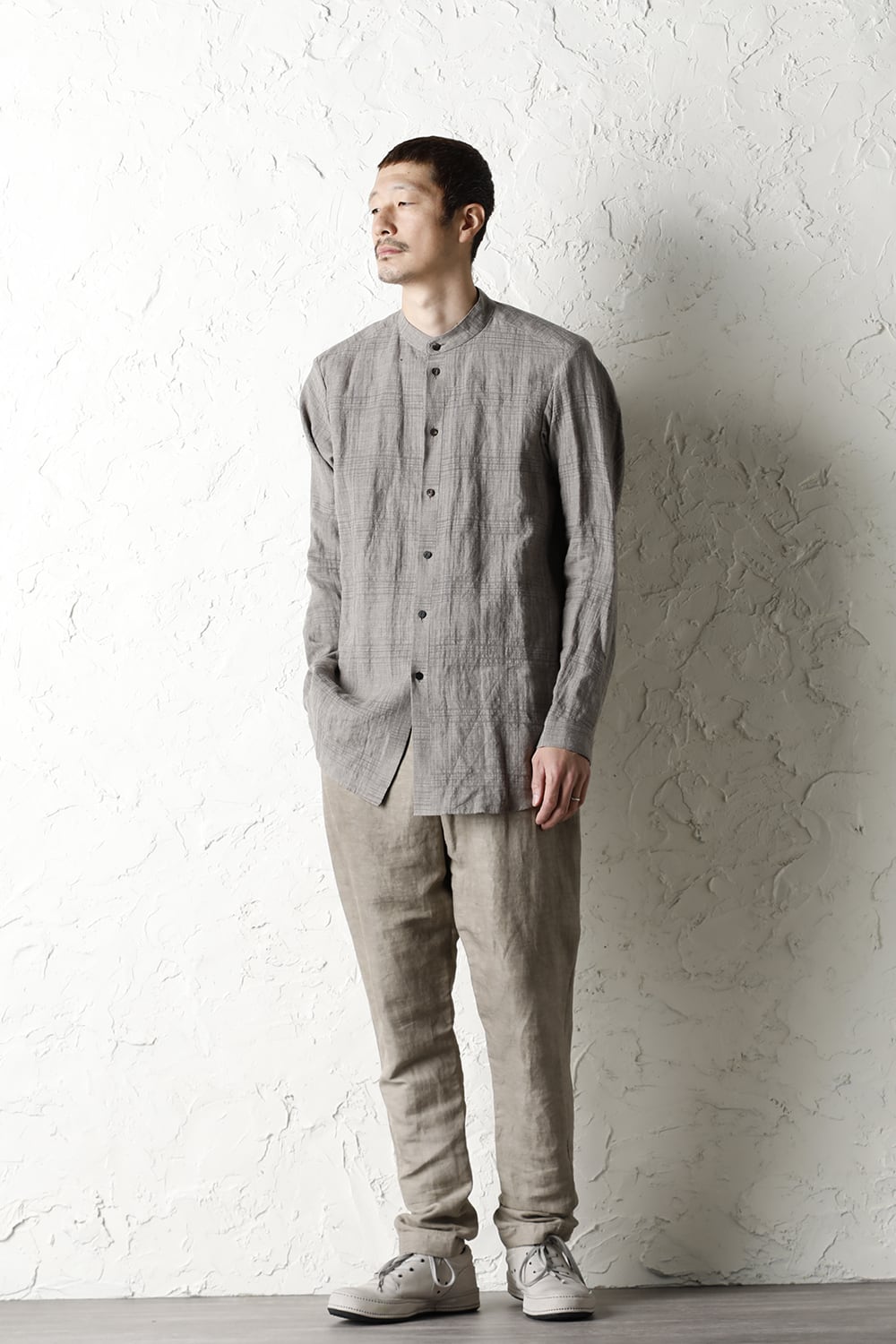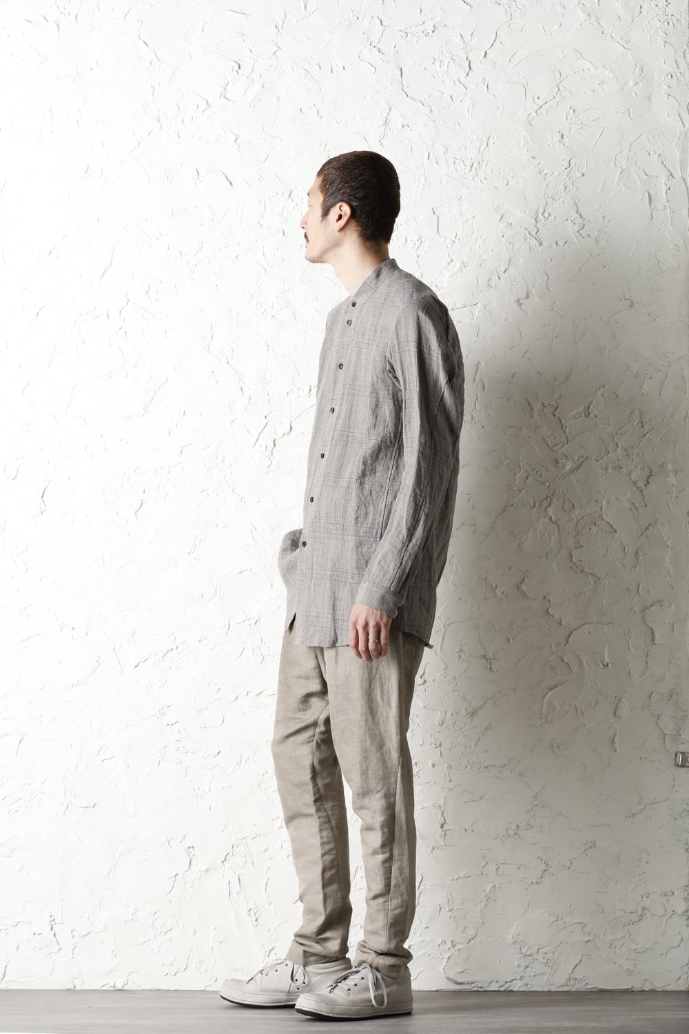 生地はイタリア・Faliero Sarti(ファリエロサルティ)社で制作したコットン、ラミー 、カナパ (ヘンプ) の混紡生地。その生地をイタリアの伝統技法の低温染め(ティントフレット)で生地染めしたのち、ゆっくりと天日乾燥して仕上げています。