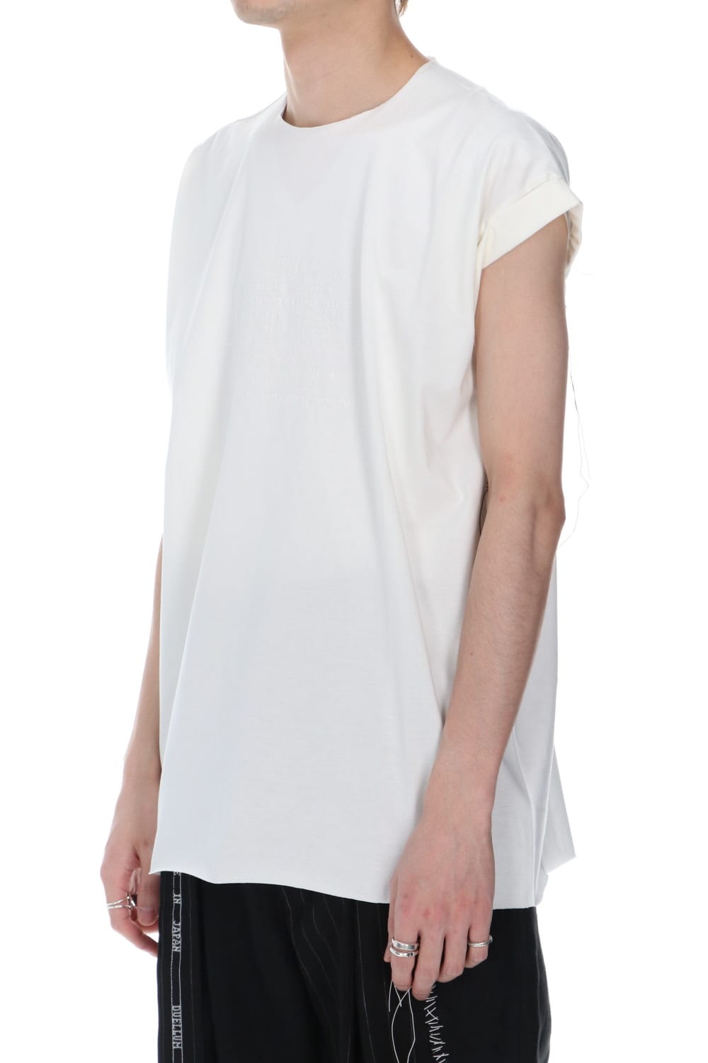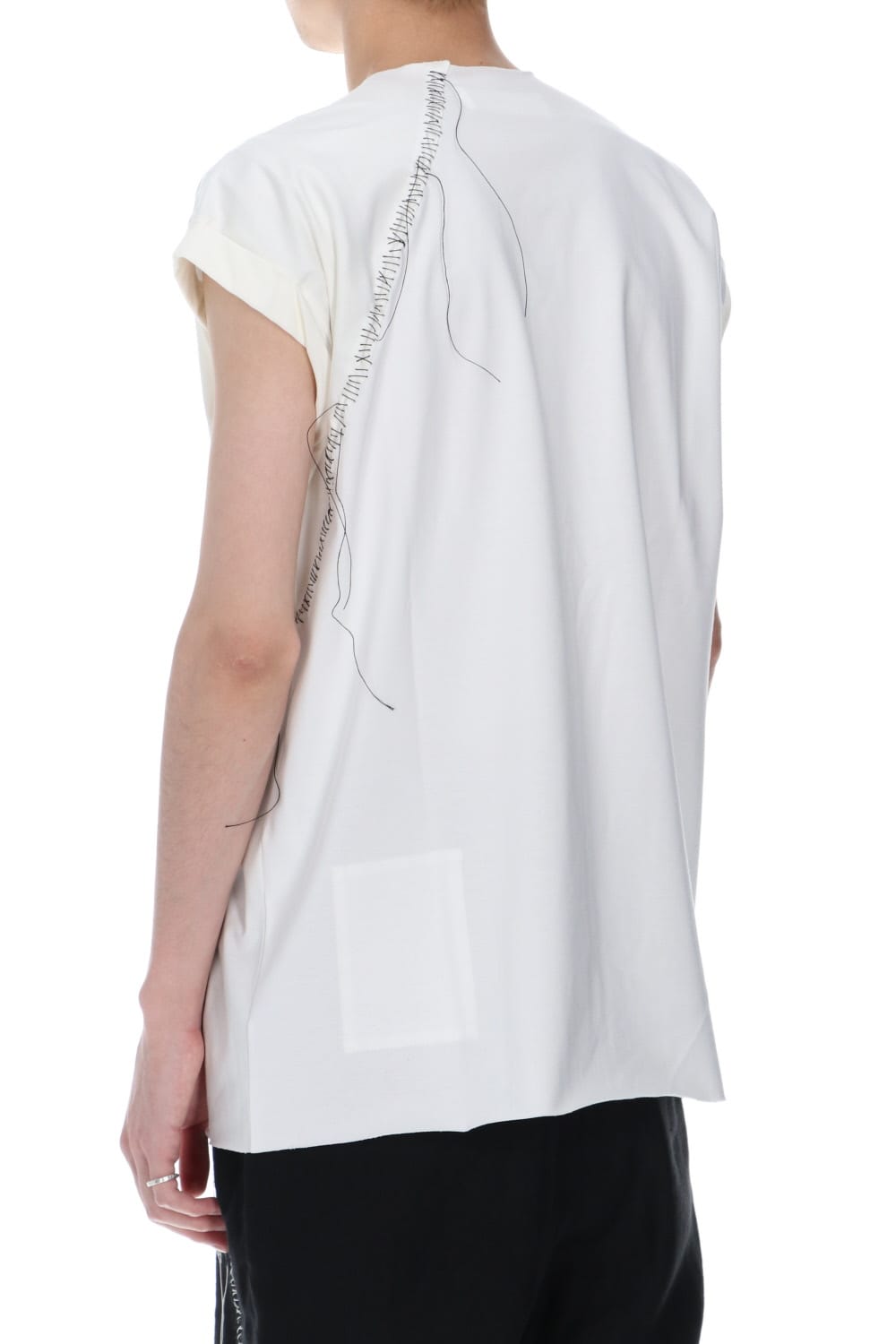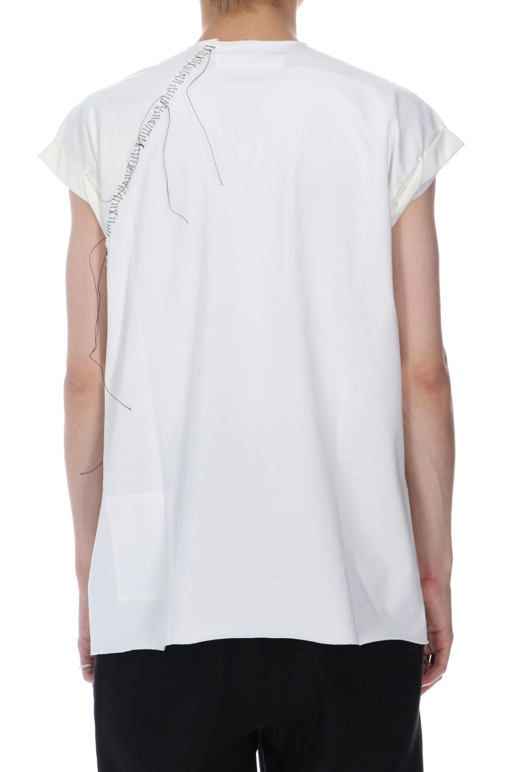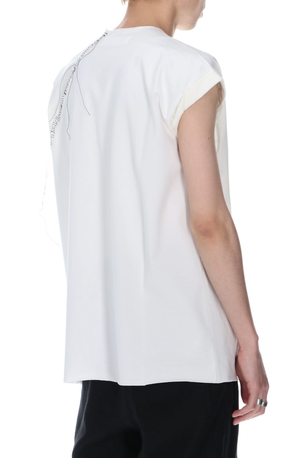 袖をロールさせた状態でキープしたフレンチスリーブTシャツ。 ネックや裾先は断ち切りデザイン。 フロント中央には英字のエンブロイダリーデザインが施されています。 バックネックから左脇下にかけてブランドのシグニチャーデザインであるハンドステッチが施されています。 生地は滑らかですがハリコシのあるコットンジャージー素材です。