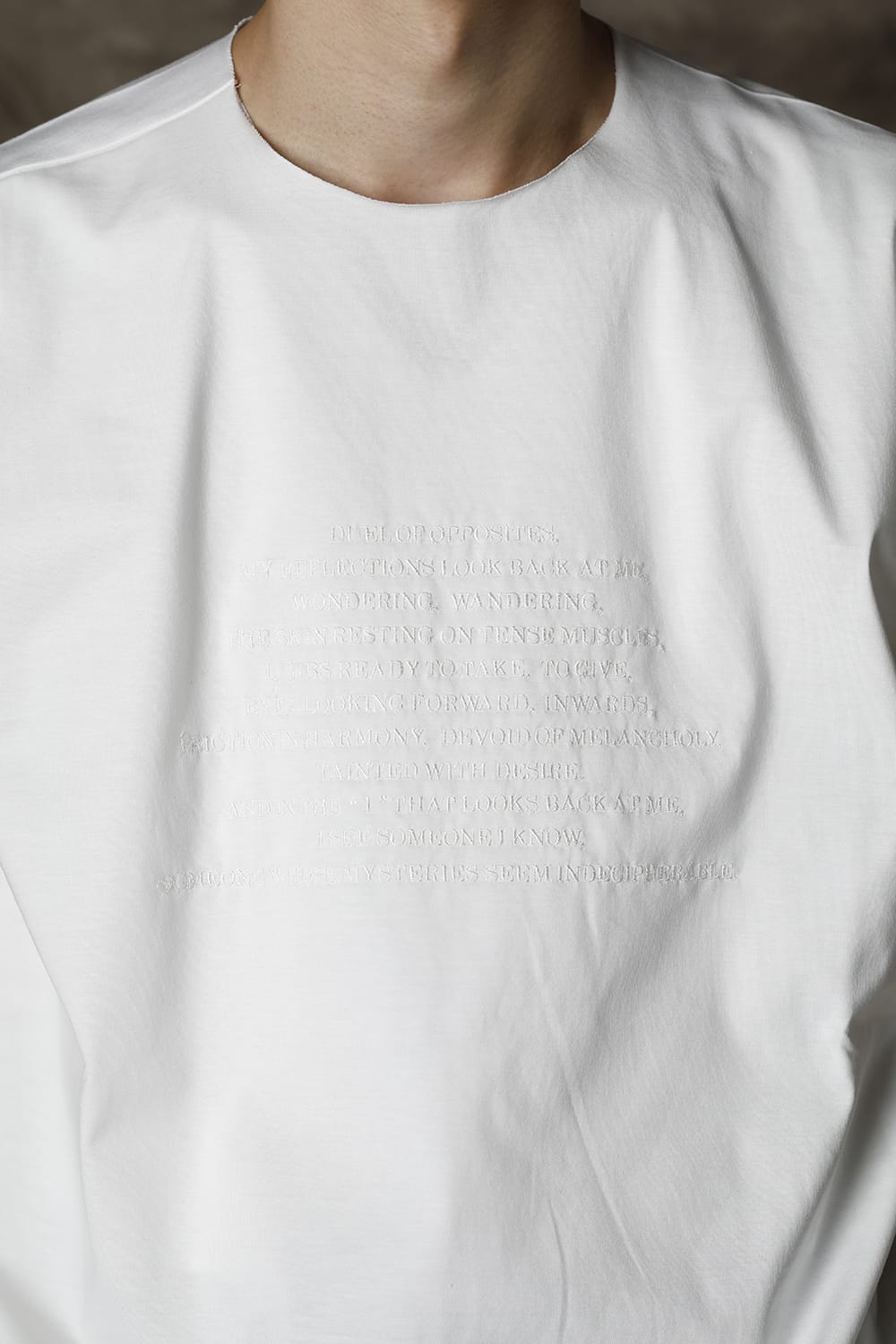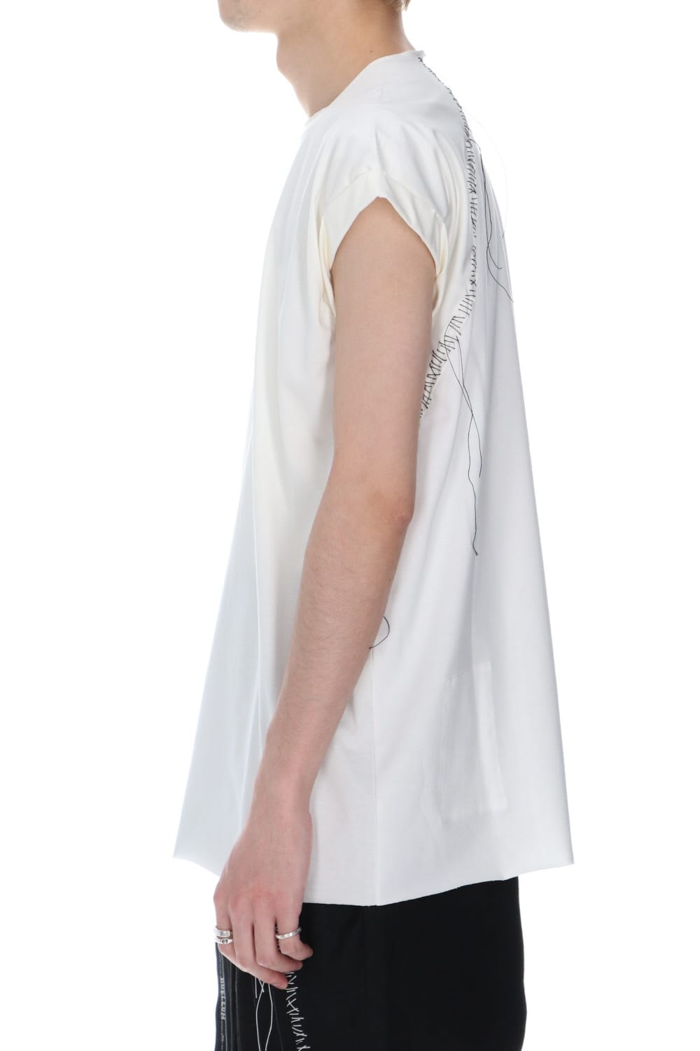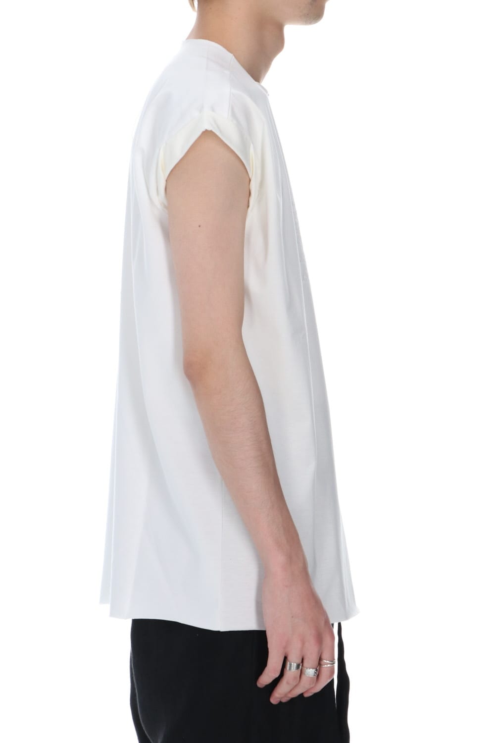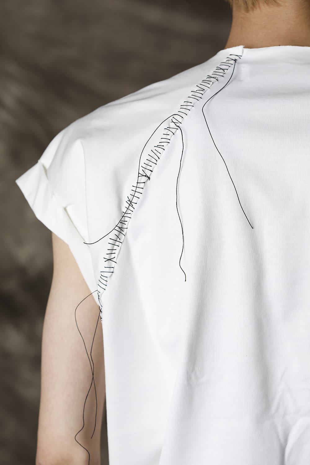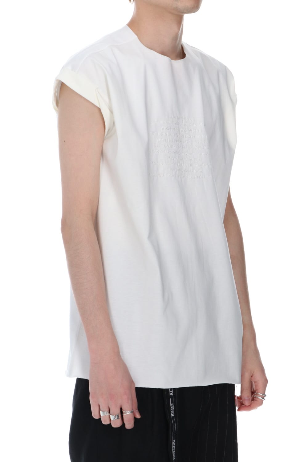 袖をロールさせた状態でキープしたフレンチスリーブTシャツ。 ネックや裾先は断ち切りデザイン。 フロント中央には英字のエンブロイダリーデザインが施されています。 バックネックから左脇下にかけてブランドのシグニチャーデザインであるハンドステッチが施されています。 生地は滑らかですがハリコシのあるコットンジャージー素材です。