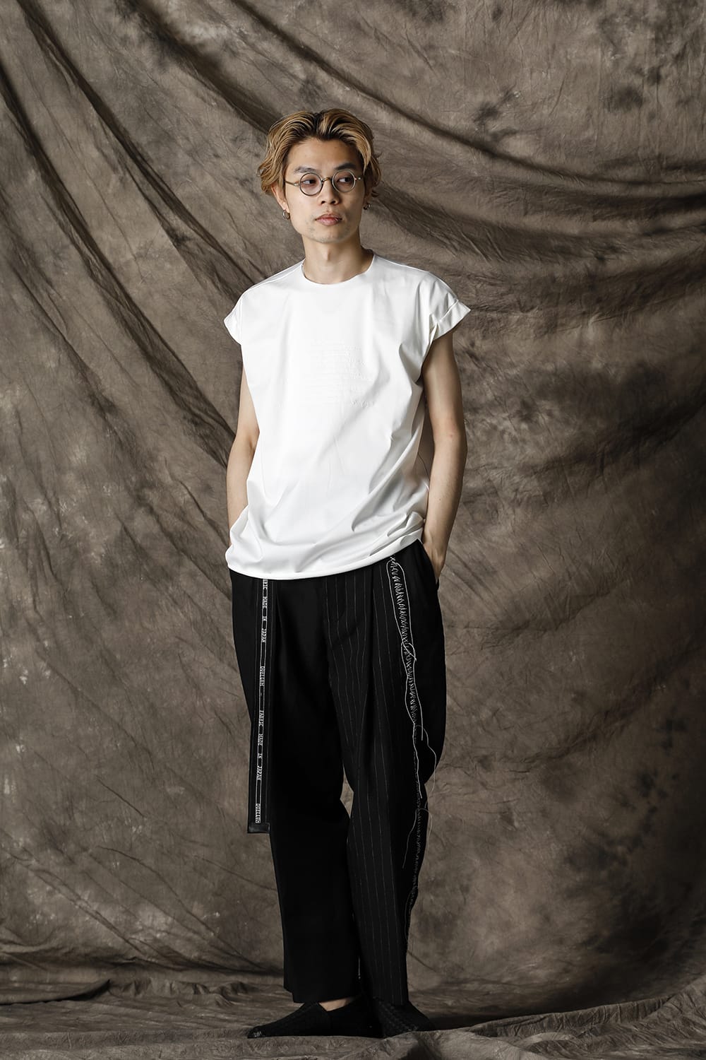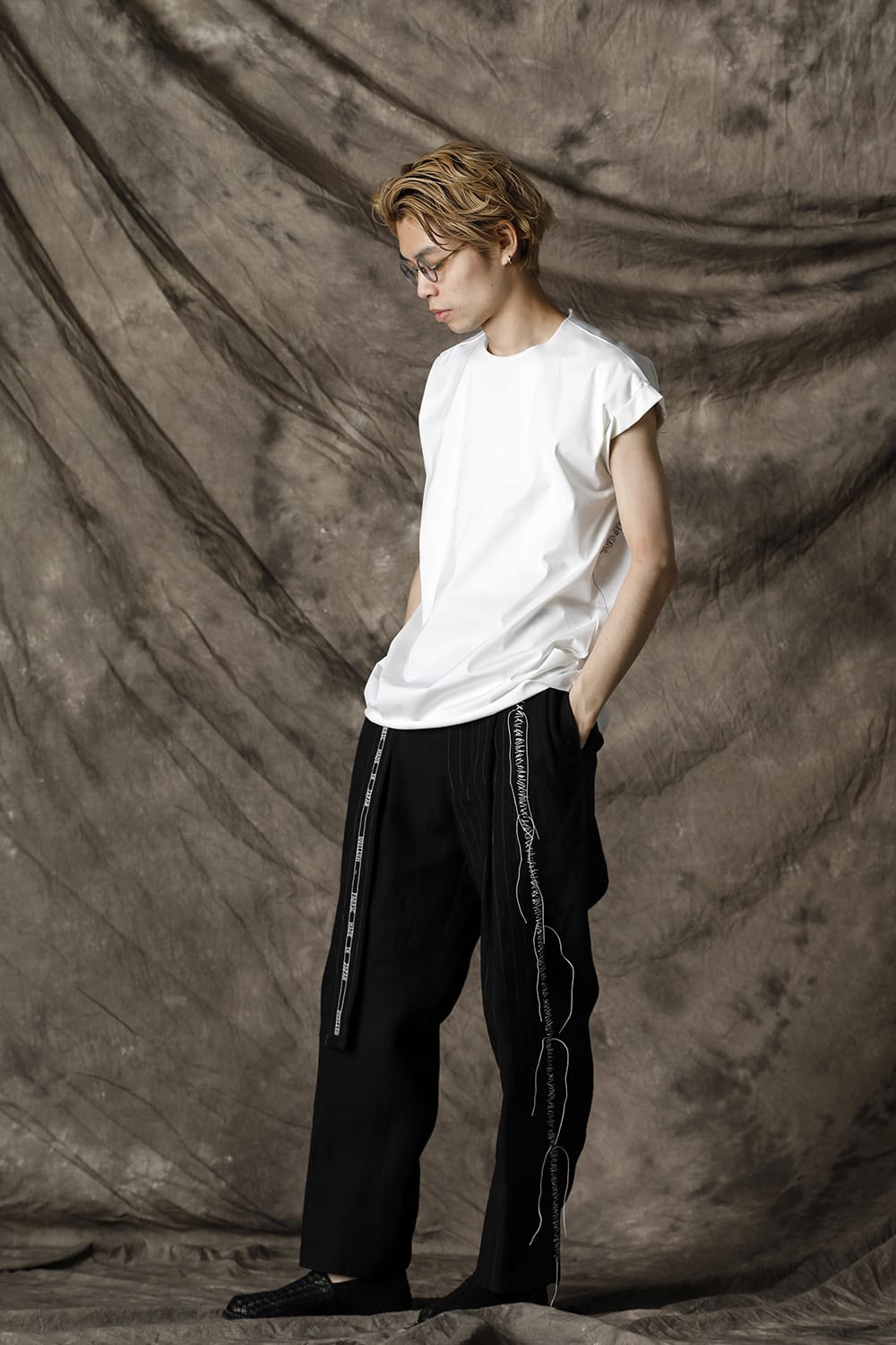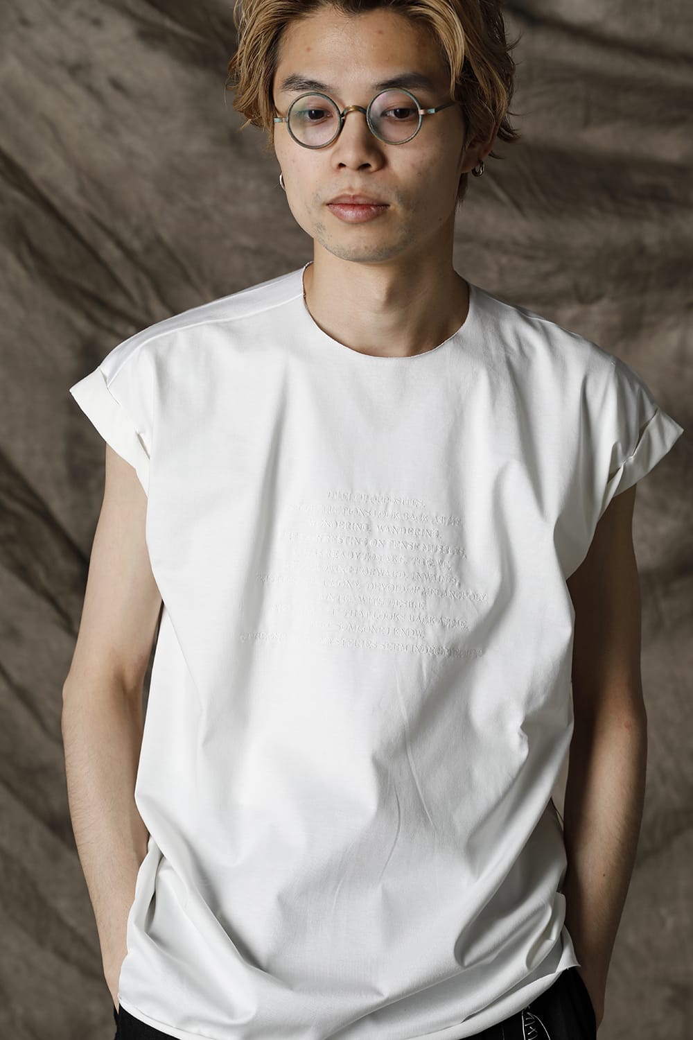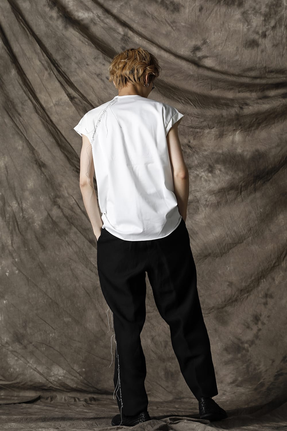 袖をロールさせた状態でキープしたフレンチスリーブTシャツ。 ネックや裾先は断ち切りデザイン。 フロント中央には英字のエンブロイダリーデザインが施されています。 バックネックから左脇下にかけてブランドのシグニチャーデザインであるハンドステッチが施されています。 生地は滑らかですがハリコシのあるコットンジャージー素材です。