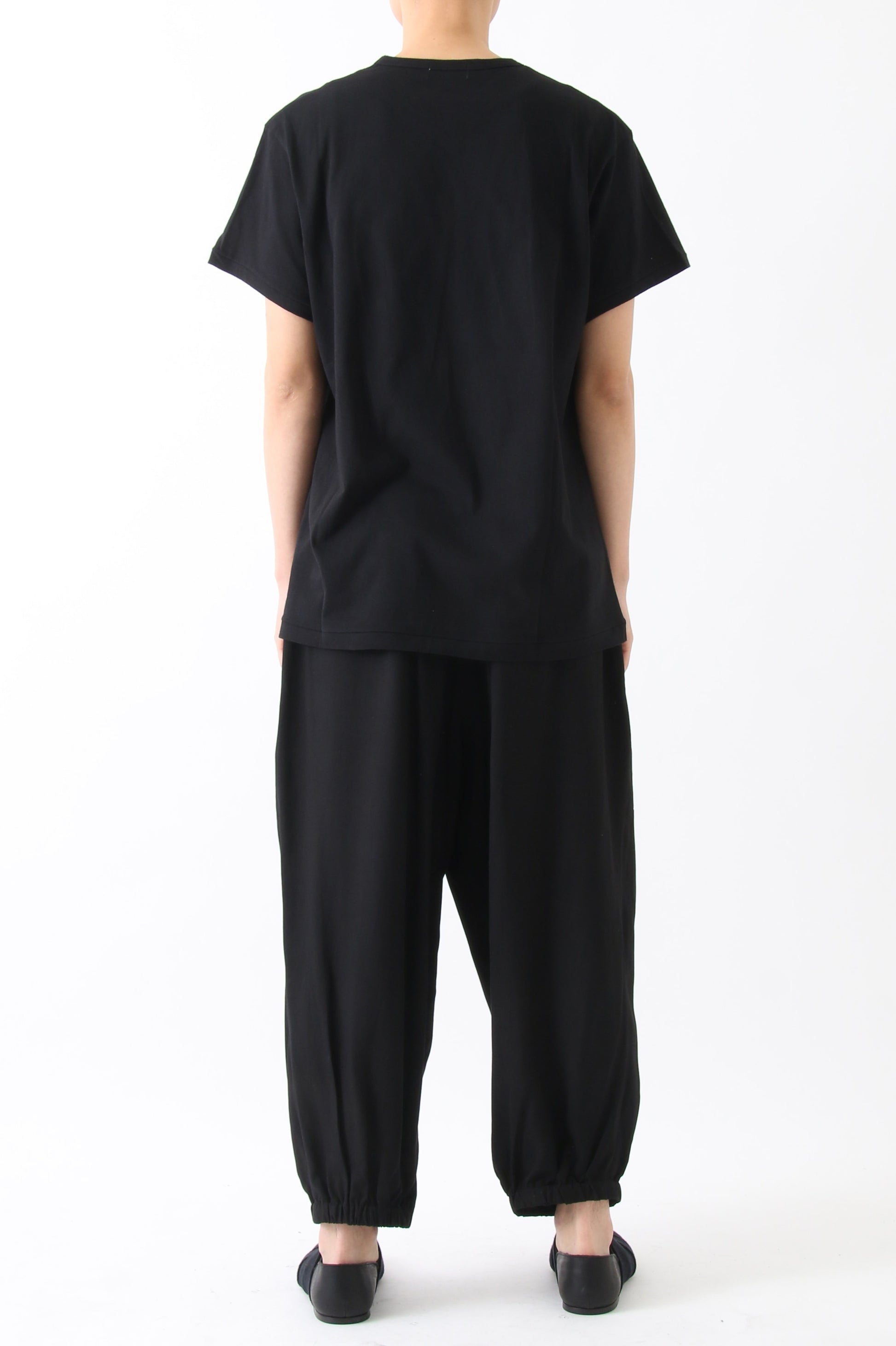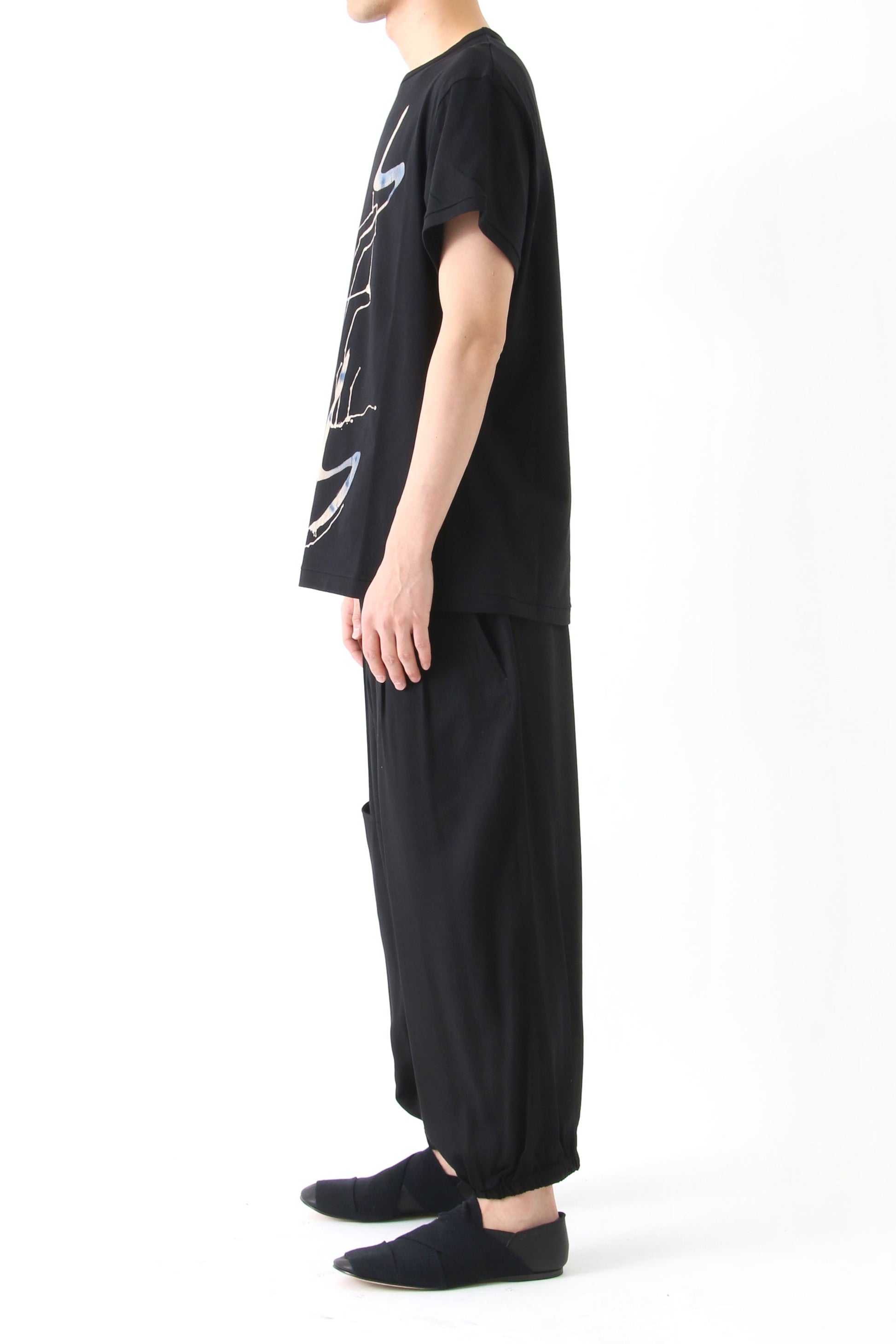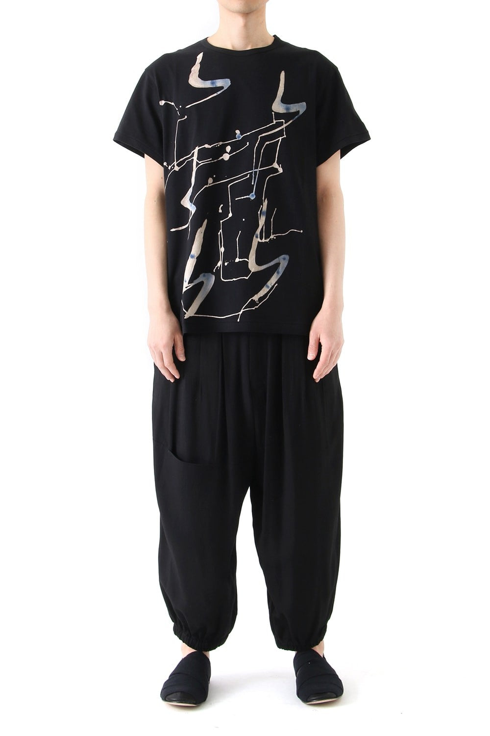 30/1 コーマ糸天竺を使ったボディーは適度なハリと綺麗な目面が特徴。プリントに見える白抜き部分は抜染。青い部分は全て手作業にて顔料を塗り込んでいます。