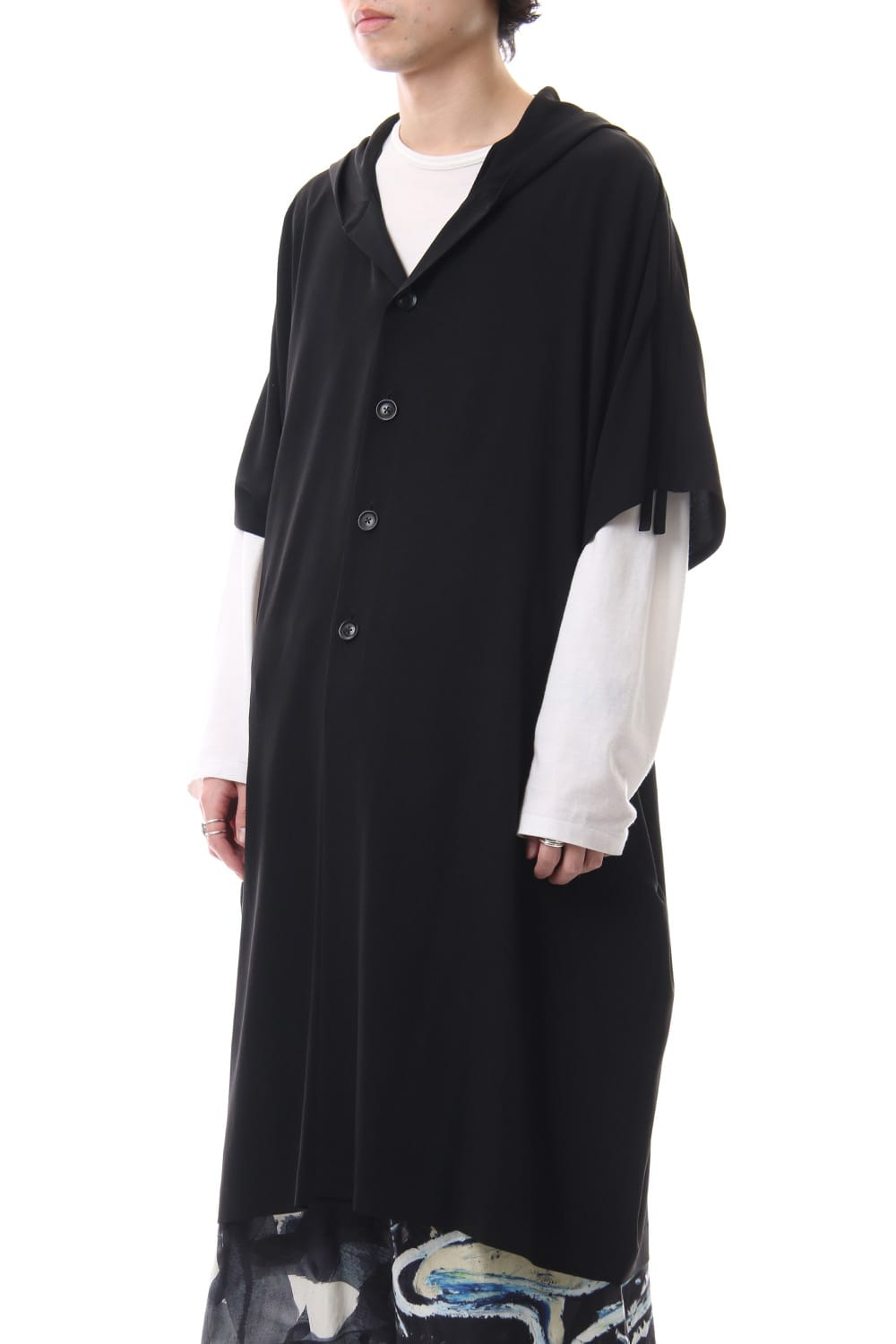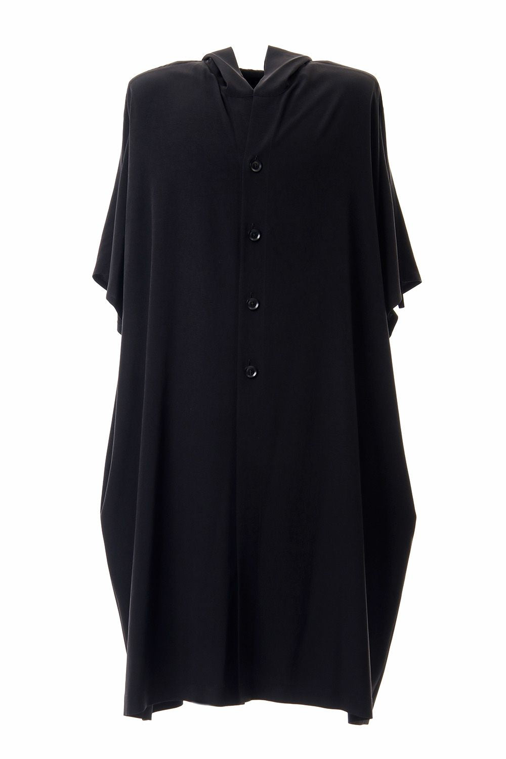 フレンチスリーブのフーデットコート。落ち感の良いトリアセテートとポリエステルのクレープデシンを使用しており、肩が綺麗に馴染みます。袖にはコードが通されており、ギャザーを作ってアレンジして着用することが可能です。