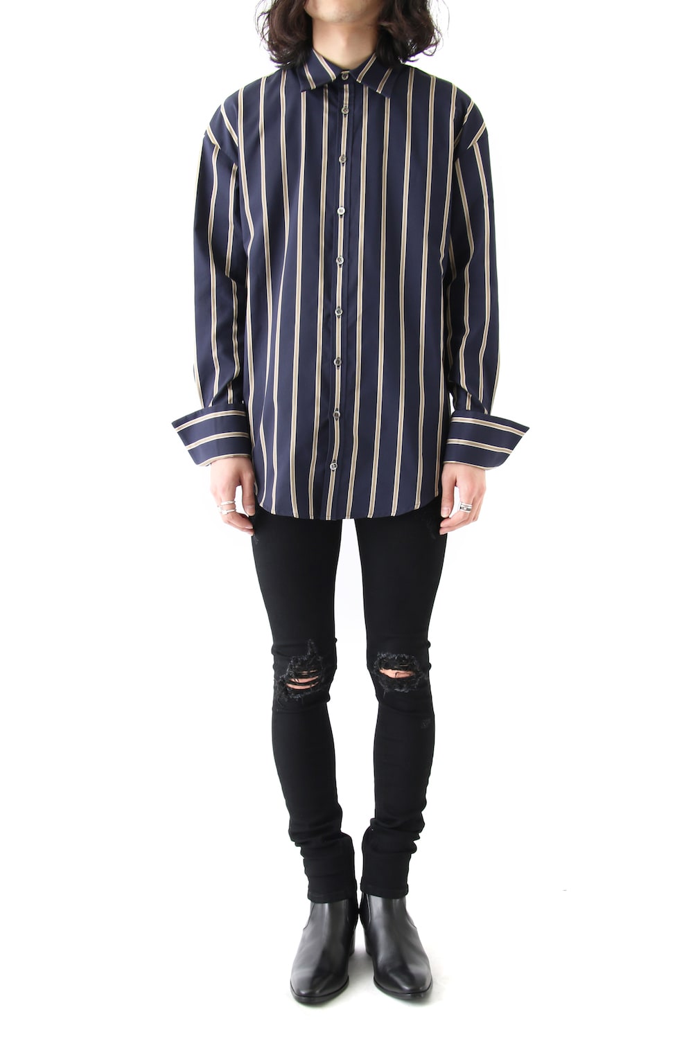 ラインストライプシャツは、あえてルーズなシルエットベースで製作しており