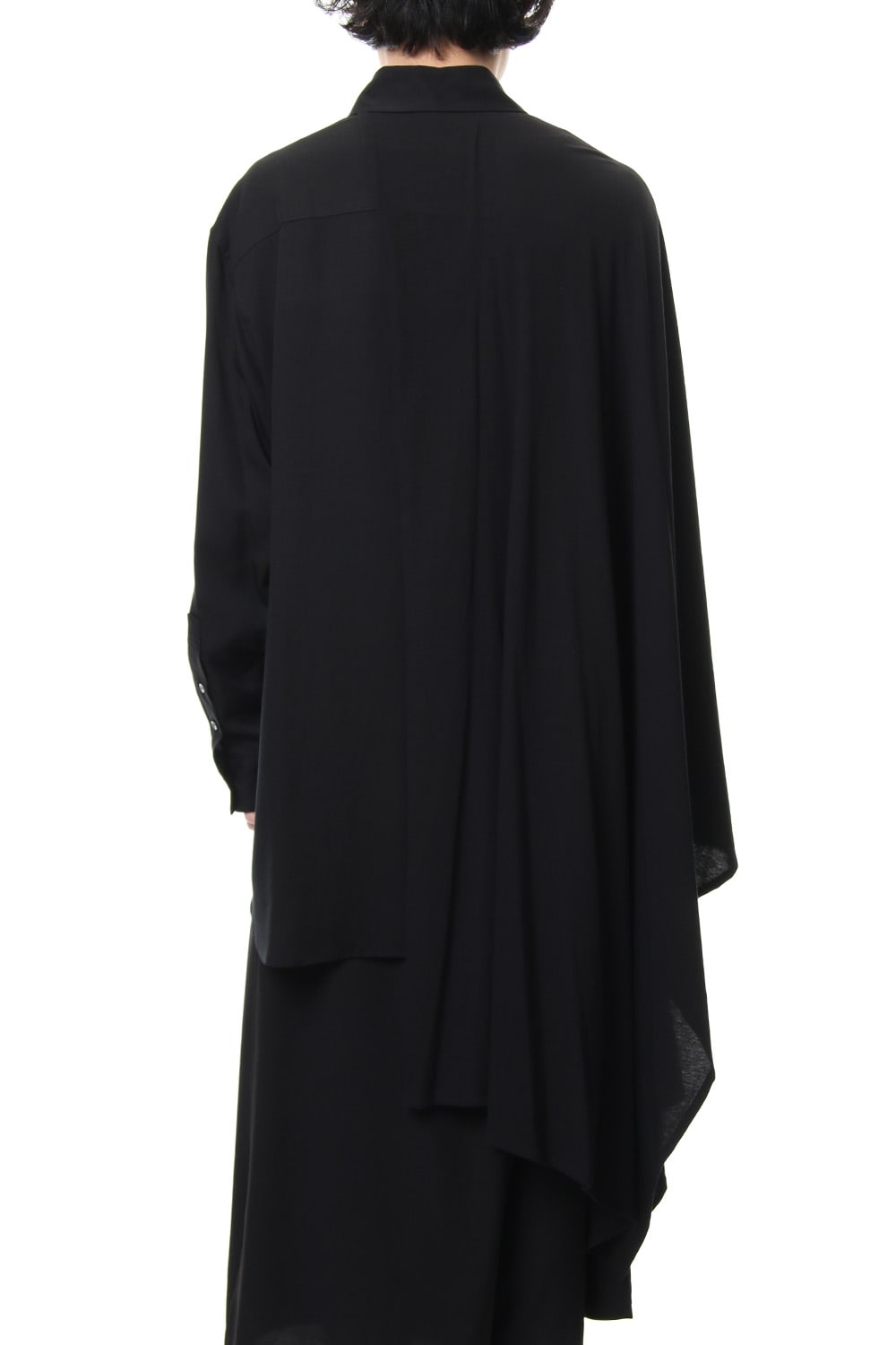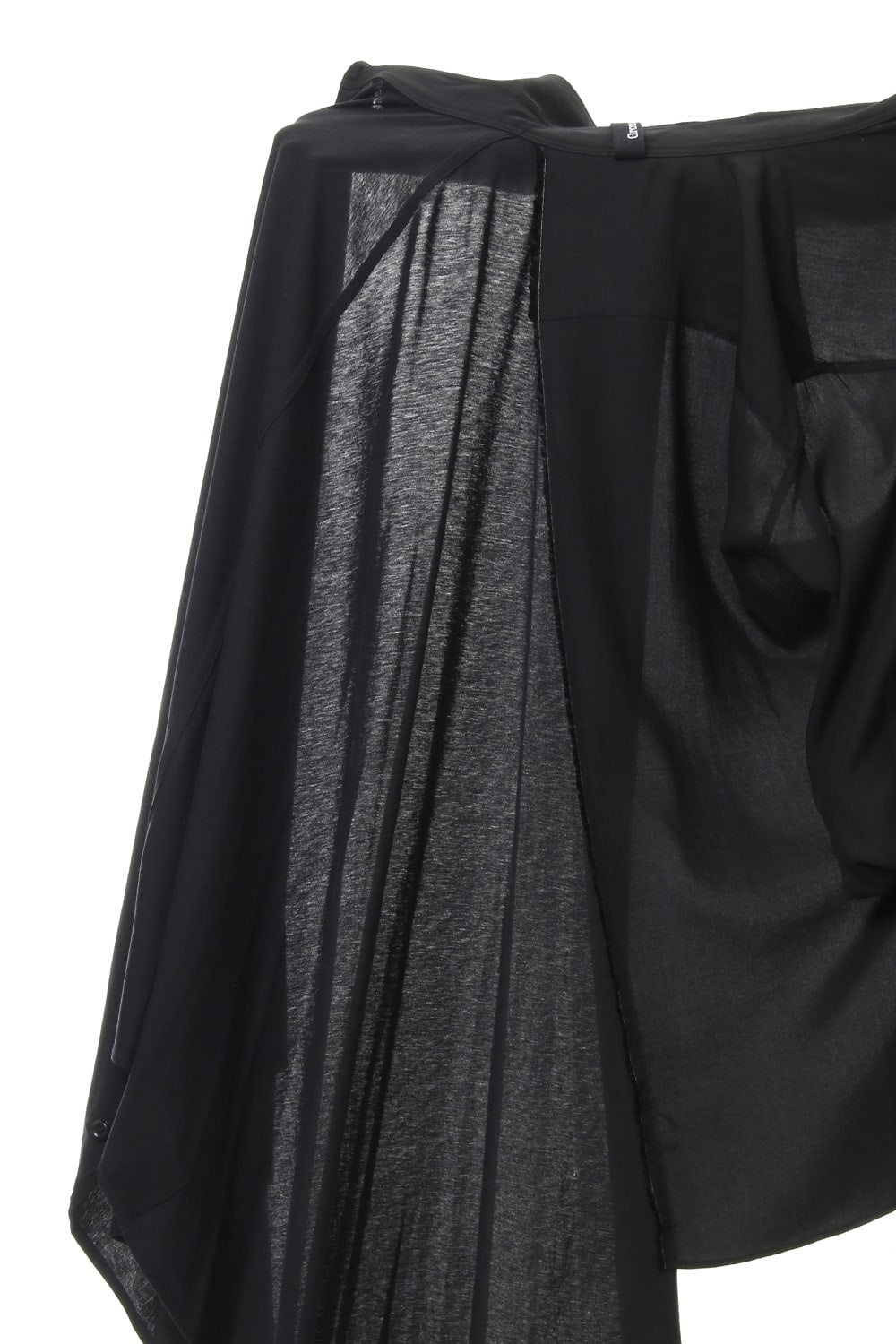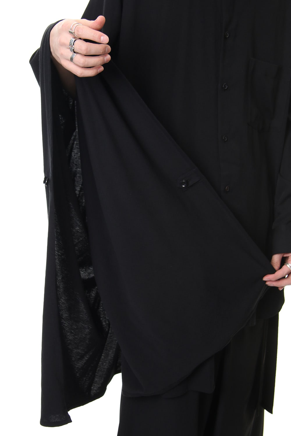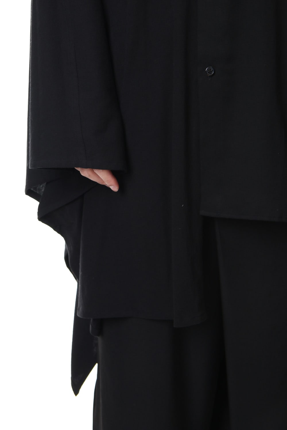 左半身シャツ、右半身マントにし、それぞれ異素材のテンセルとコットン生地を使用しドッキングマントシャツ。