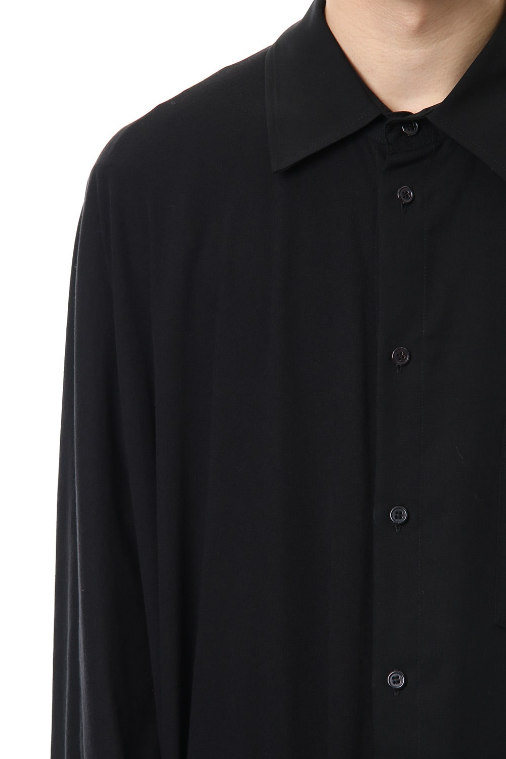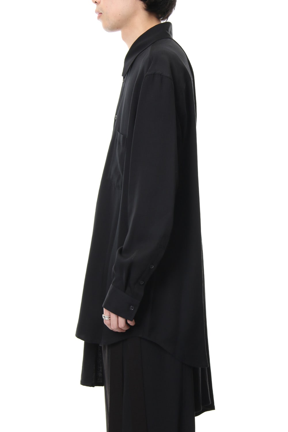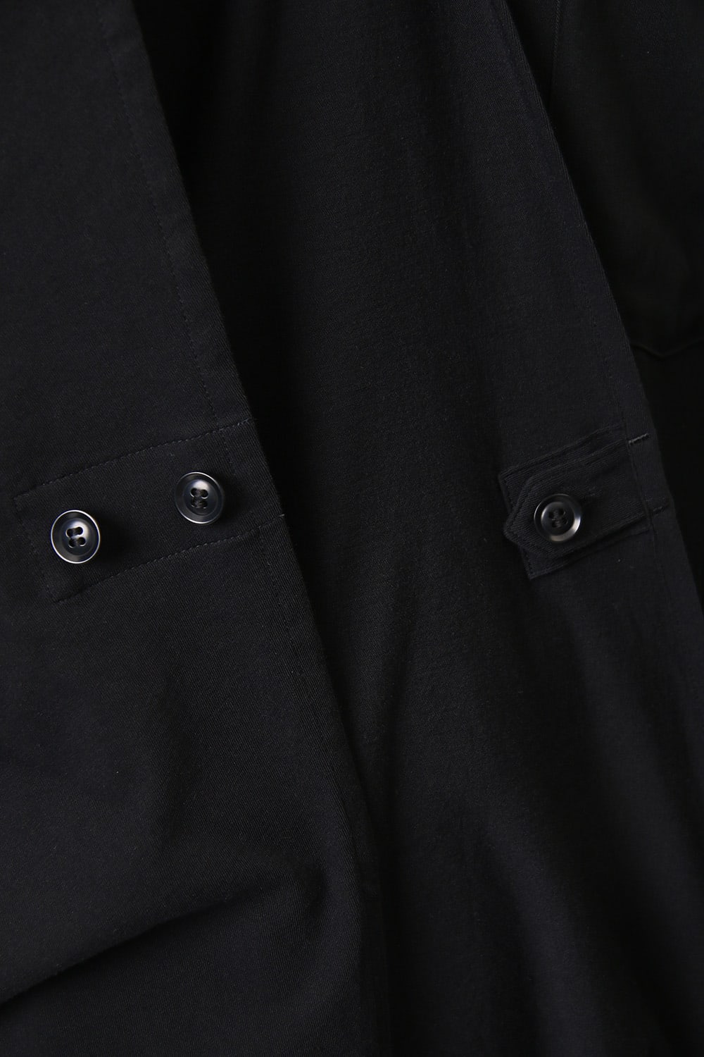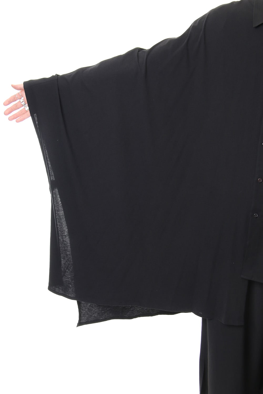 左半身シャツ、右半身マントにし、それぞれ異素材のテンセルとコットン生地を使用しドッキングマントシャツ。