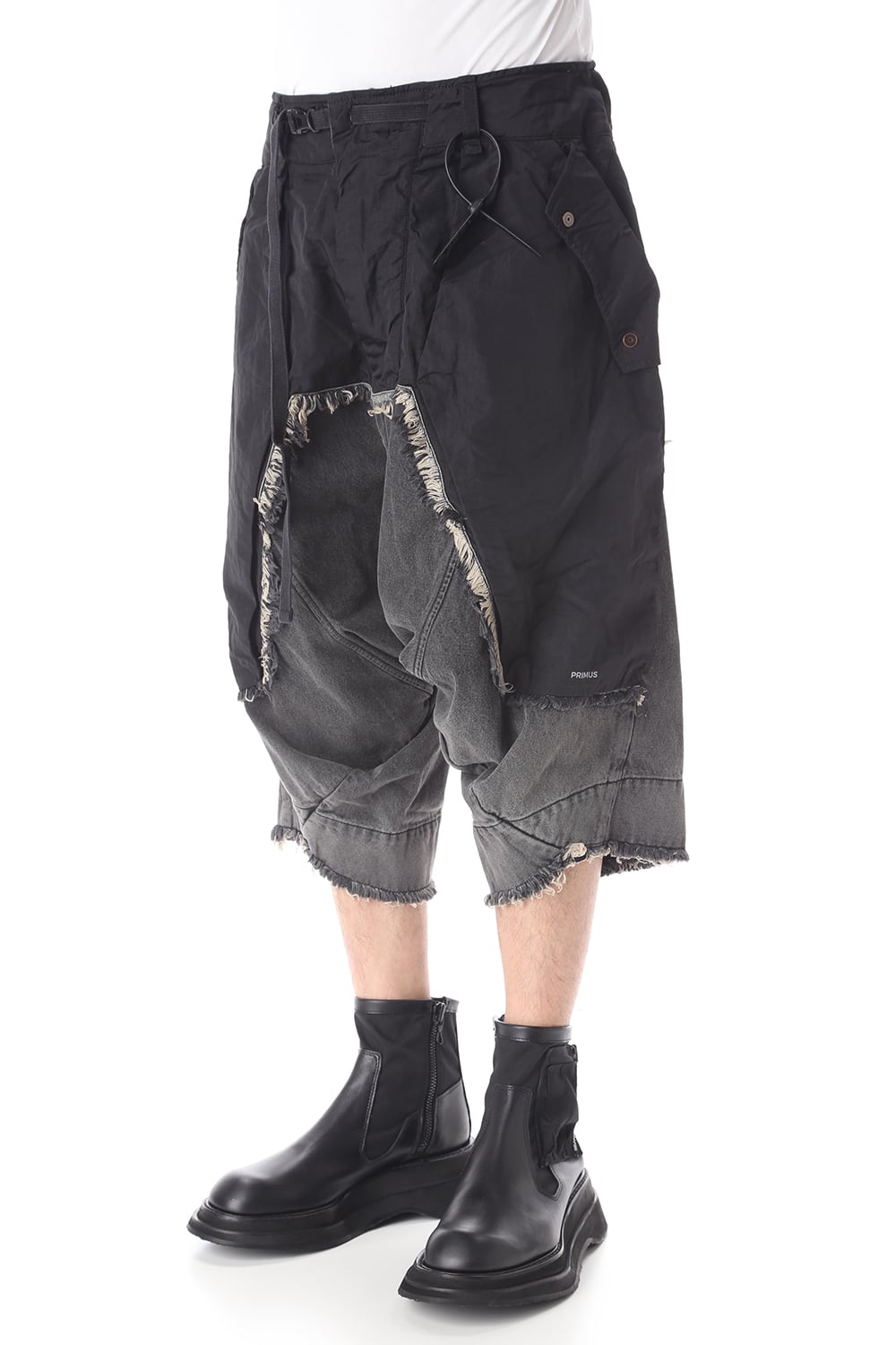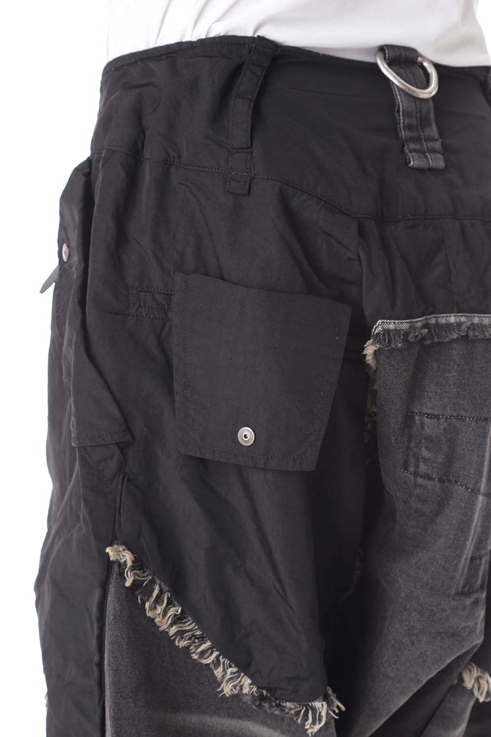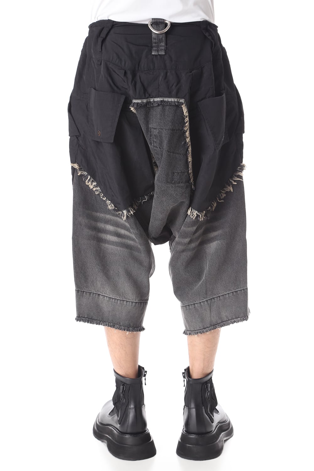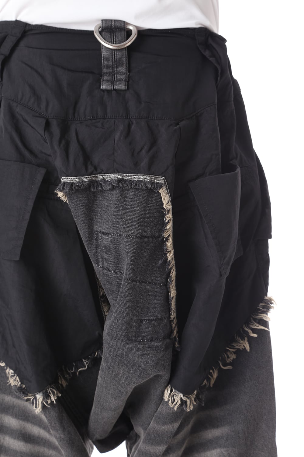 ゆったりとしたサルエルシルエットと素材切替で奇抜なデザインに仕上がっております。