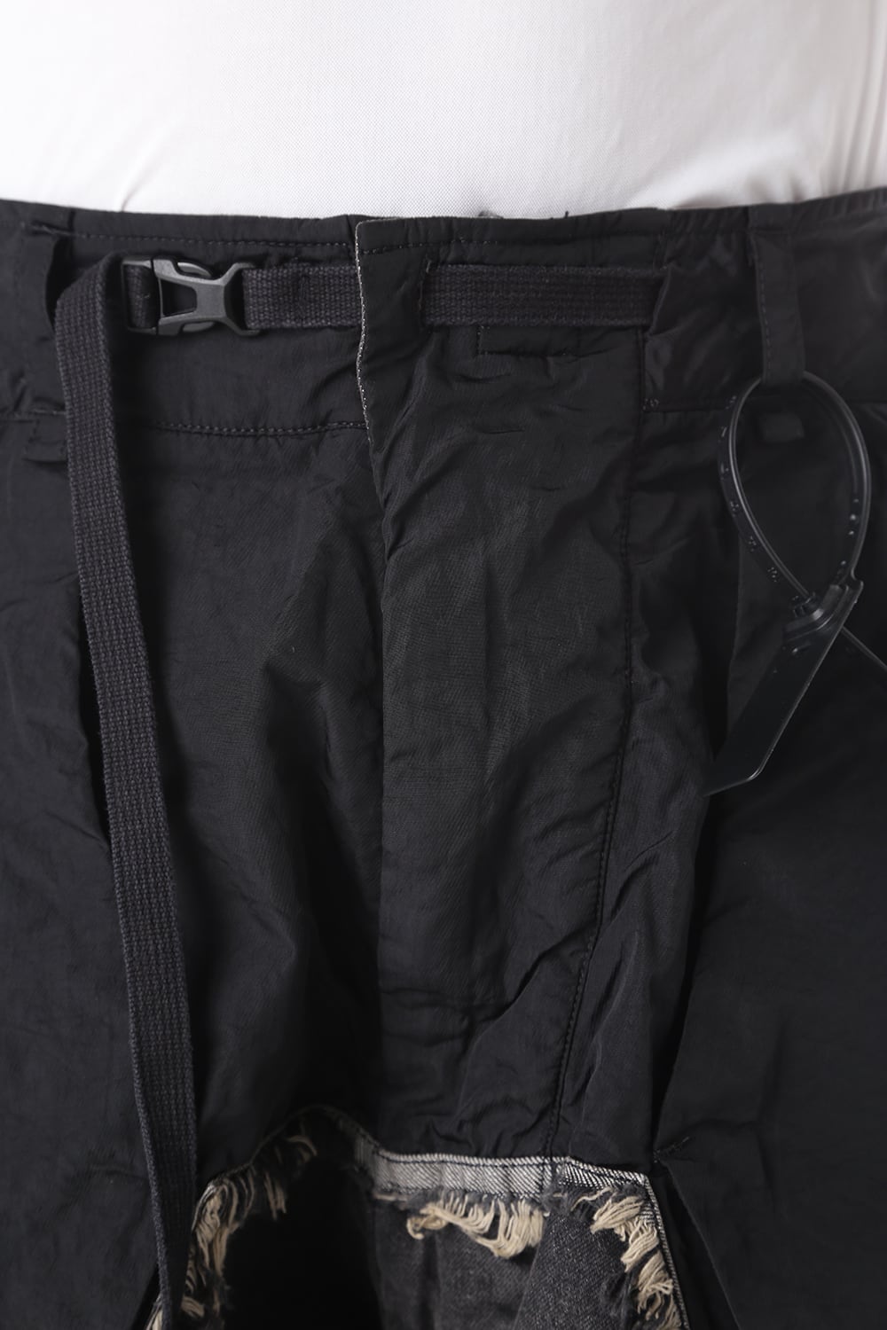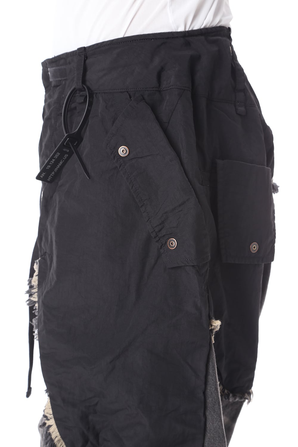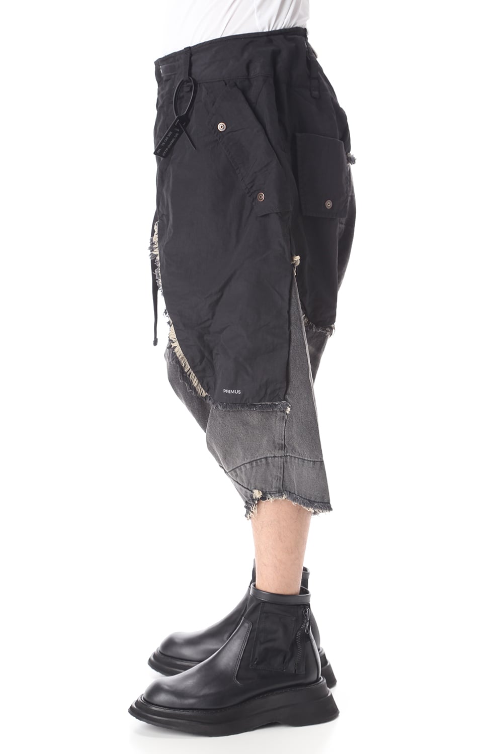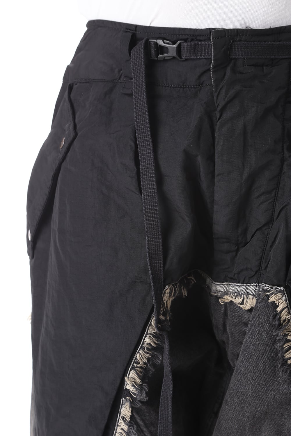 ゆったりとしたサルエルシルエットと素材切替で奇抜なデザインに仕上がっております。