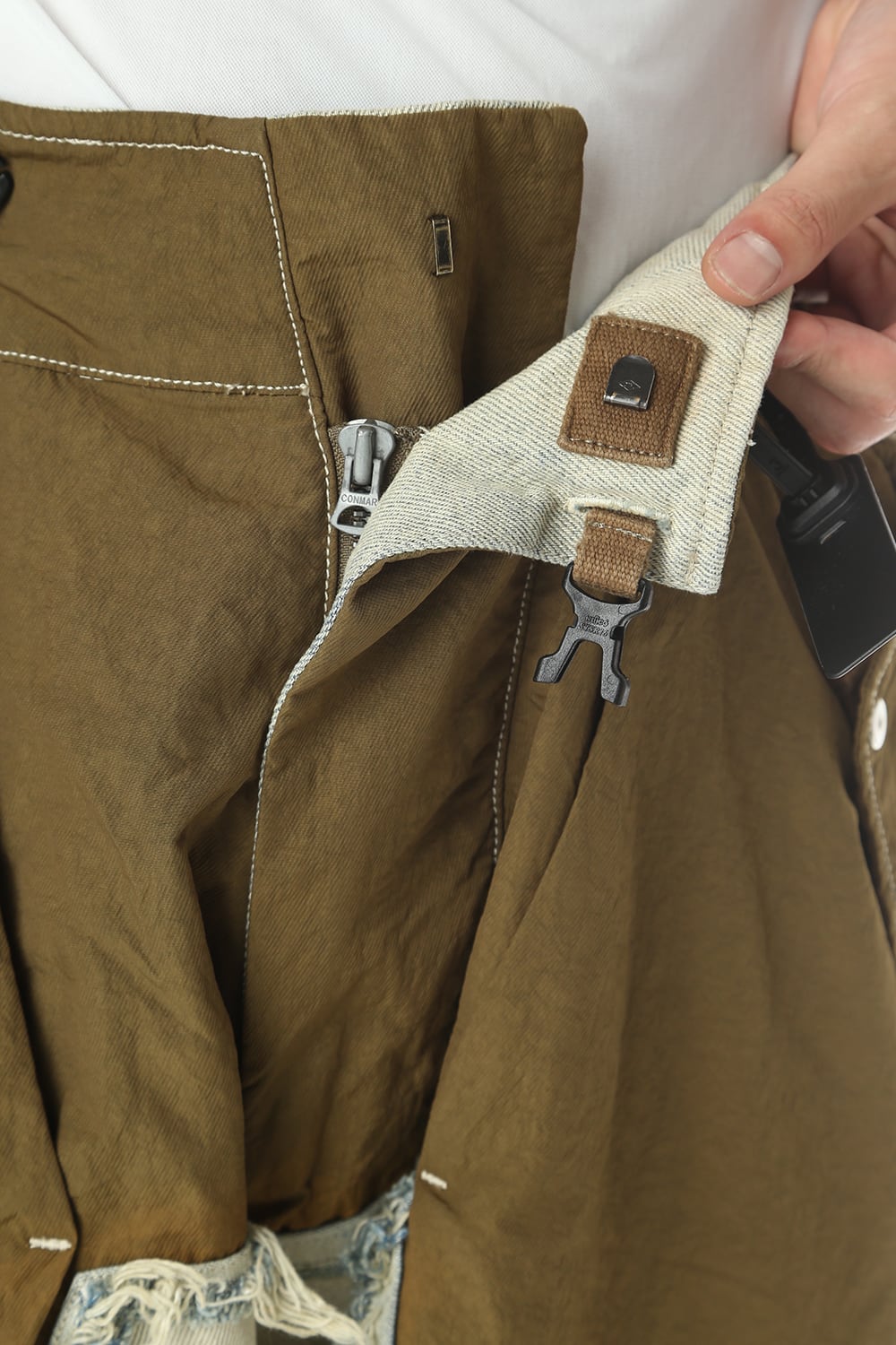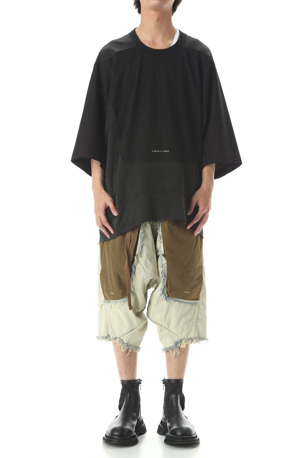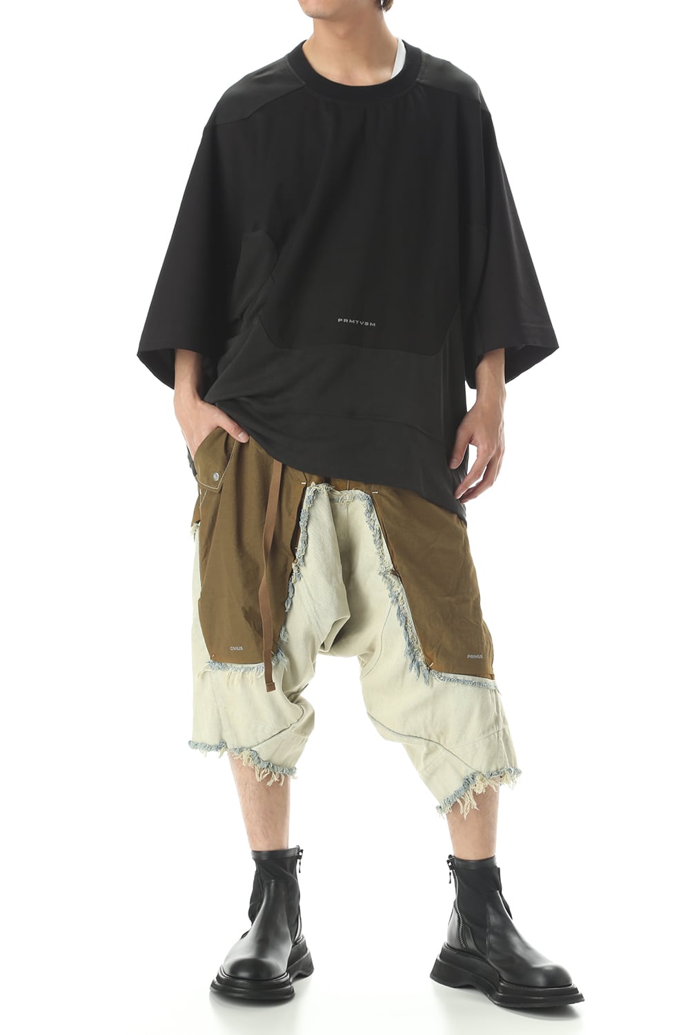 ゆったりとしたサルエルシルエットと素材切替で奇抜なデザインに仕上がっております。