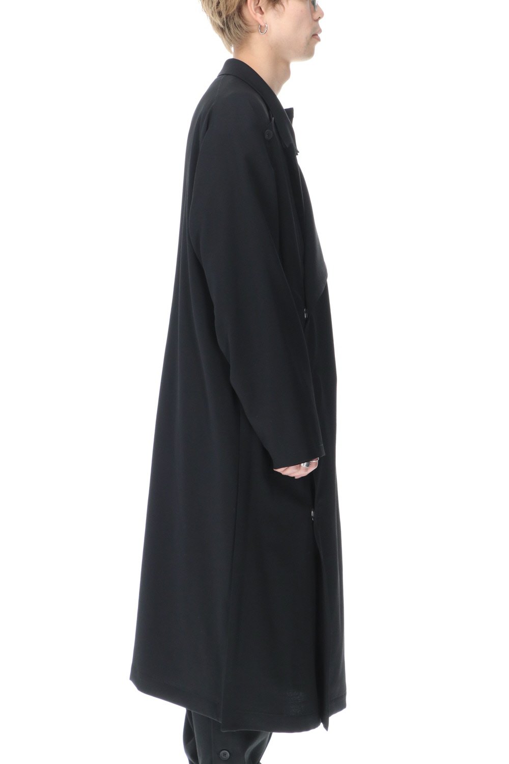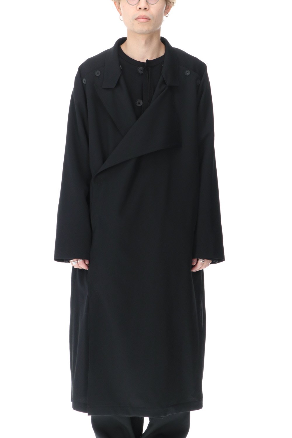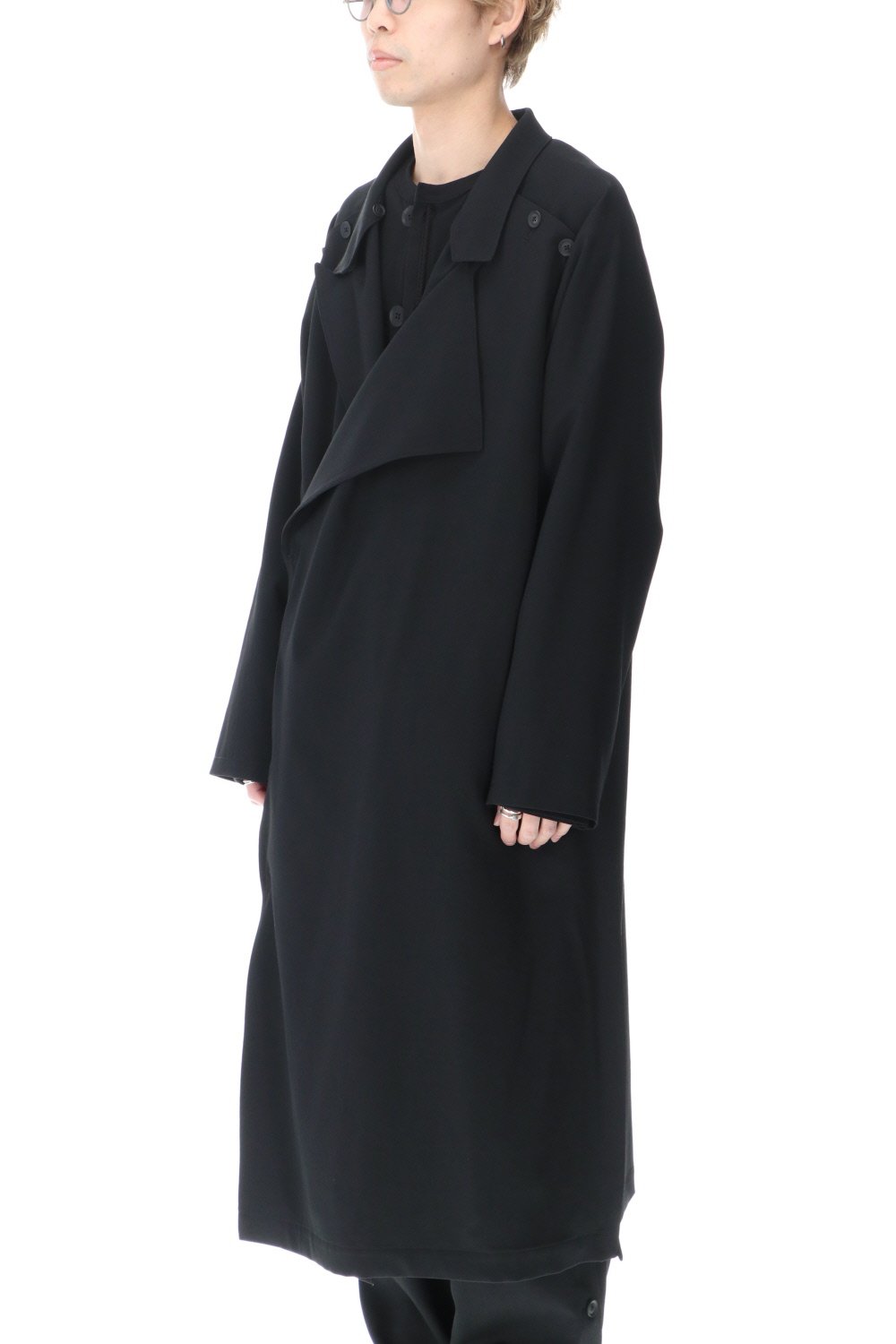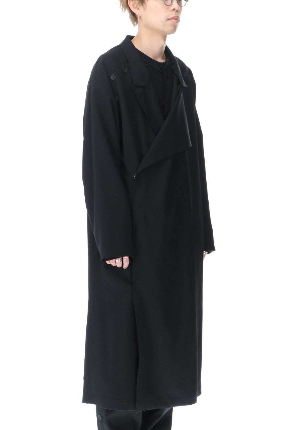 アシンメトリーなフロントデザインが特徴的な変形コート。 ラグランスリーブの前袖部分から脇線を通ってボタン開閉が可能となった自由自在な変形機構が楽しめるデザインコート。 素材は同ブランド定番のウールギャバジンを使用。 分解デザインが目立った今シーズンのコレクションらしいアイコニックなデザインです。