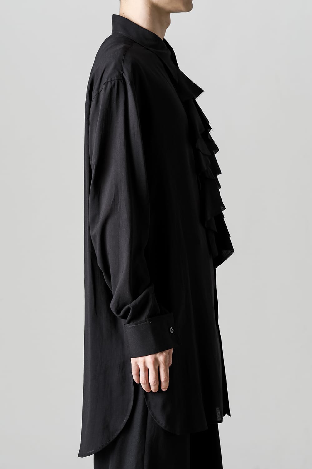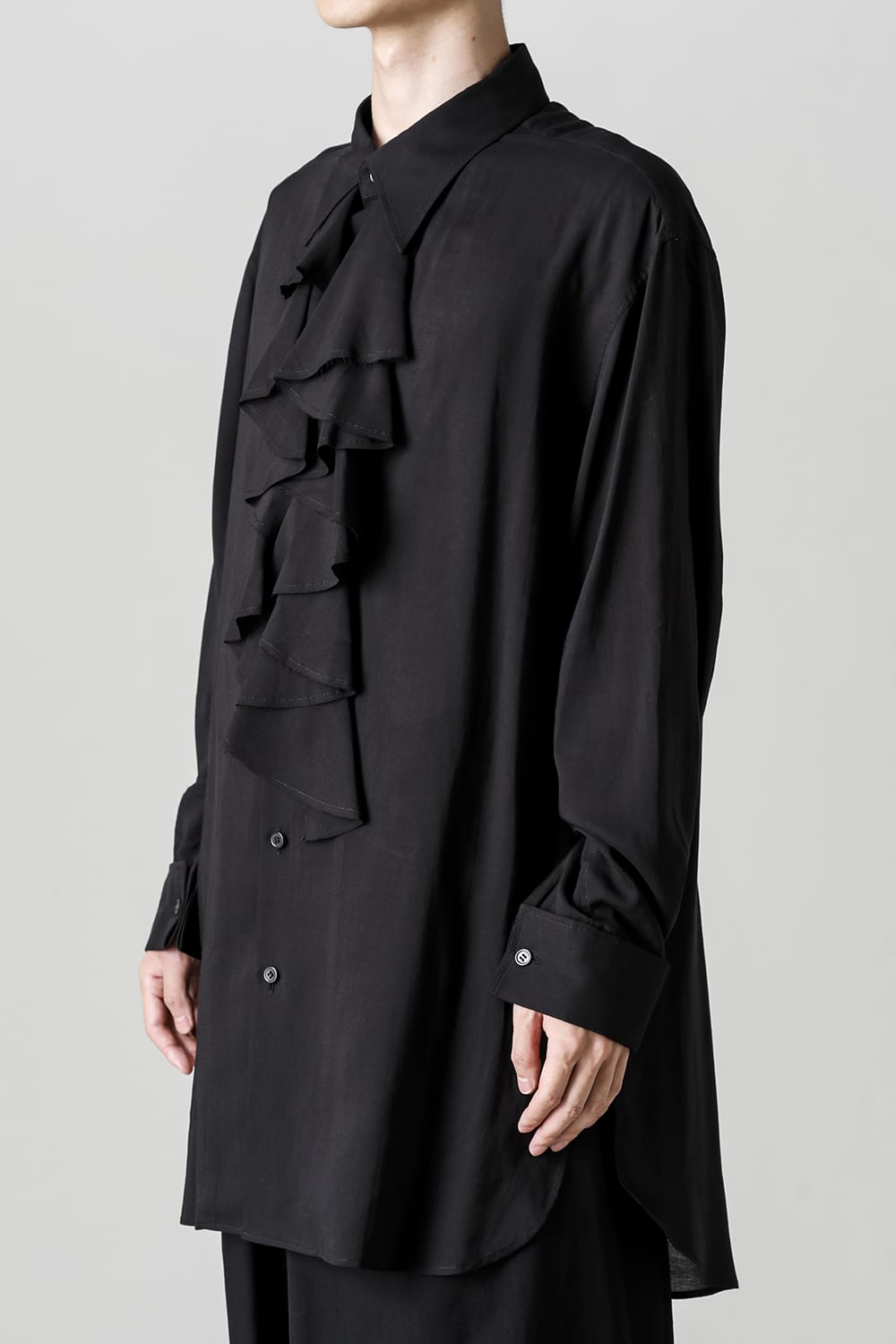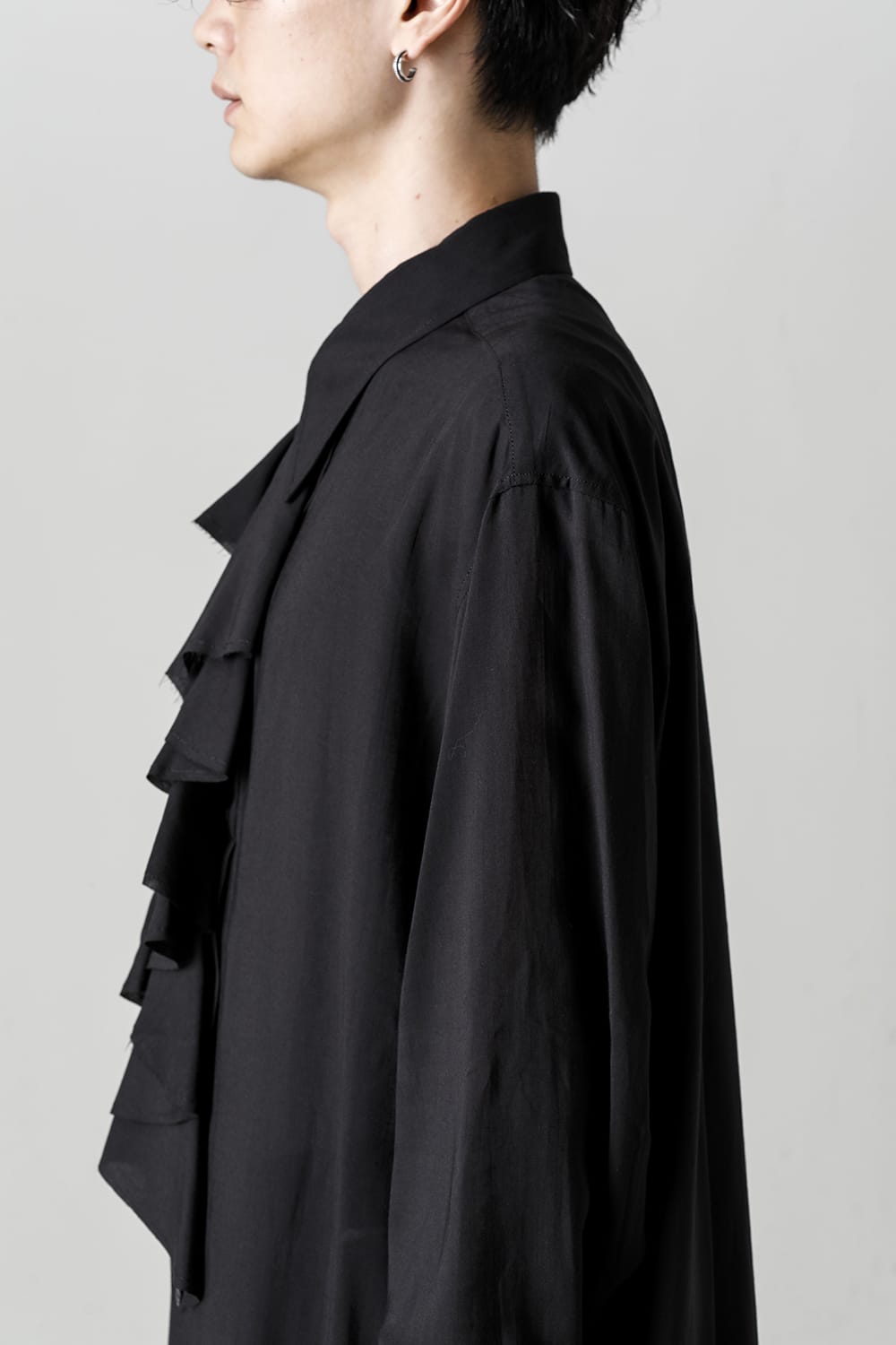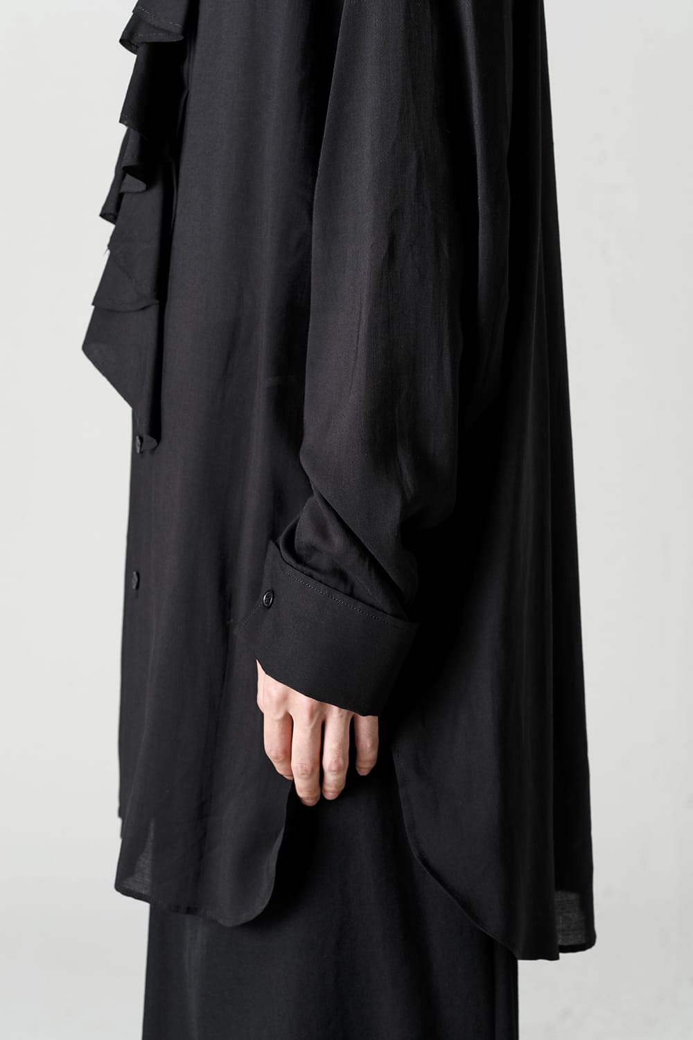 2022-23AWコレクションのLOOK14で使用していた裁ち切りフリルのブラウス。ソフトな風合いと流れるようなドレープ感が軽やかな印象を与えるセルロースのローン生地を使用しています。左右についている非対称の裁ち切りのフリルは取り外し可能で、後前の端にも付け替える事ができるなど、自由にアレンジが可能です。サイドスリットや背面ヨークのギャザー、袖のタッキングなどドレスシャツのディテールを盛り込んだ、エレガントなシャツです。着丈はミドルからロングの中間くらい、生地に落ち間があるので、横の広がりを抑えつつ、ヨウジらしい上品な動きを演出します。肩や身幅にはゆとりを持たせていてたシルエットになっています。
