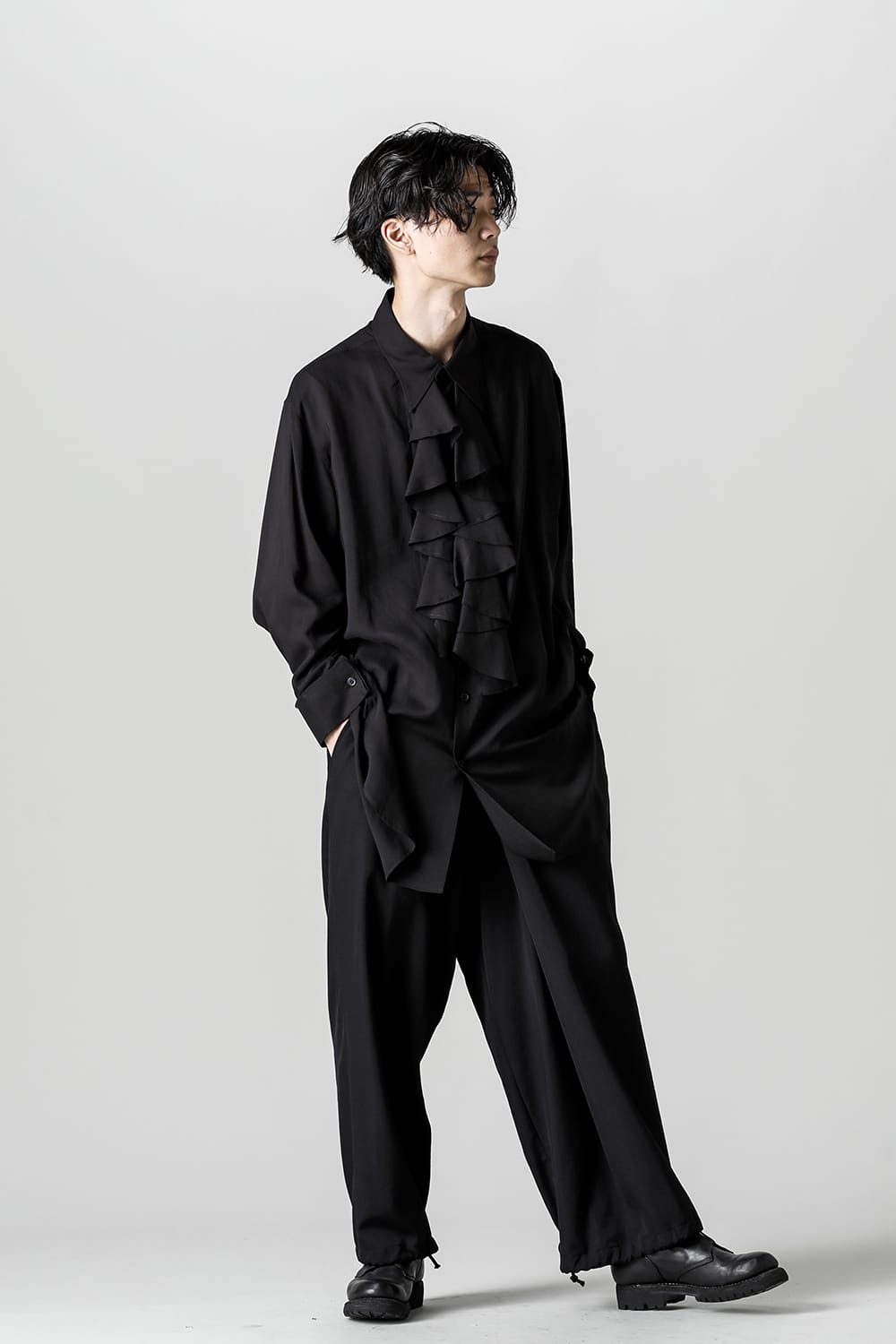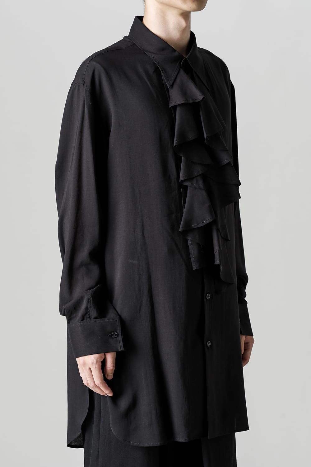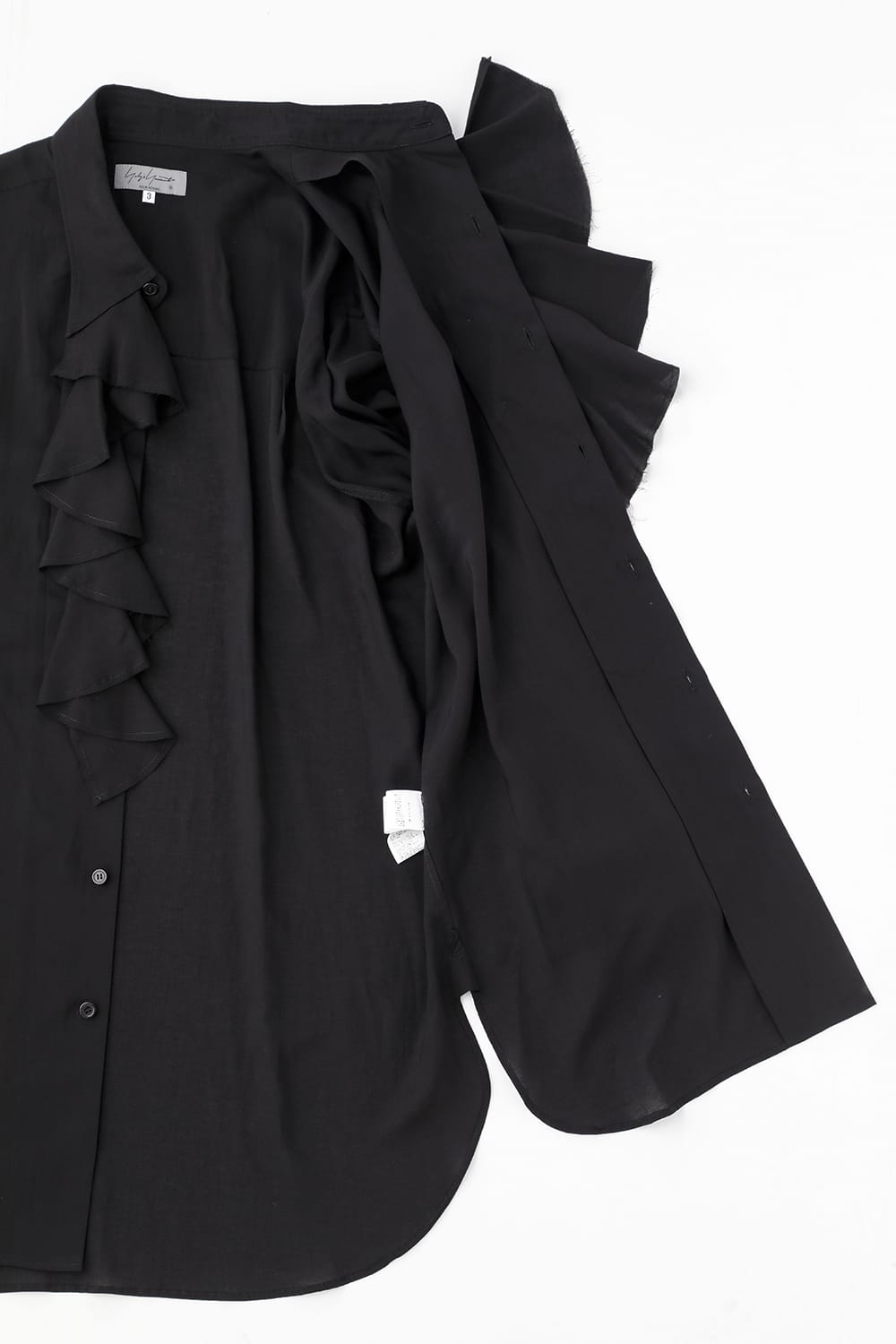 2022-23AWコレクションのLOOK14で使用していた裁ち切りフリルのブラウス。ソフトな風合いと流れるようなドレープ感が軽やかな印象を与えるセルロースのローン生地を使用しています。左右についている非対称の裁ち切りのフリルは取り外し可能で、後前の端にも付け替える事ができるなど、自由にアレンジが可能です。サイドスリットや背面ヨークのギャザー、袖のタッキングなどドレスシャツのディテールを盛り込んだ、エレガントなシャツです。着丈はミドルからロングの中間くらい、生地に落ち間があるので、横の広がりを抑えつつ、ヨウジらしい上品な動きを演出します。肩や身幅にはゆとりを持たせていてたシルエットになっています。