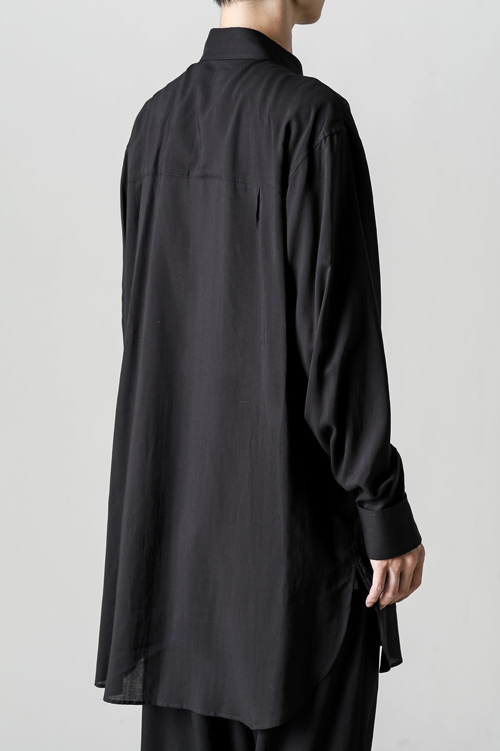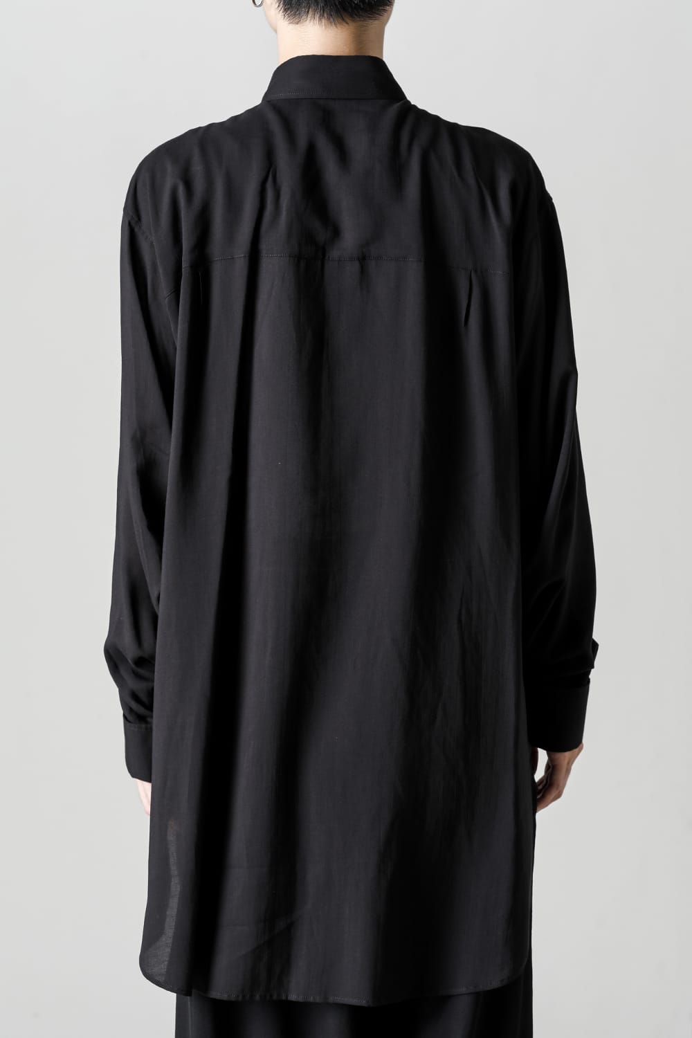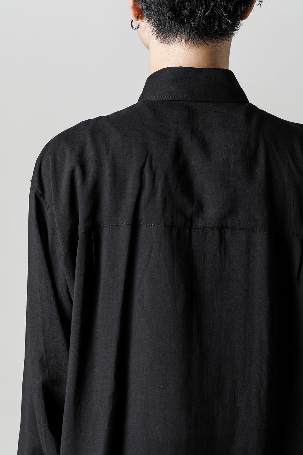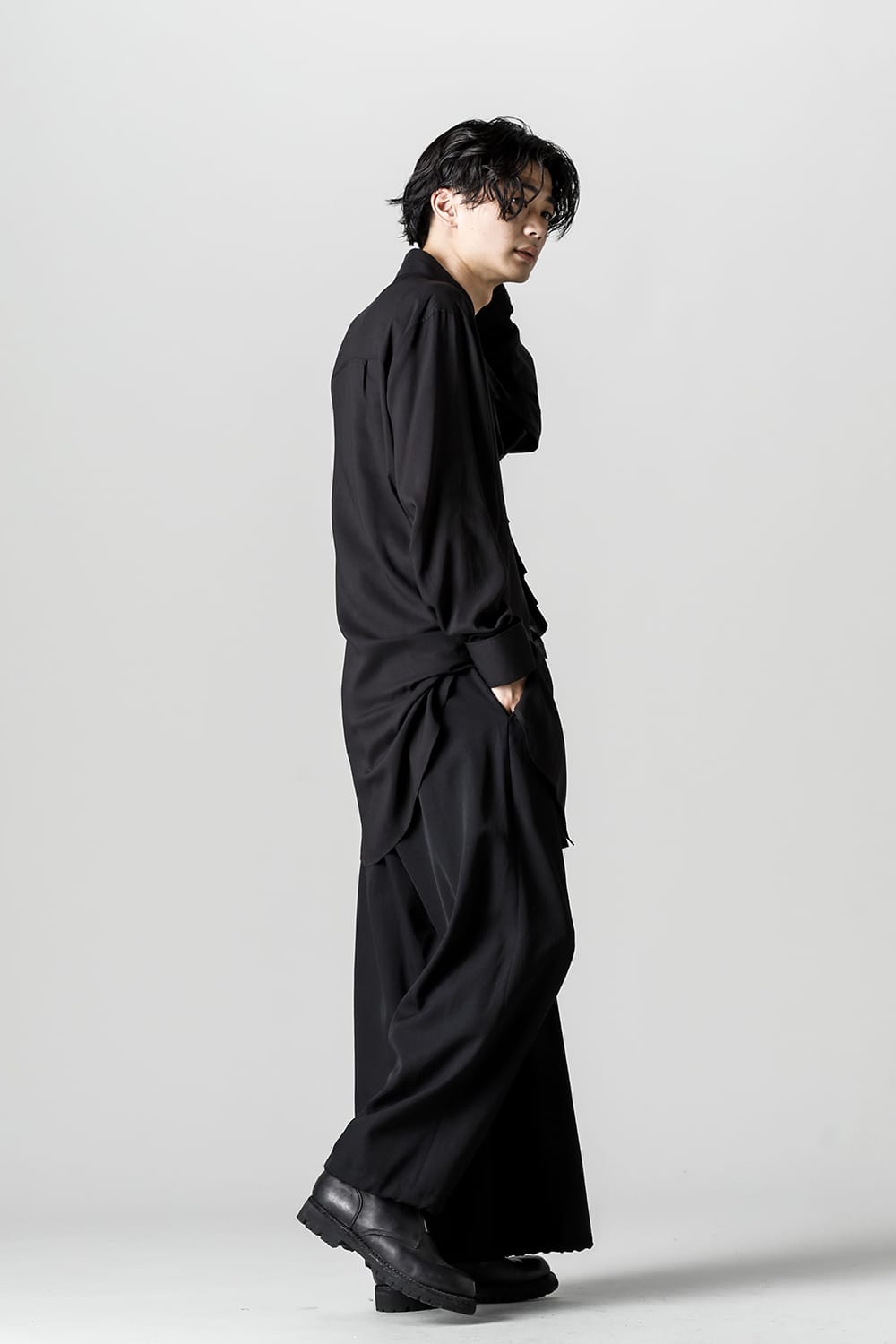2022-23AWコレクションのLOOK14で使用していた裁ち切りフリルのブラウス。ソフトな風合いと流れるようなドレープ感が軽やかな印象を与えるセルロースのローン生地を使用しています。左右についている非対称の裁ち切りのフリルは取り外し可能で、後前の端にも付け替える事ができるなど、自由にアレンジが可能です。サイドスリットや背面ヨークのギャザー、袖のタッキングなどドレスシャツのディテールを盛り込んだ、エレガントなシャツです。着丈はミドルからロングの中間くらい、生地に落ち間があるので、横の広がりを抑えつつ、ヨウジらしい上品な動きを演出します。肩や身幅にはゆとりを持たせていてたシルエットになっています。